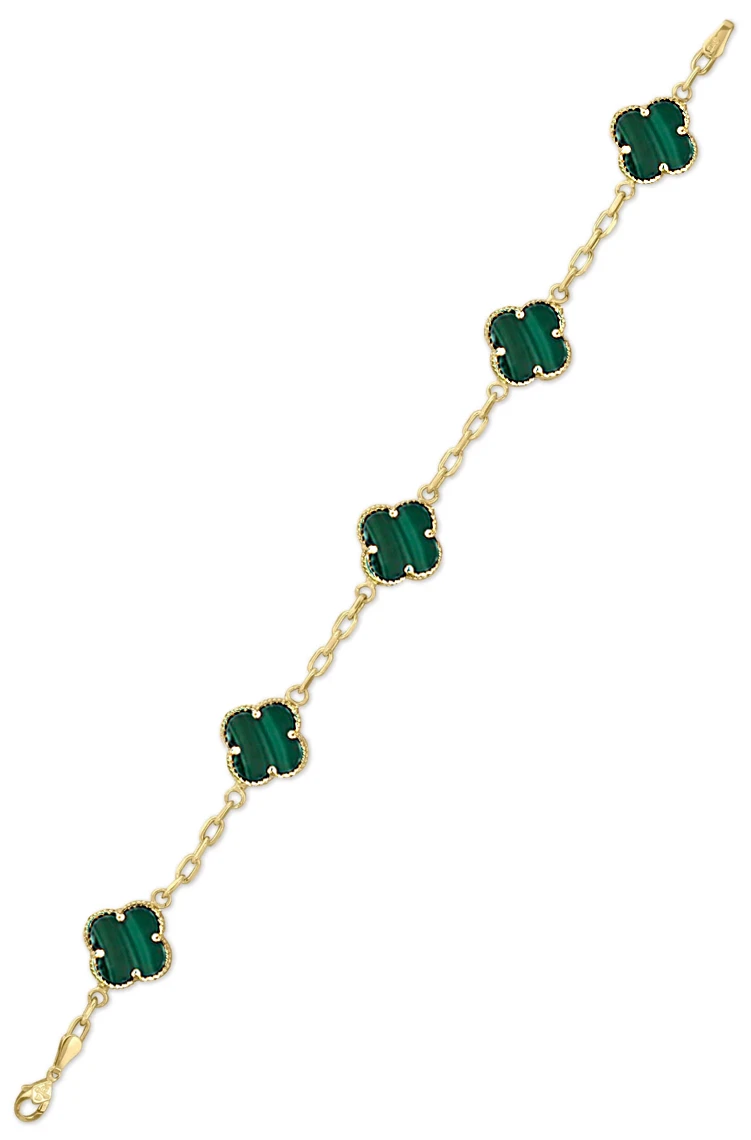 6.30 Gram Ağırlığında 18 Cm Yonca Malakit Yeşil Taşlı Parçalardan Tasarlanmış Şık Bir Tarzı Olan 14 Ayar Altın Tasarım Bileklik.