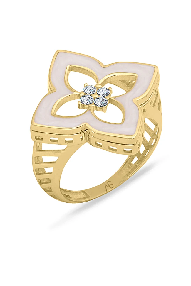 14 ayar sarı altın günlük kullanıma uygun 3.70 gram ağırlığında beyaz sedef mine detaylı coin yonca tasarım spor yüzük.