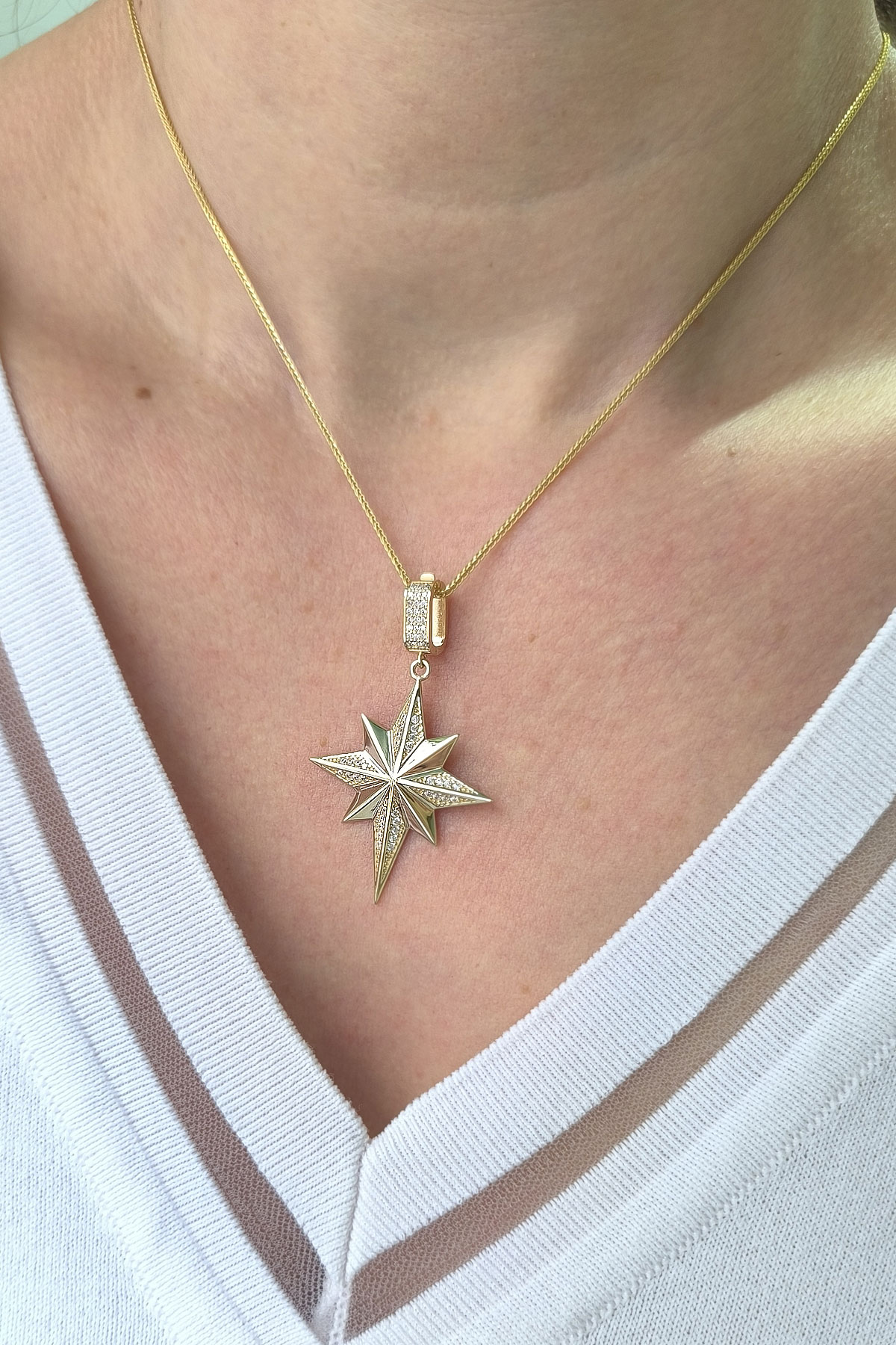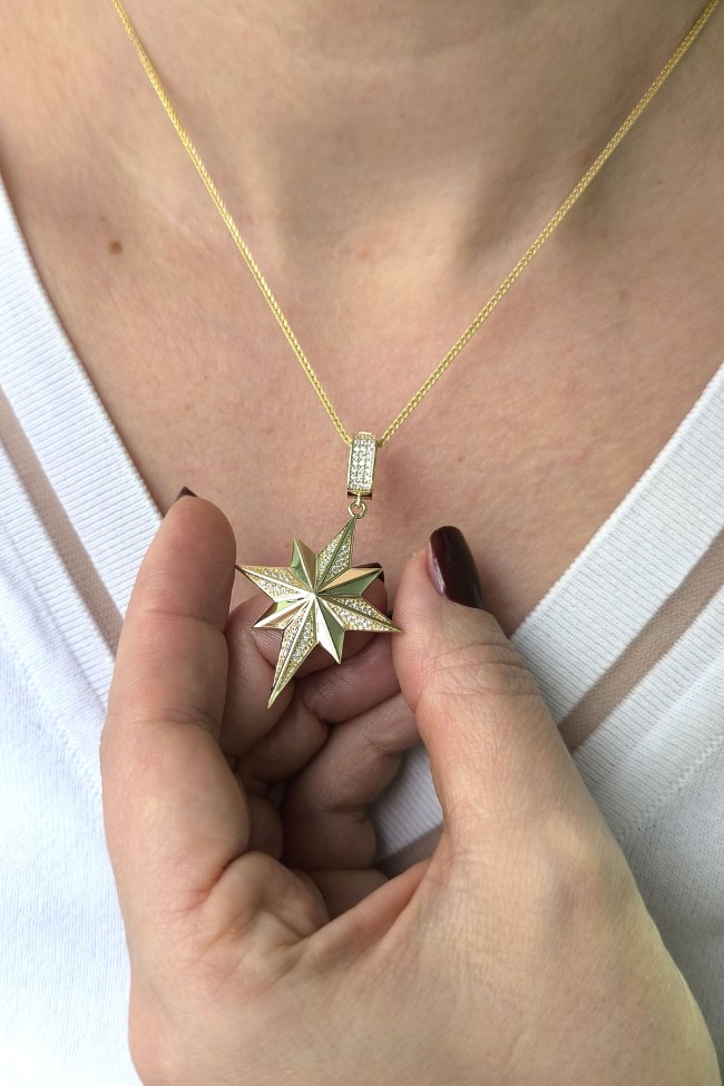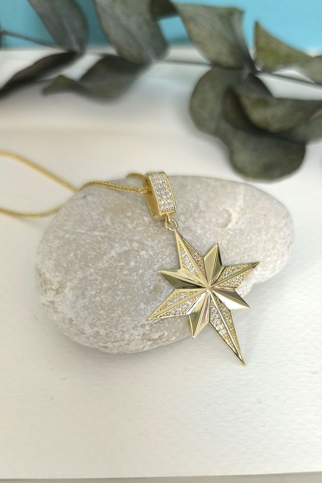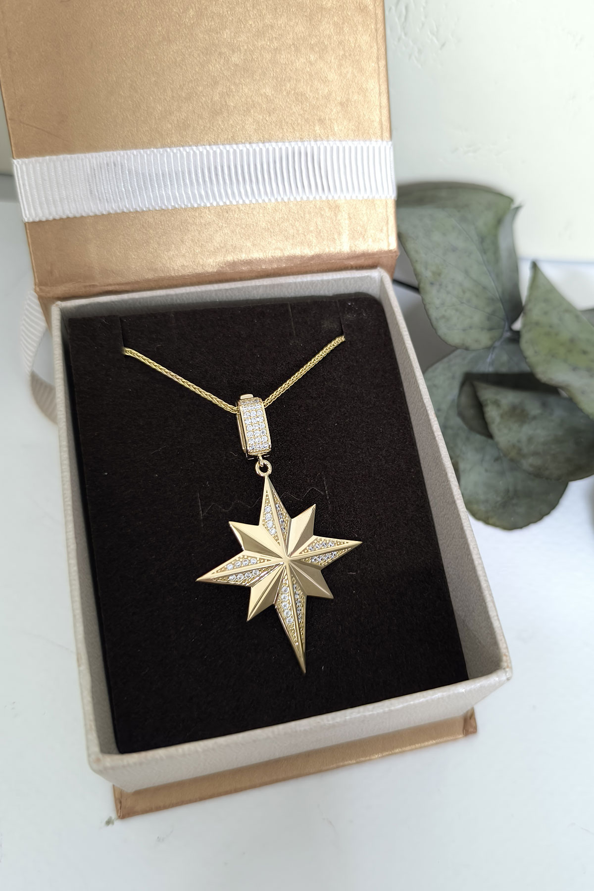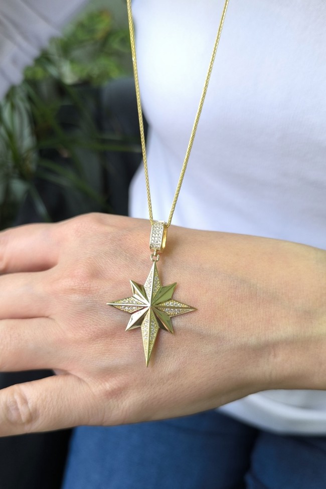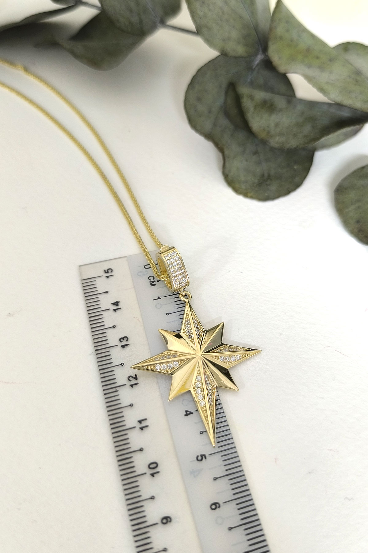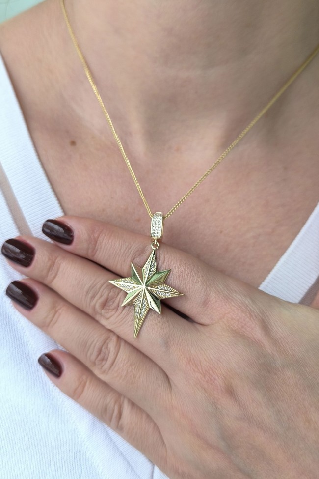 7.30 gr. 5 cm boyutunda zirkon taşlı model 14 ayar altın kuzey yıldızı charm kilit kolye. Farklı kolyelerinizle bir arada kombine olarak kullanabileceğiniz harika ve gösterişli bir model.