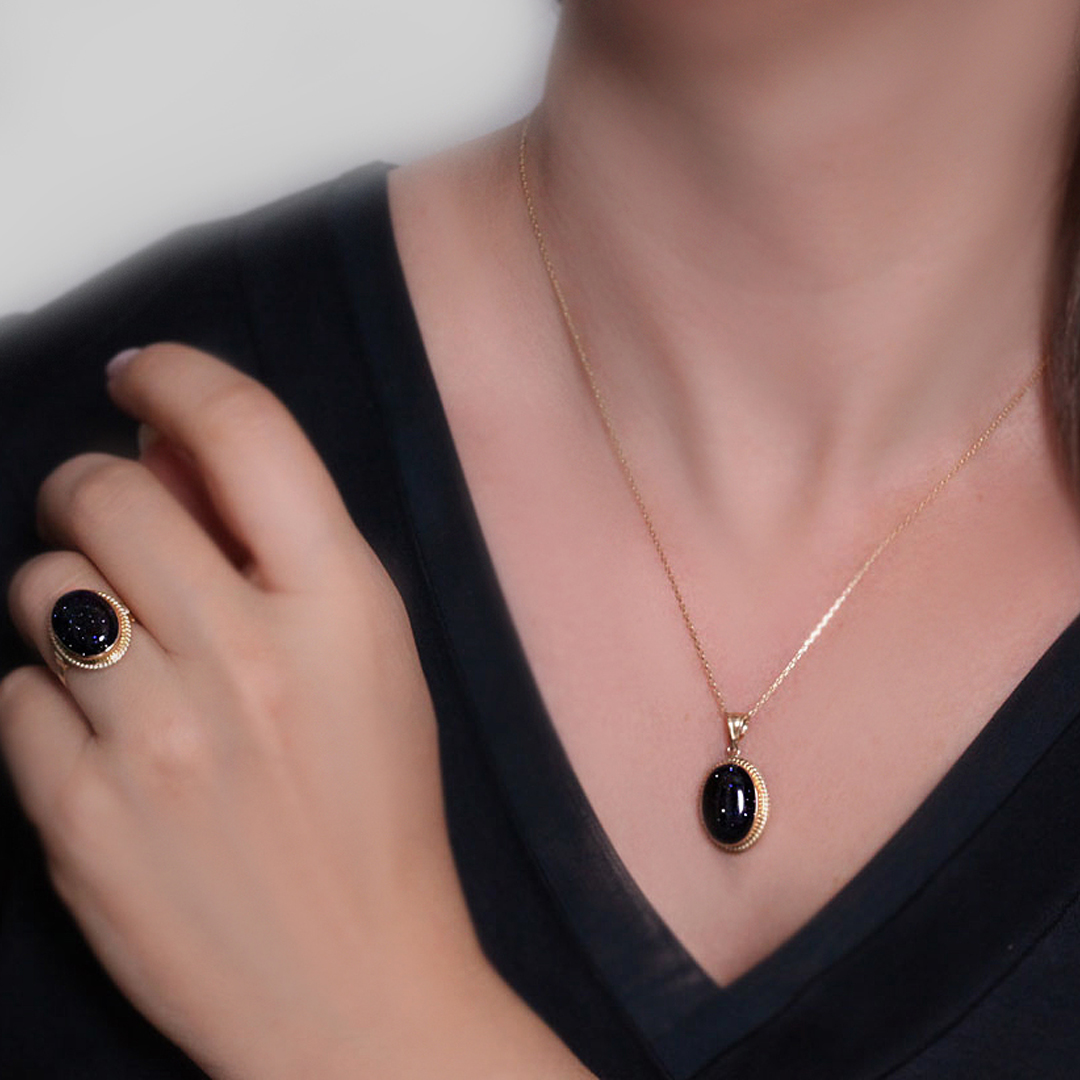 14 Ayar nostalji tasarımına eşlik eden simli büyük oval boy onix taş detaylı şık ve ışıltılı tasarımlara düşkün kadınların severek kullanacakları elegan duruşa sahip günlük kullanıma uygun 8.95 gram ağırlığında altın kolye ve küpe ikili takım.