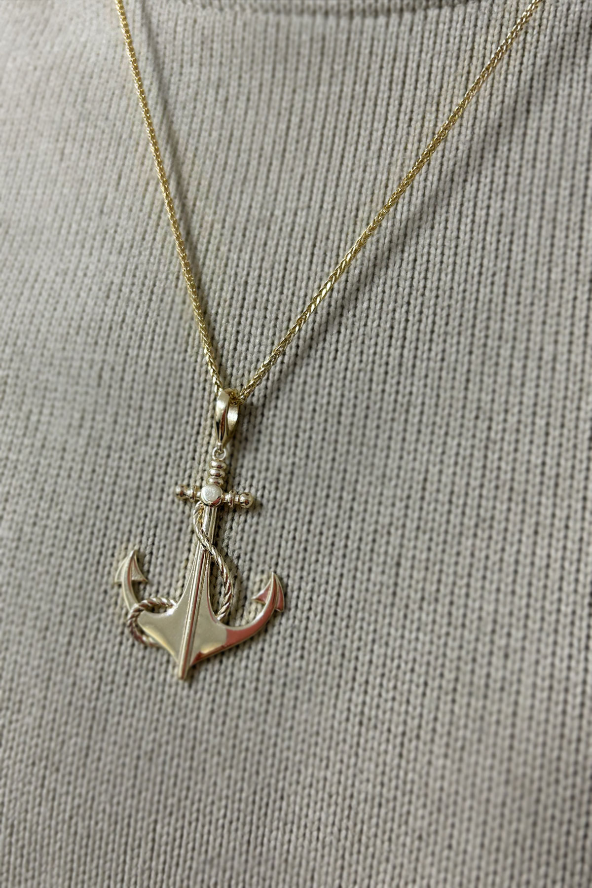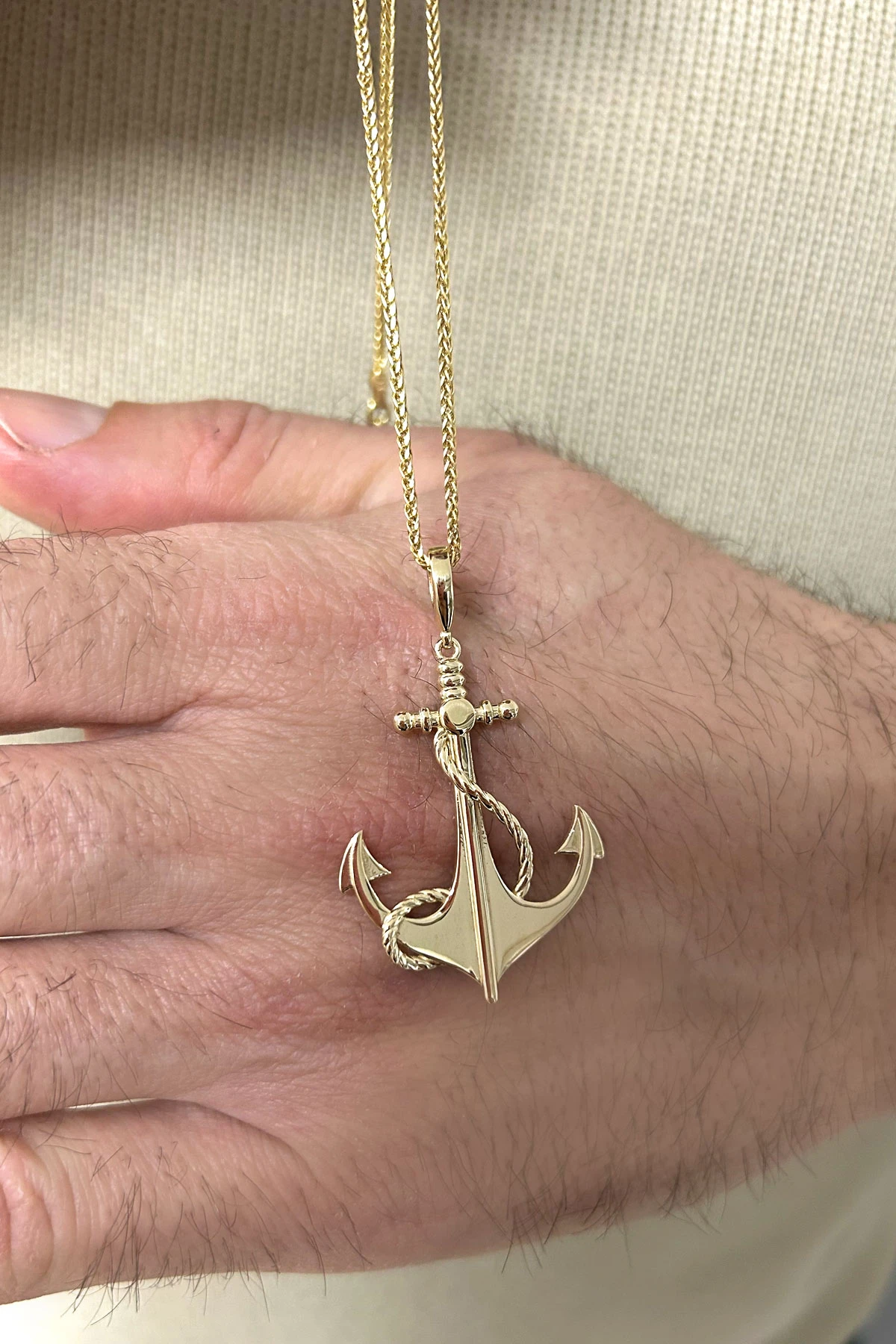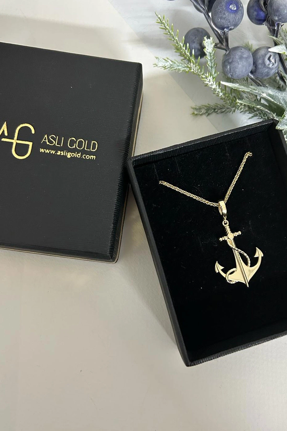 14 Ayar harika bir forma sahip şık, spor ve günlük kullanıma uygun 4.5 cm boyutunda, 60 cm spiga zincirli altın büyük boy taşsız çapa model erkek kolye.