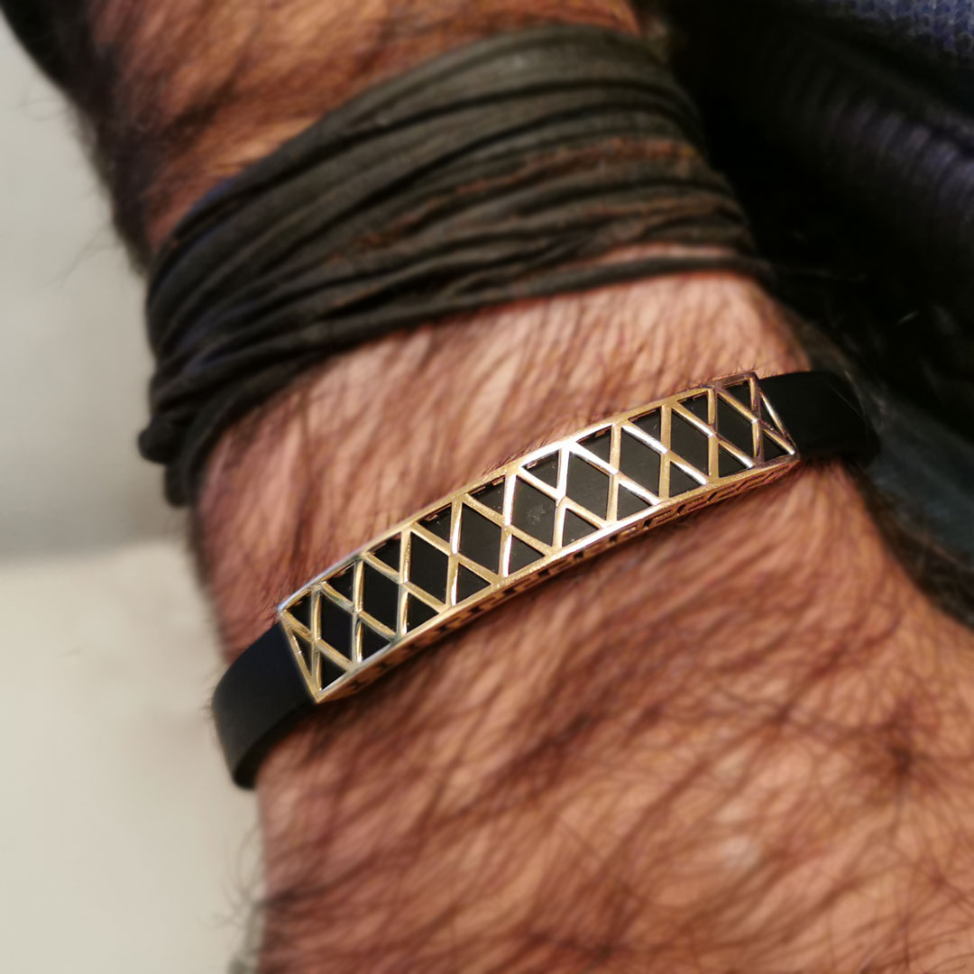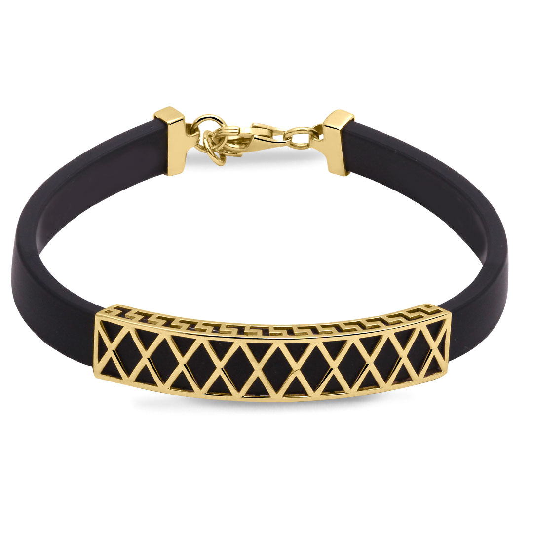 Kauçuk kombinasyonlu çapraz motif detaylı tasarımı ile günlük olarak da kullanabileceğiniz, özel günlerinde sevdiklerinize şık bir hediye seçeneği olacak 5,20 gr ağırlığında 14 ayar altın erkek bileklik.