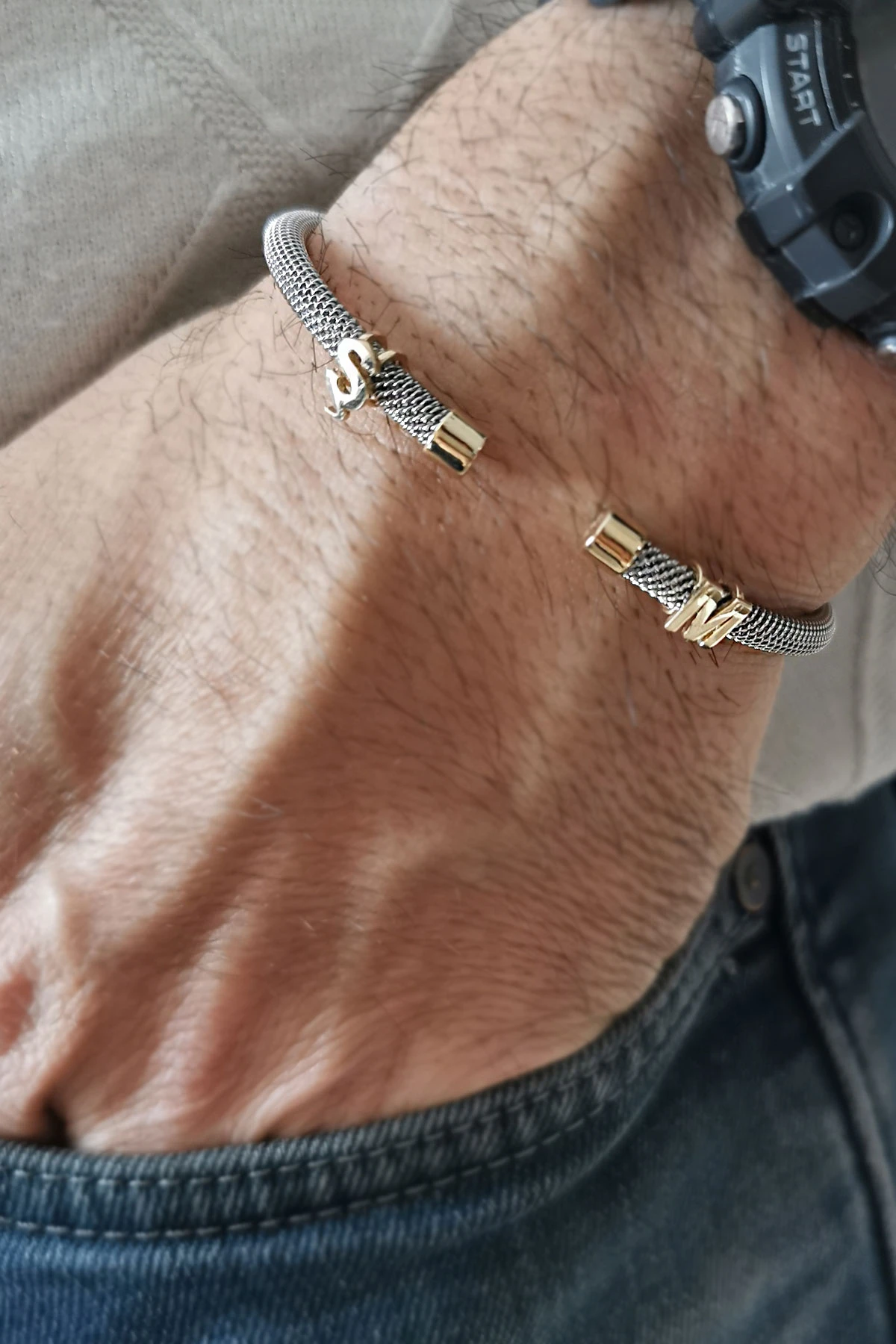 Modern erkek stiline özgün bir dokunuş katan çelik harf bileklik, sağlam çelik yapısı ve altın detaylarıyla göz alıcı bir tasarıma sahiptir. 14 ayar sarı altın işçiliğiyle birleşen bu bileklik, zarif ve güçlü bir görünüm sunar.