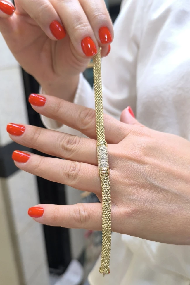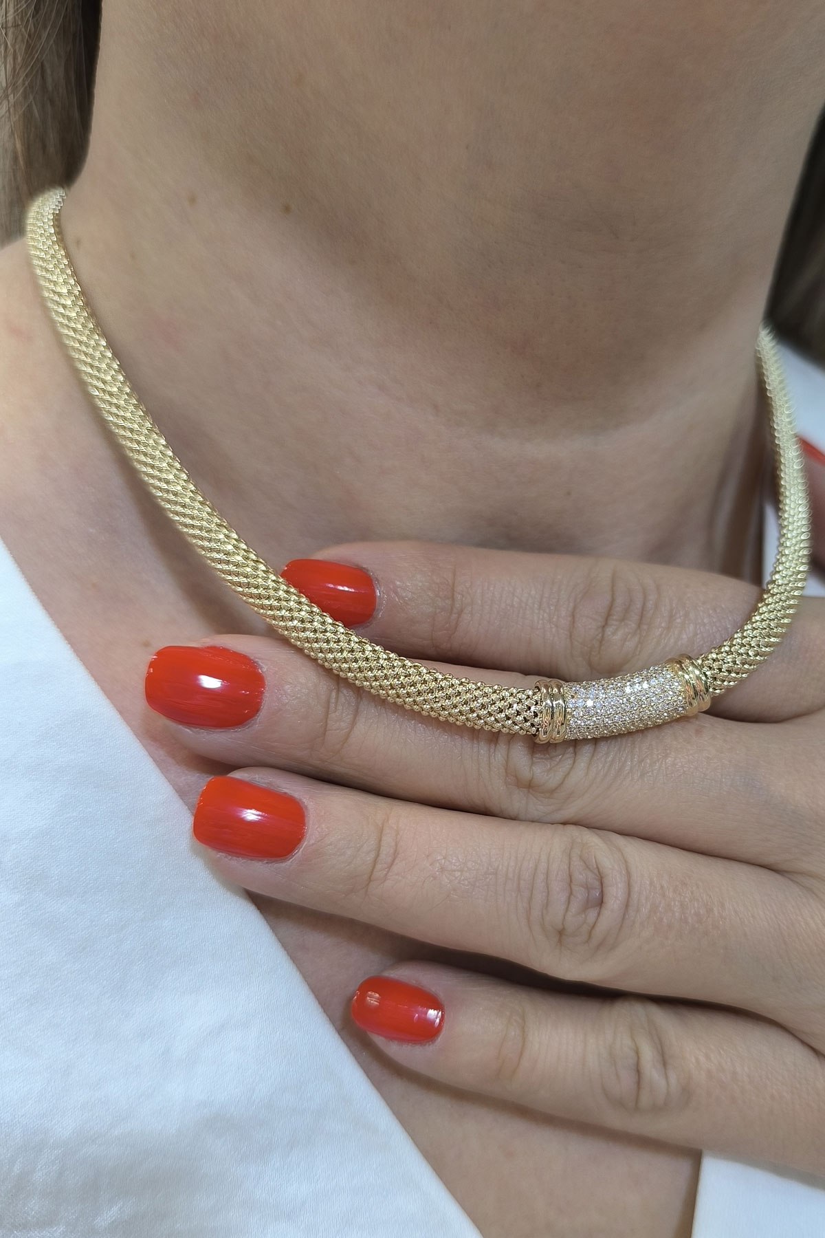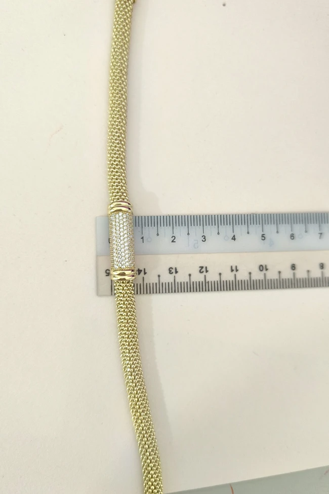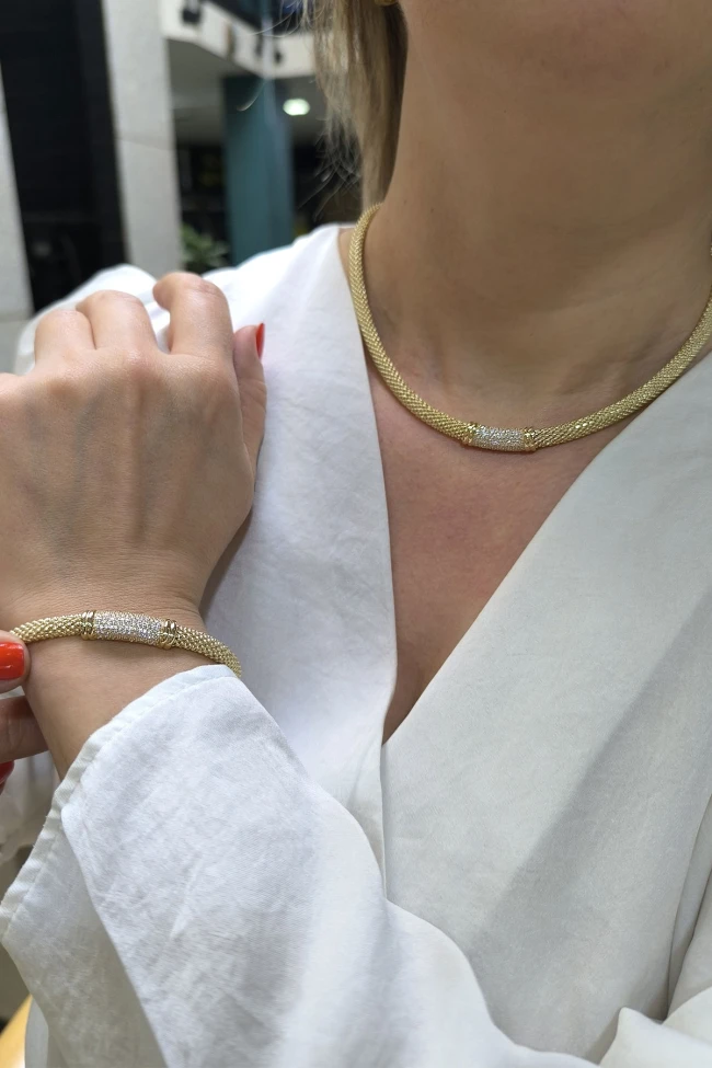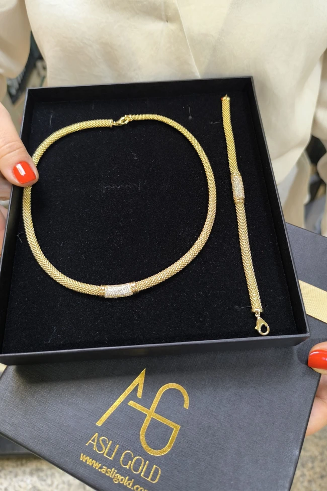 14 Ayar şık ve modern tasarım günlük kullanıma uygun taşlı orta tokası ışıl ışıl zirkon taşlı özel trend tasarım 37.60 gram ağırlığında altın Cesika gerdanlık bileklik seti.