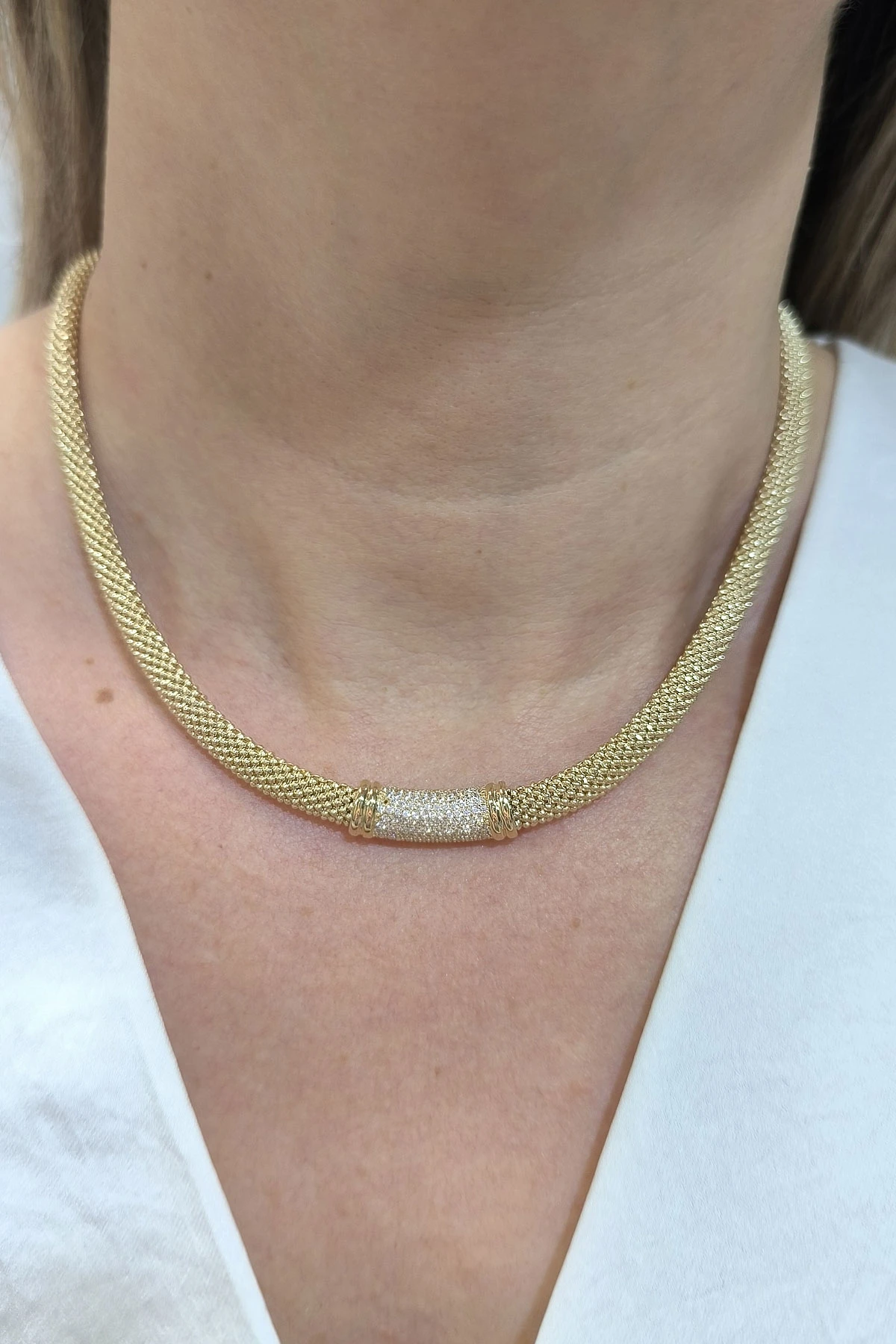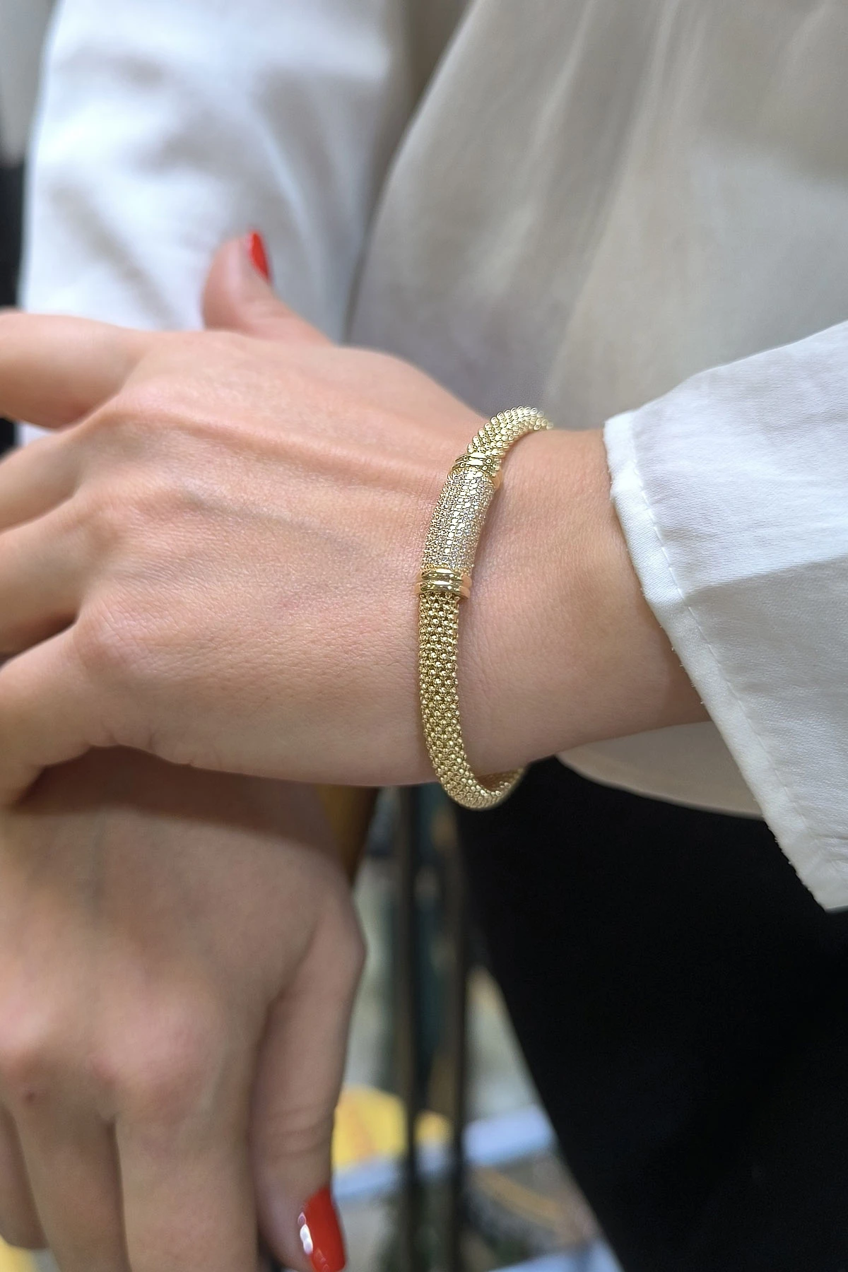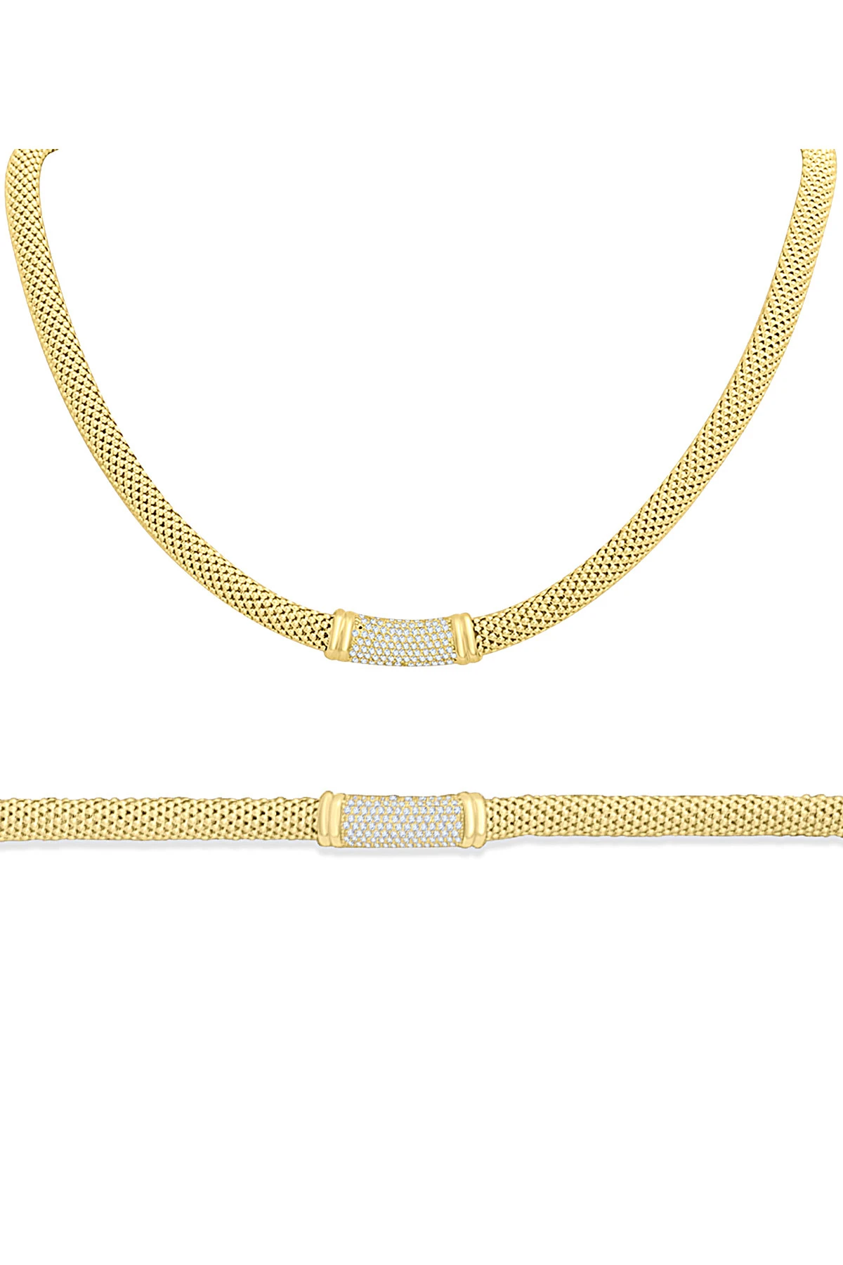 14 Ayar şık ve modern tasarım günlük kullanıma uygun taşlı orta tokası ışıl ışıl zirkon taşlı özel trend tasarım 37.60 gram ağırlığında altın Cesika gerdanlık bileklik seti.