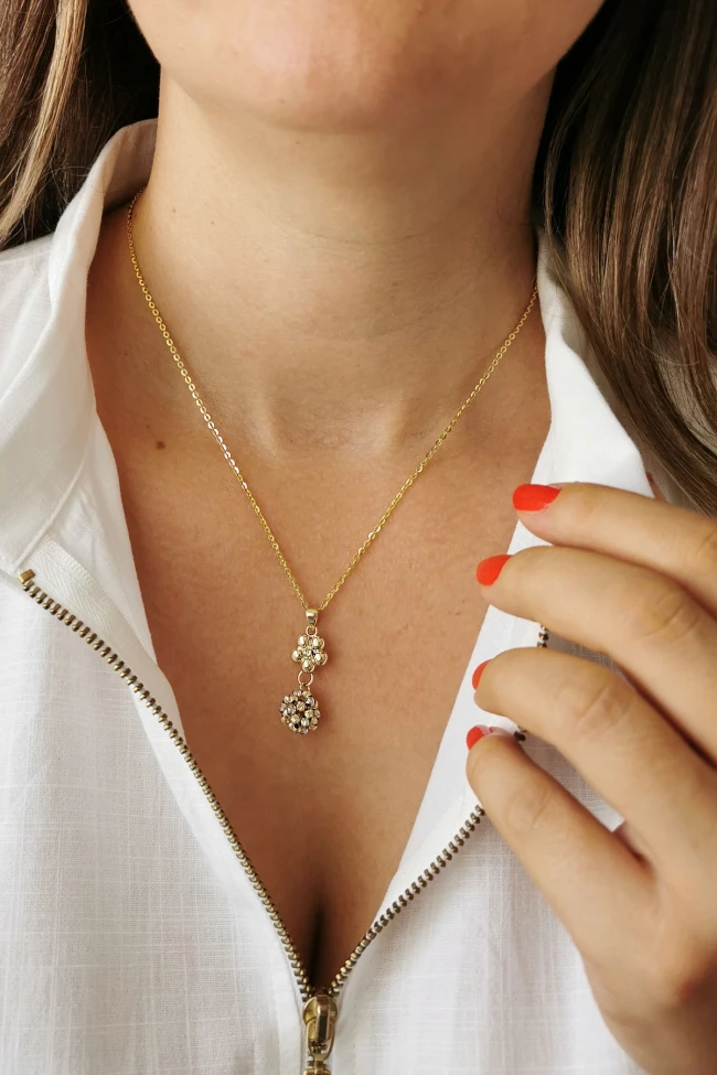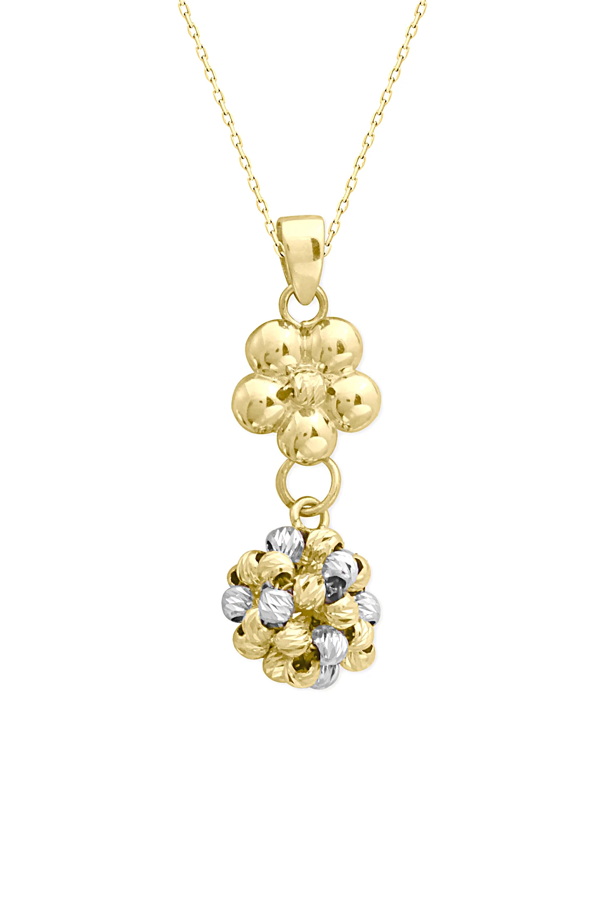 Çiçek detaylı 14 ayar sarı -beyaz altın toplu tasarımıyla günlük kullanıma uygun 3.60 gram ağırlığında 3.5 Cm ışıltılı dorika kadın kolye.