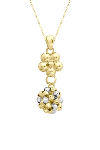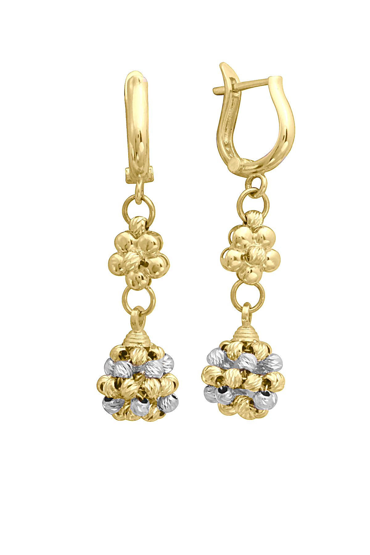 Çiçek detaylı 14 ayar sarı -beyaz altın toplu tasarımıyla günlük kullanıma uygun 6.50 gram ağırlığında 4.5 Cm ışıltılı dorika kadın küpe.