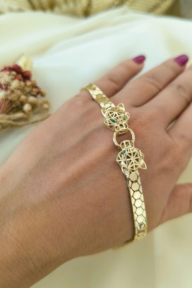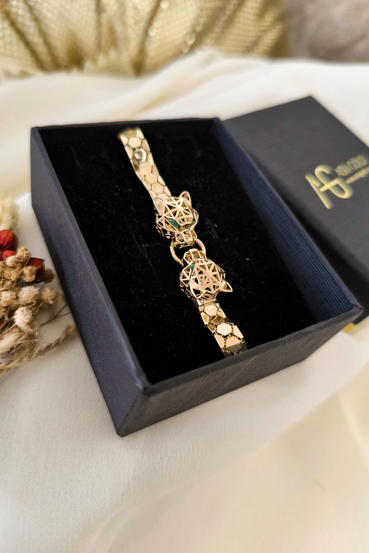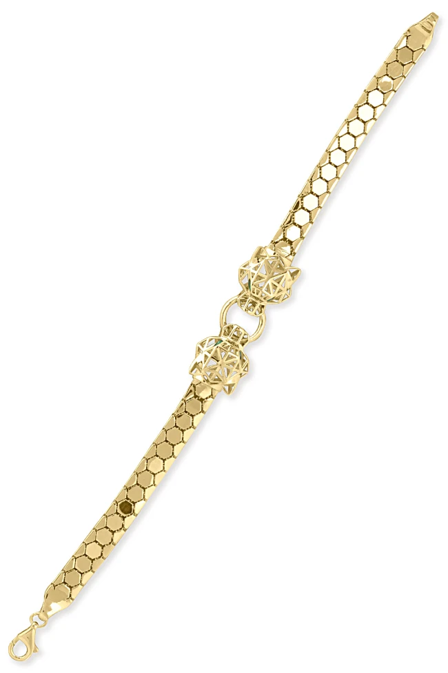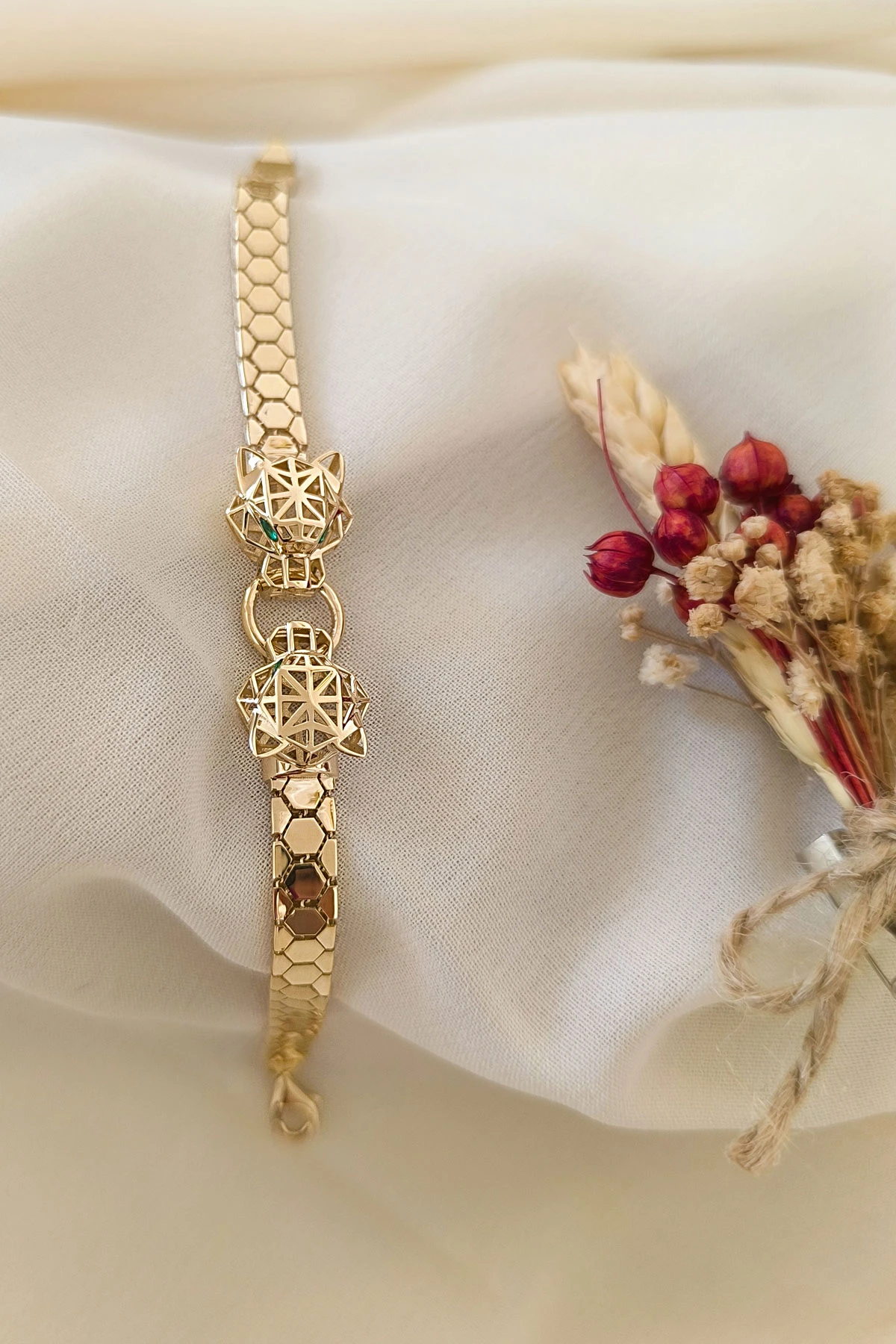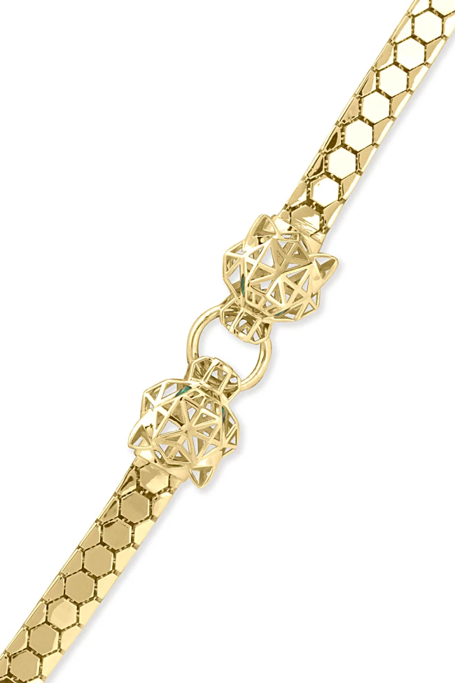 14 Ayar şık ve gösterişli petek tasarım ışıl ışıl 6 mm genişliğinde, 10.00 gram ağırlığında altın füzyon çift başlı panter bileklik.