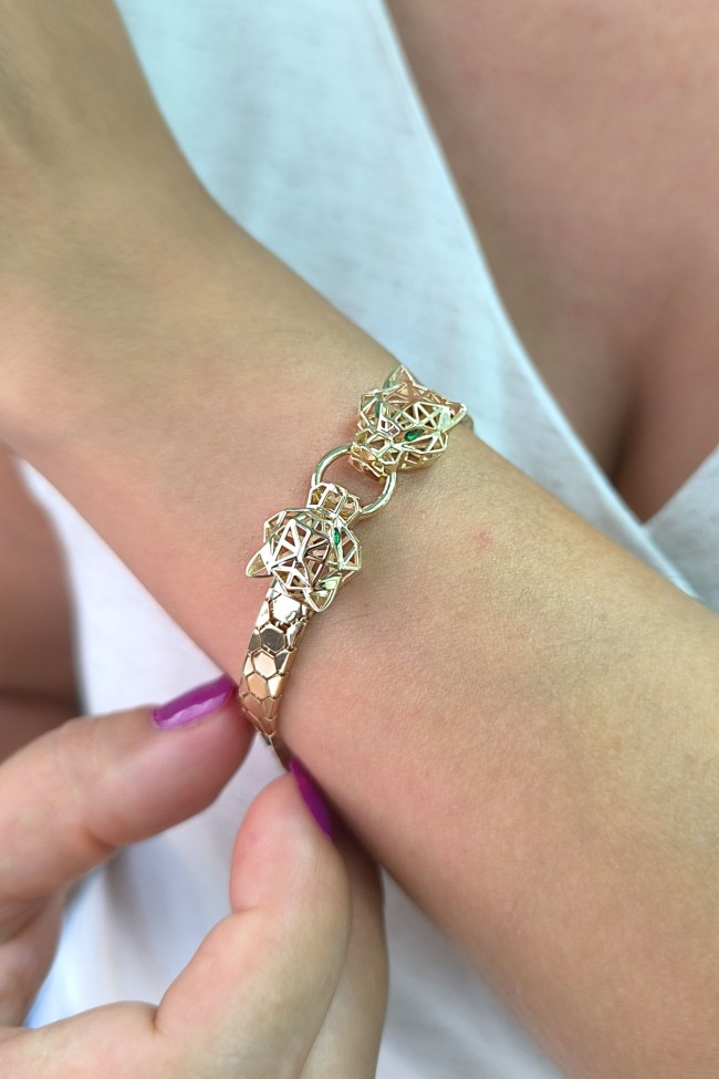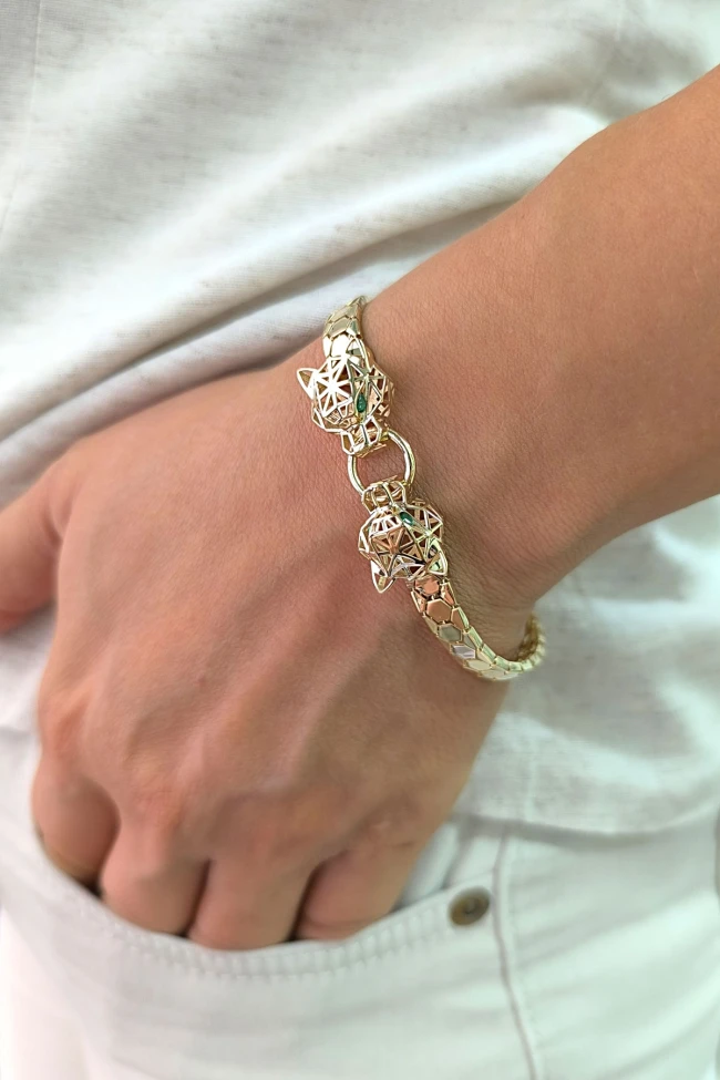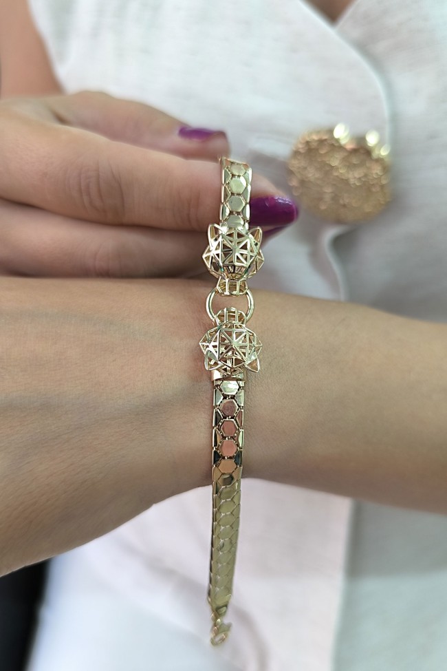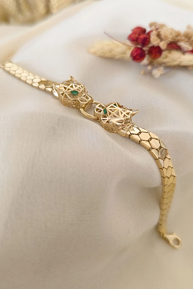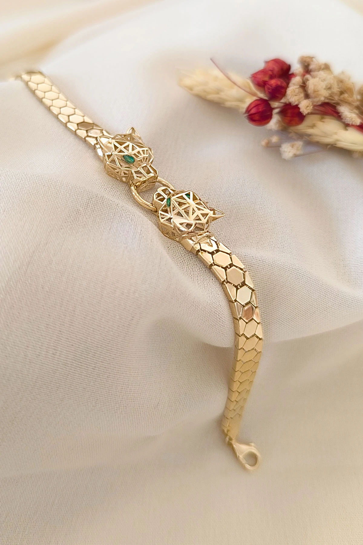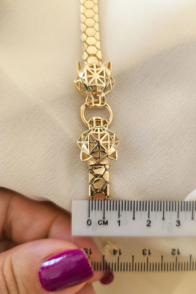 14 Ayar şık ve gösterişli petek tasarım ışıl ışıl 6 mm genişliğinde, 10.00 gram ağırlığında altın füzyon çift başlı panter bileklik.