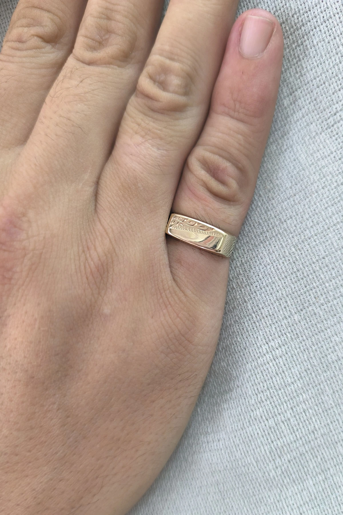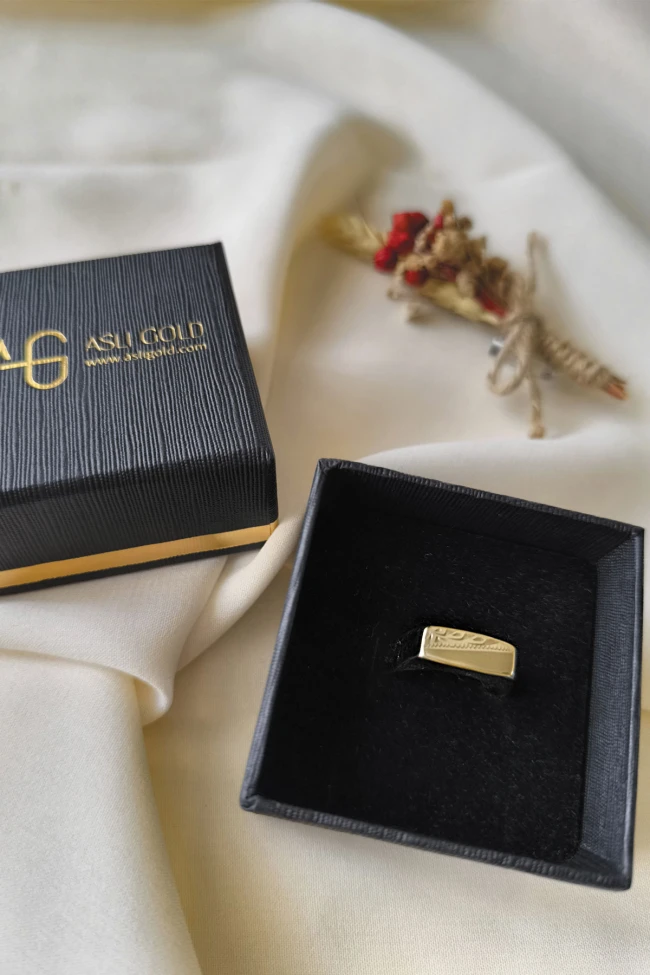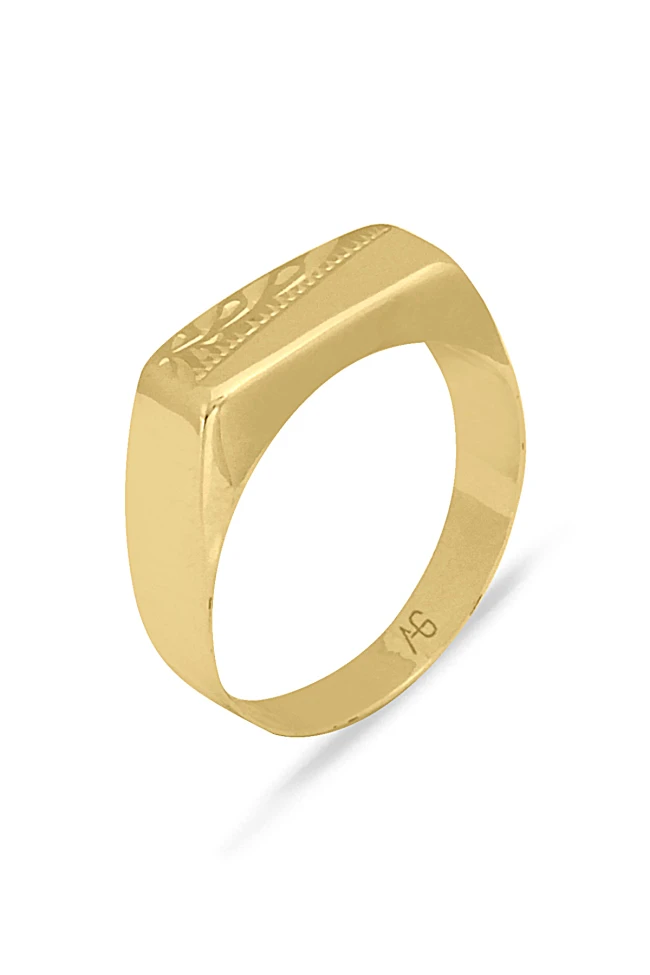 1.80 Gr. ağırlığında sarı altın özel kalem işlemeli dikdörtgen taşsız şık bir modele sahip 14 ayar altın erkek yüzük.