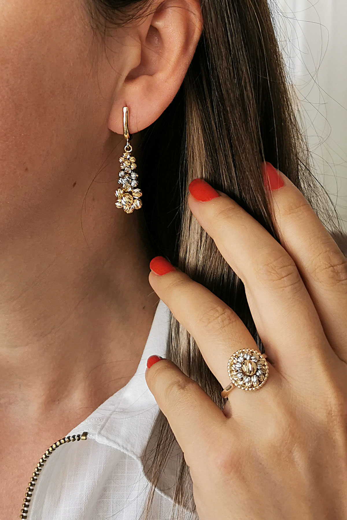 14 Ayar modern, şık ve farklı tasarımı ile şahane bir duruşa sahip günlük kullanıma uygun 7.50 gram ağırlığında 4 cm boyunda dorika altın hafif sallantılı küpe ve yüzükten oluşan ikili takım.
