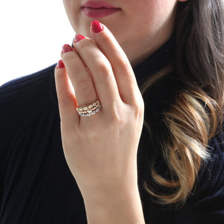 Oval ve yuvarlak ve şekillerdeki altın rekli topların kombinasyonuyla tasarlanmış ışıl ışıl modern ve ofis kadınının tercihi 3.55 gram ağırlığında dorika 14 ayar yüzük. İsterseniz orta parmak isterseniz yüzük parmağınızda kullananın, günlük şıklığınıza hava katın! *Ürünlerimiz faturalıdır güvenle satın alabilirsiniz, özel hediye kutusunda ücretsiz kargo ile gönderilecektir.