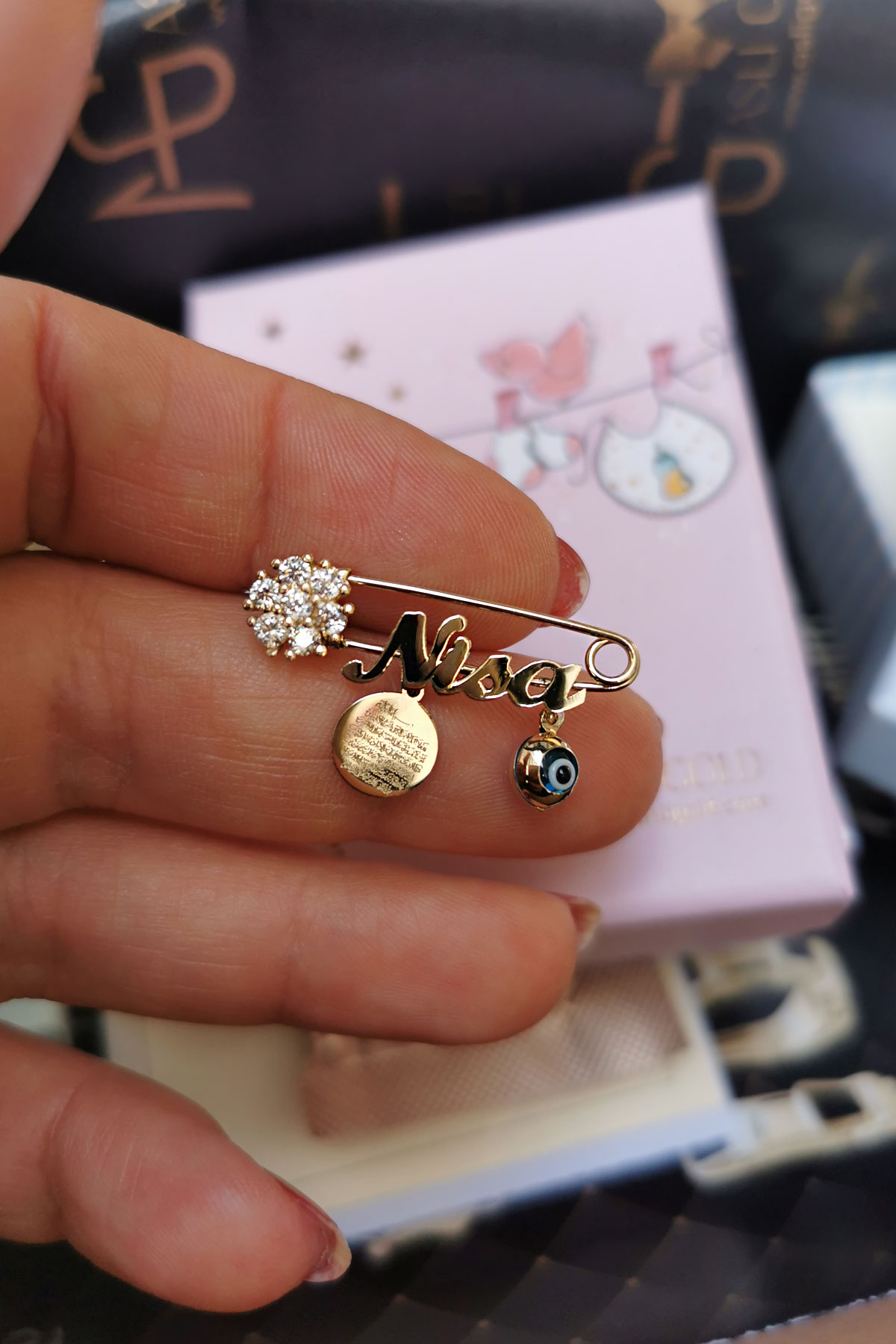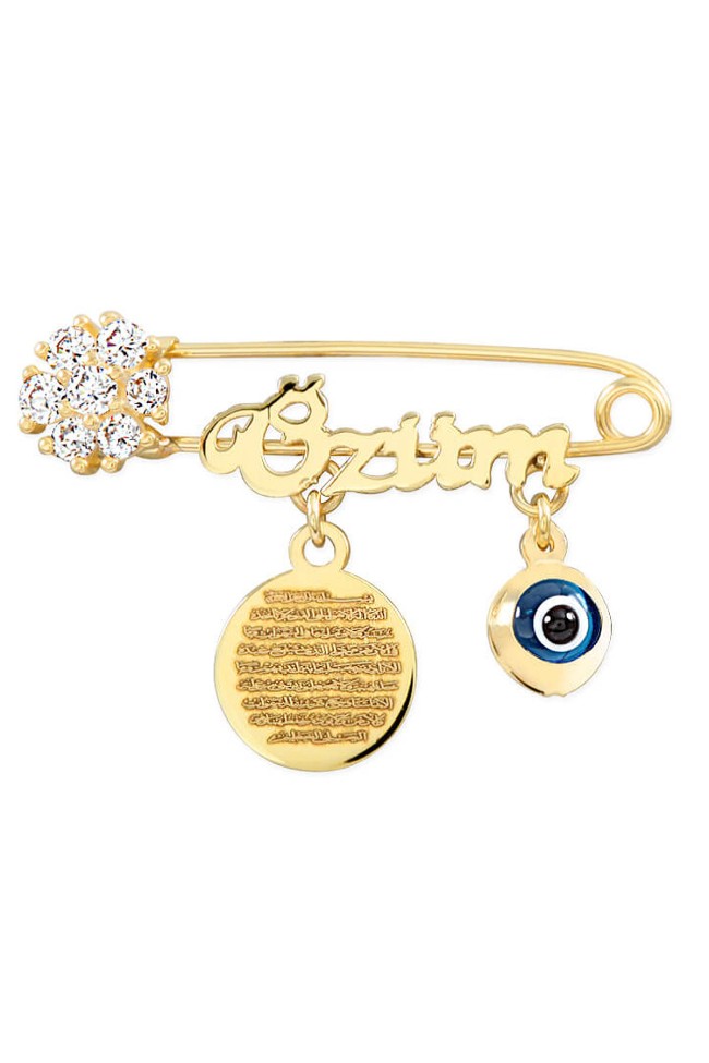 14 ayar 2.30 gr ağırlığında ayetel kürsi dualı kar tanesi ve nazar boncuk detaylı isimli kız bebek altın iğne.