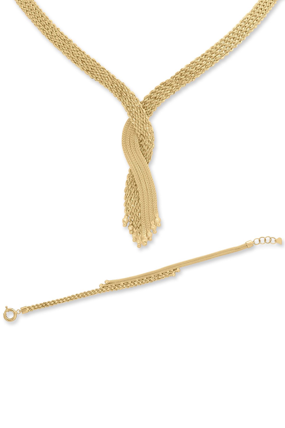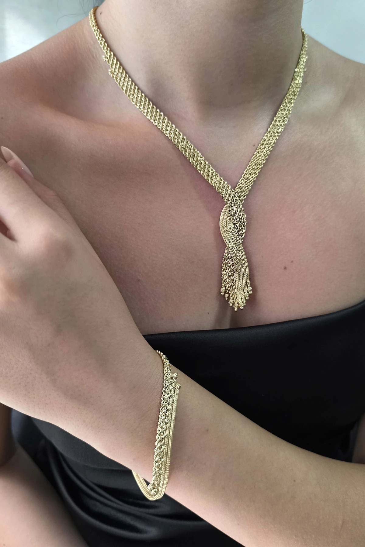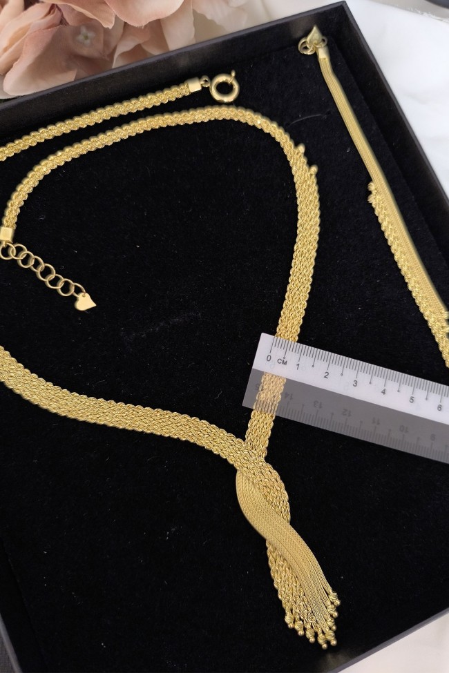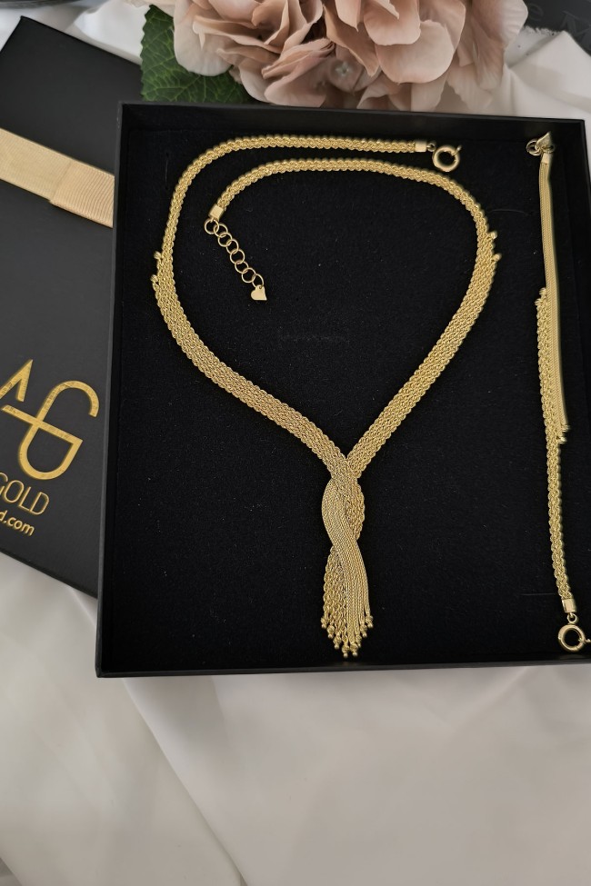 14 Ayar hafif, modern ve havalı tasarım günlük kullanıma uygun taşsız ışıl ışıl döngü model oldukça iddialı bir model 22.10 gram ağırlığında altın trabzon işi görünümlü kadın ikili gerdanlık seti.