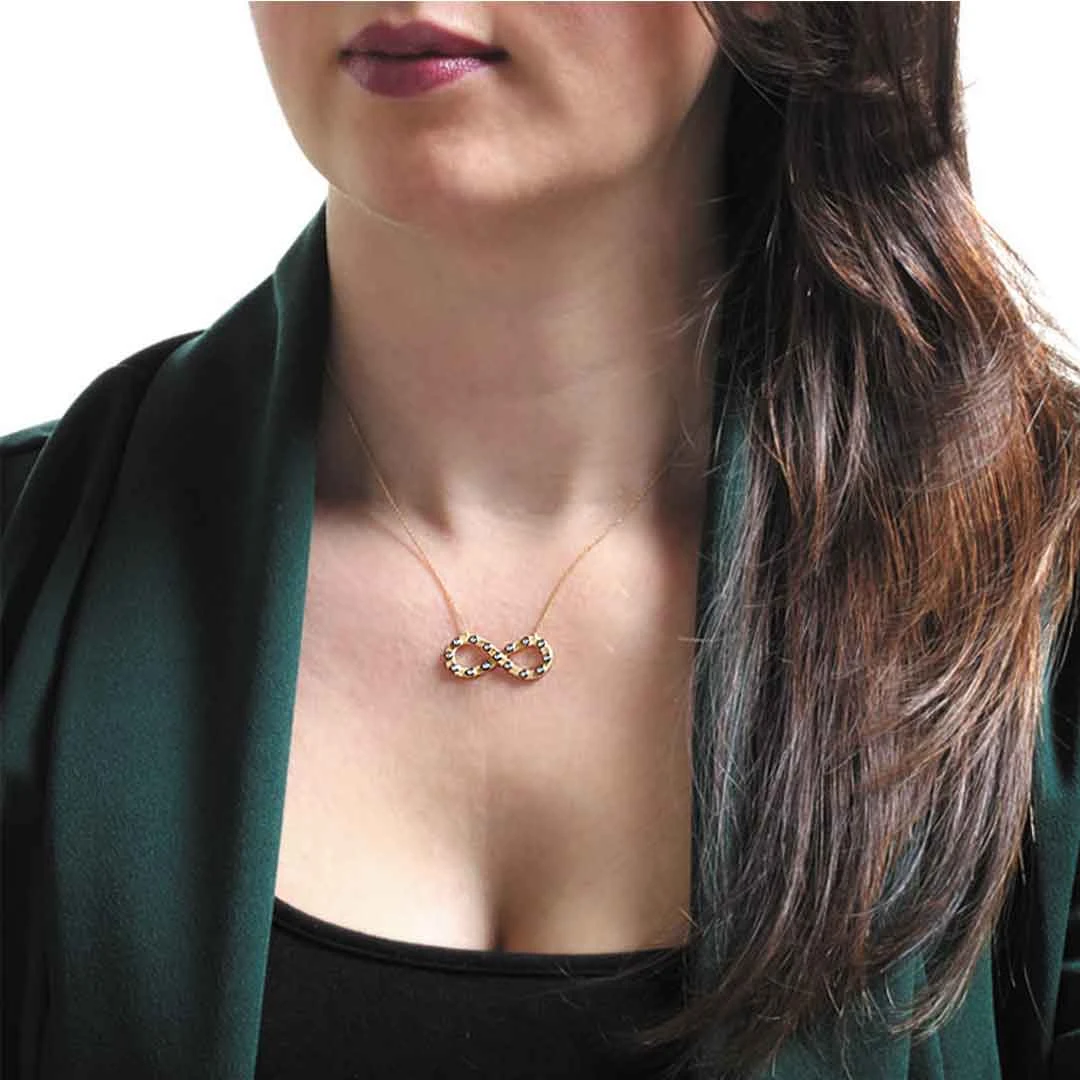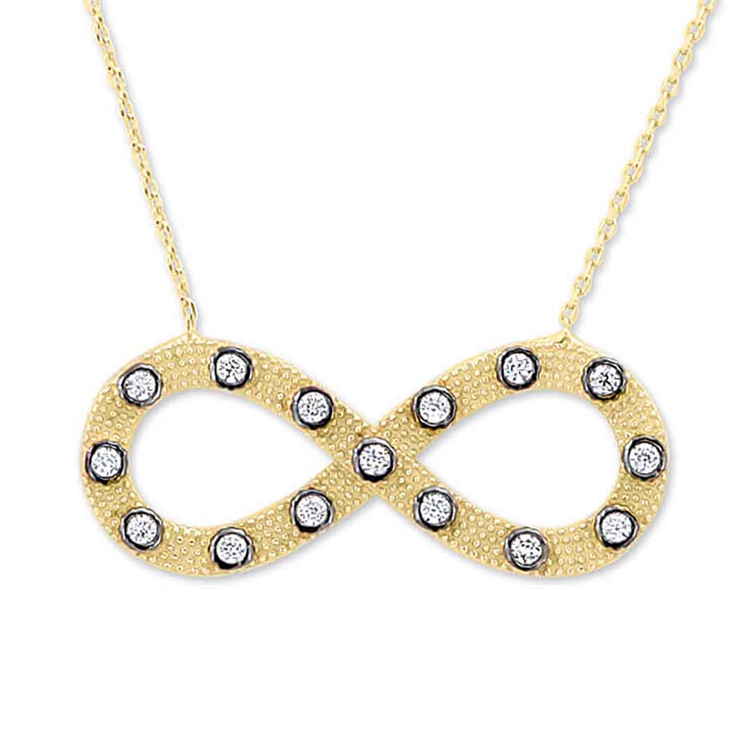Zirkon taş çevreleri siyahlaştırma tekniği ile taşın ışıltısını ön plana çıkarmak için modernize edilmiş farklı duruşu ile oldukça göz alıcı sonsuz sevginin simgesi altın 14 ayar sonsuzluk kolye.