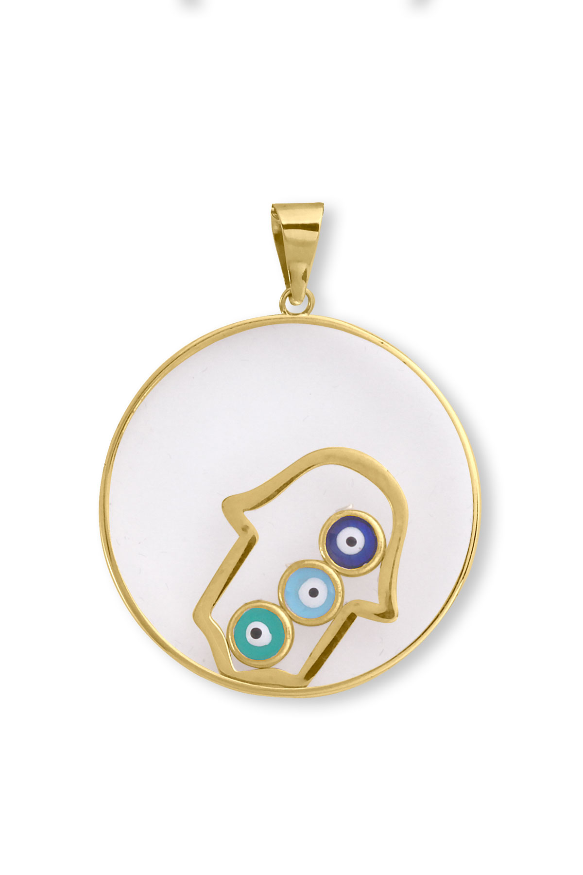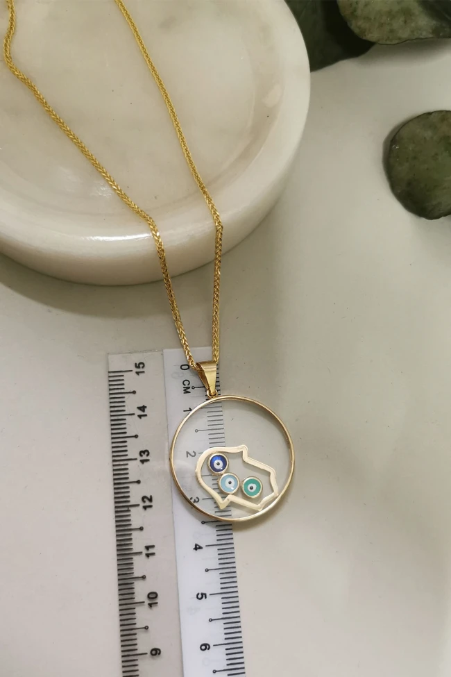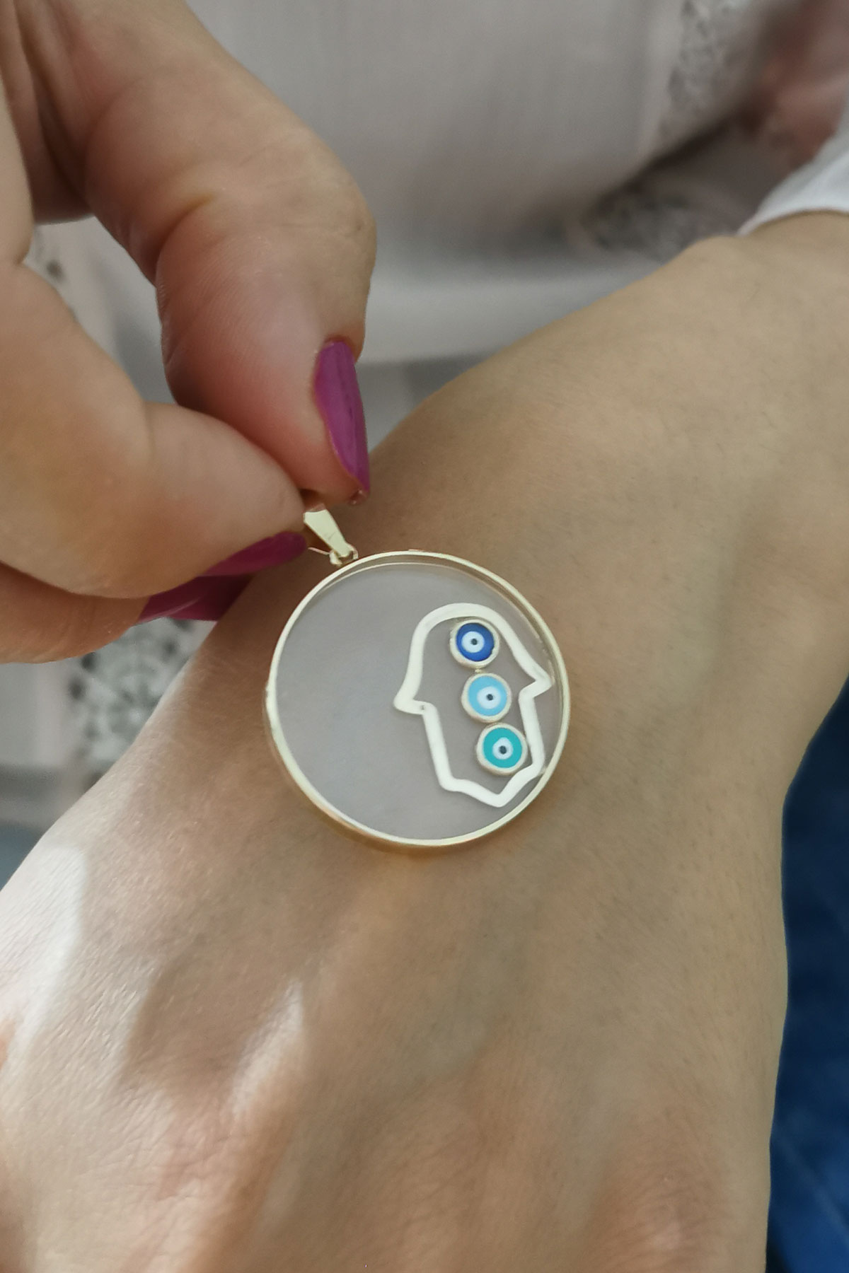 Spor Ve Günlük Kullanıma Uygun Işıl Işıl İçi Nazar Boncuğu Ve Fatma Ana Eli Detaylı 5.00 Gr. Ağırlığında Altın Camlı Tasarım Kolye Ucu.