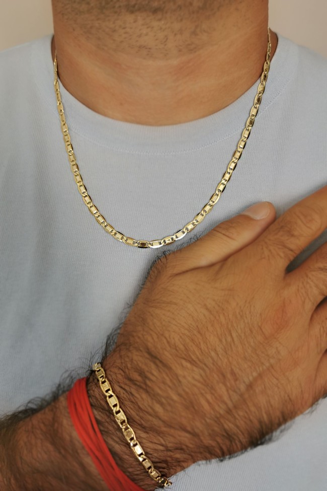 14 Ayar Altın Modern Tüm Gün Giyim Kombinlerinize Eşlik Edecek Ve Tarz Katacak Hem Kadın Hem Erkek Kullanımına Uygun Harika Bir Modele Sahip 13.15 Gr Altın Çubuklu Figaro Unisex Zincir Kolye Bileklik Takım..