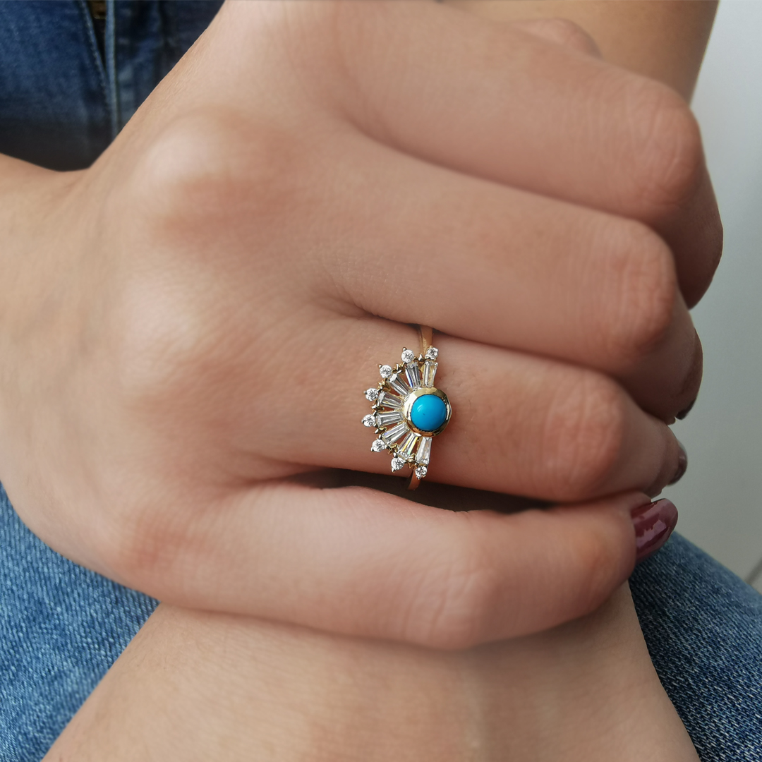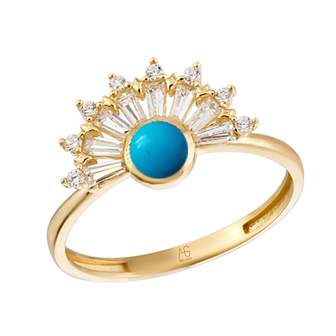 14 Ayar sarı altın firuze taş detaylı günlük kullanıma uygun 1.50 gram ağırlığında hafif ince ve minimal tasarımlı, baget zirkon taşlı kadın yüzük.