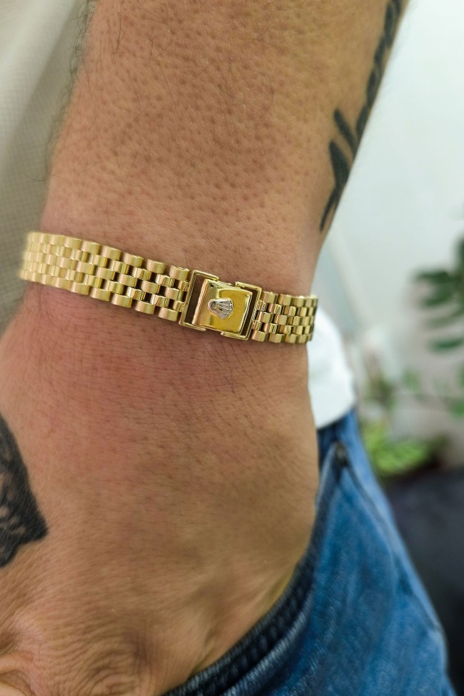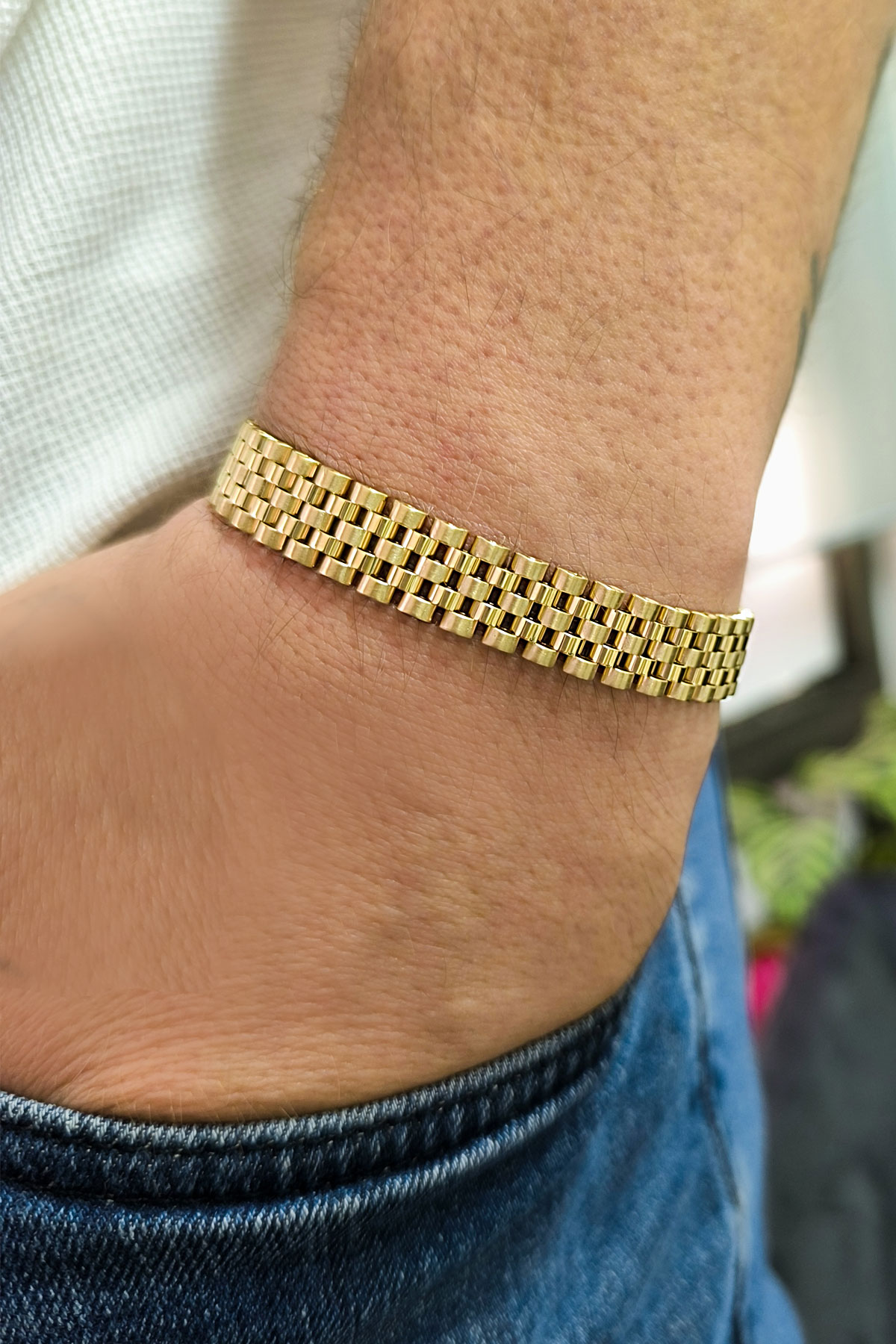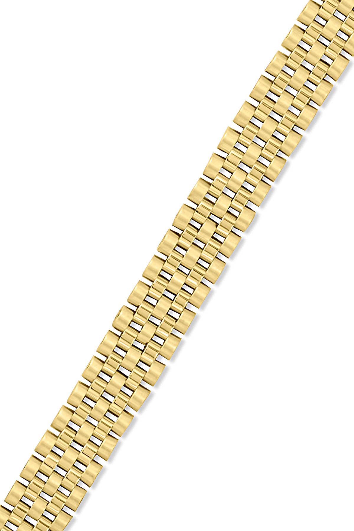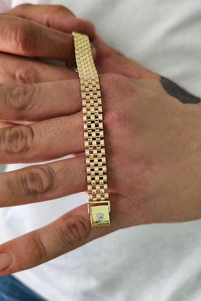 14 Ayar şık ve spor tasarım günlük kullanıma uygun taşsız geçme halka desenli model ışıl ışıl bir model 21.95 gram ağırlığında 11 mm genişliğinde altın roleks erkek bileklik.