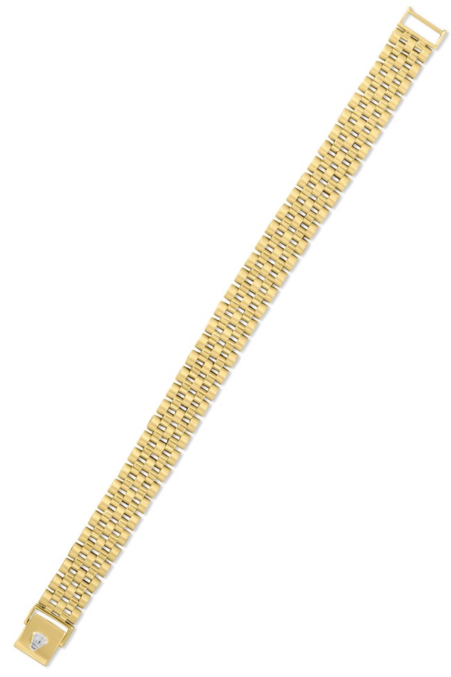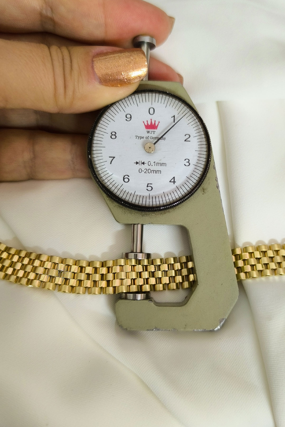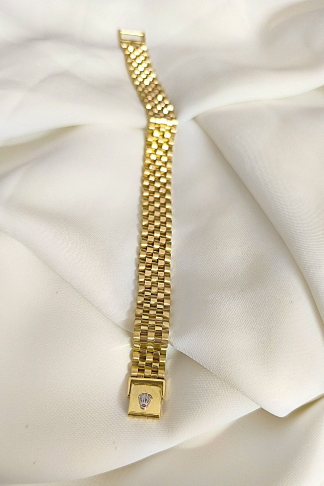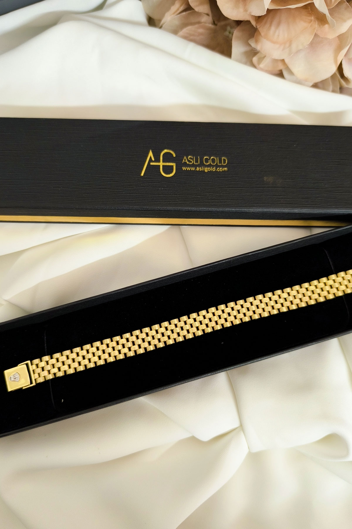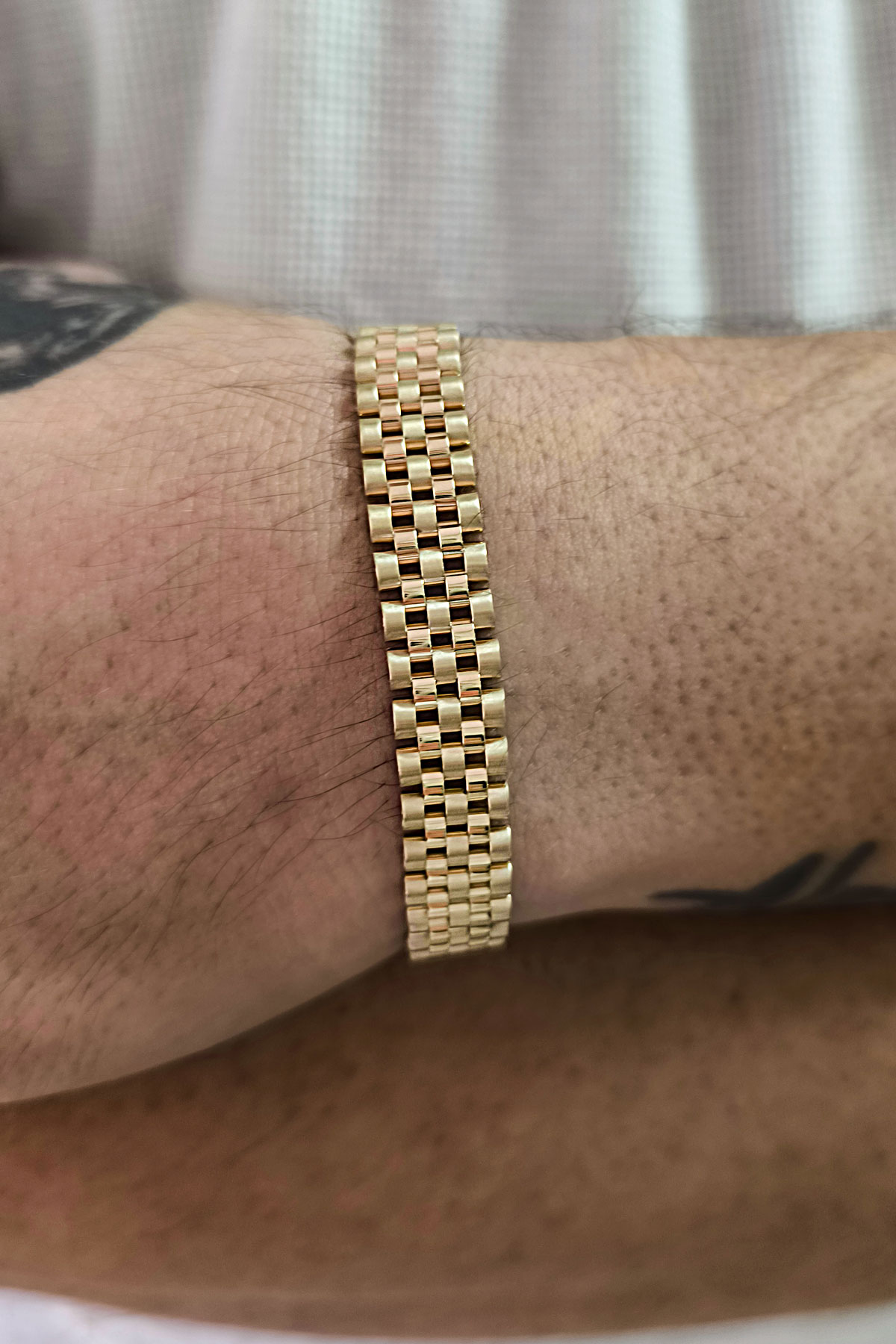 14 Ayar şık ve spor tasarım günlük kullanıma uygun taşsız geçme halka desenli model ışıl ışıl bir model 21.95 gram ağırlığında 11 mm genişliğinde altın roleks erkek bileklik.