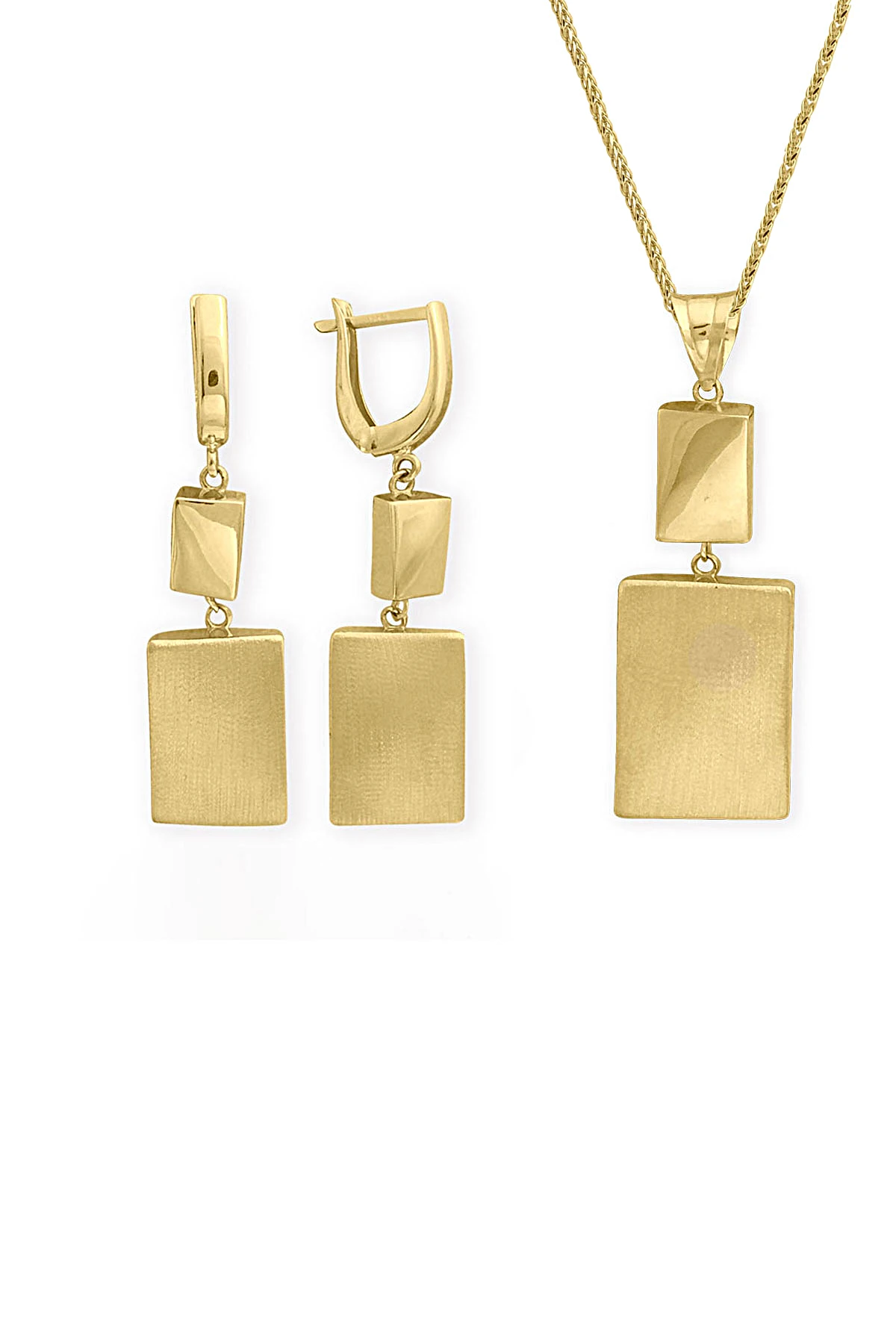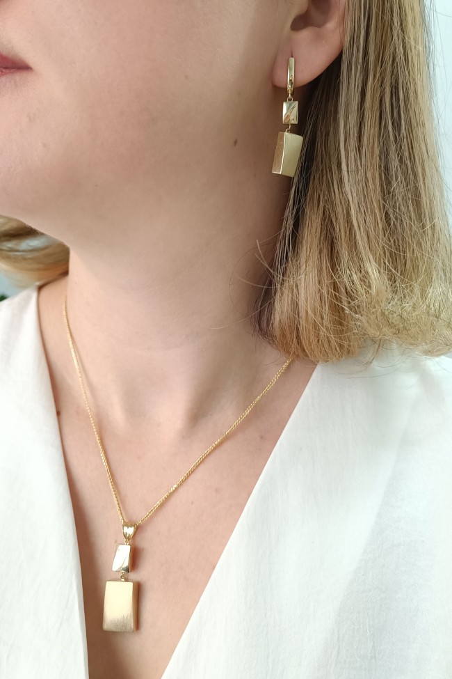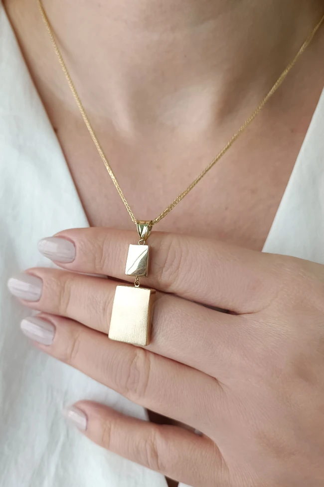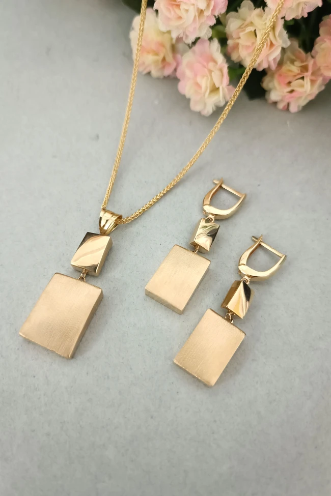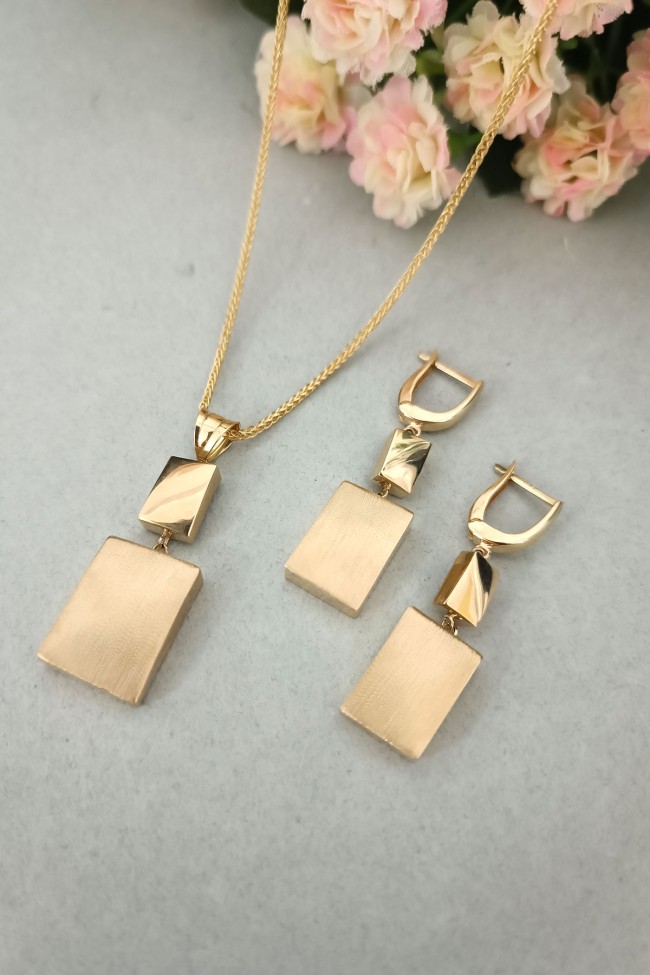 14 Ayar gösterişli ve şık tasarımı ile modern ışıl ışıl duruşa da sahip günlük kullanıma uygun 9.75 gram ağırlığında taşsız dikdörtgen tasarım altın füzyon ikili takım.