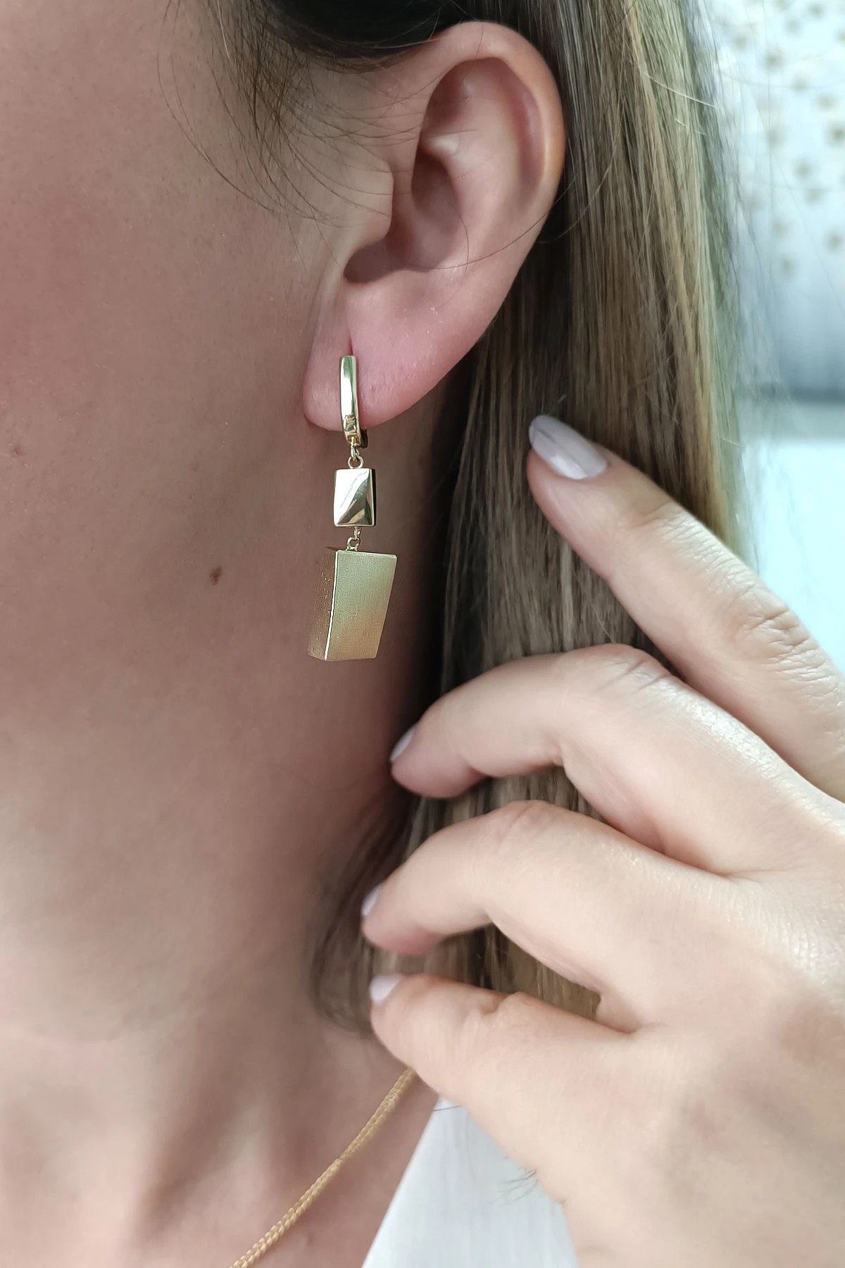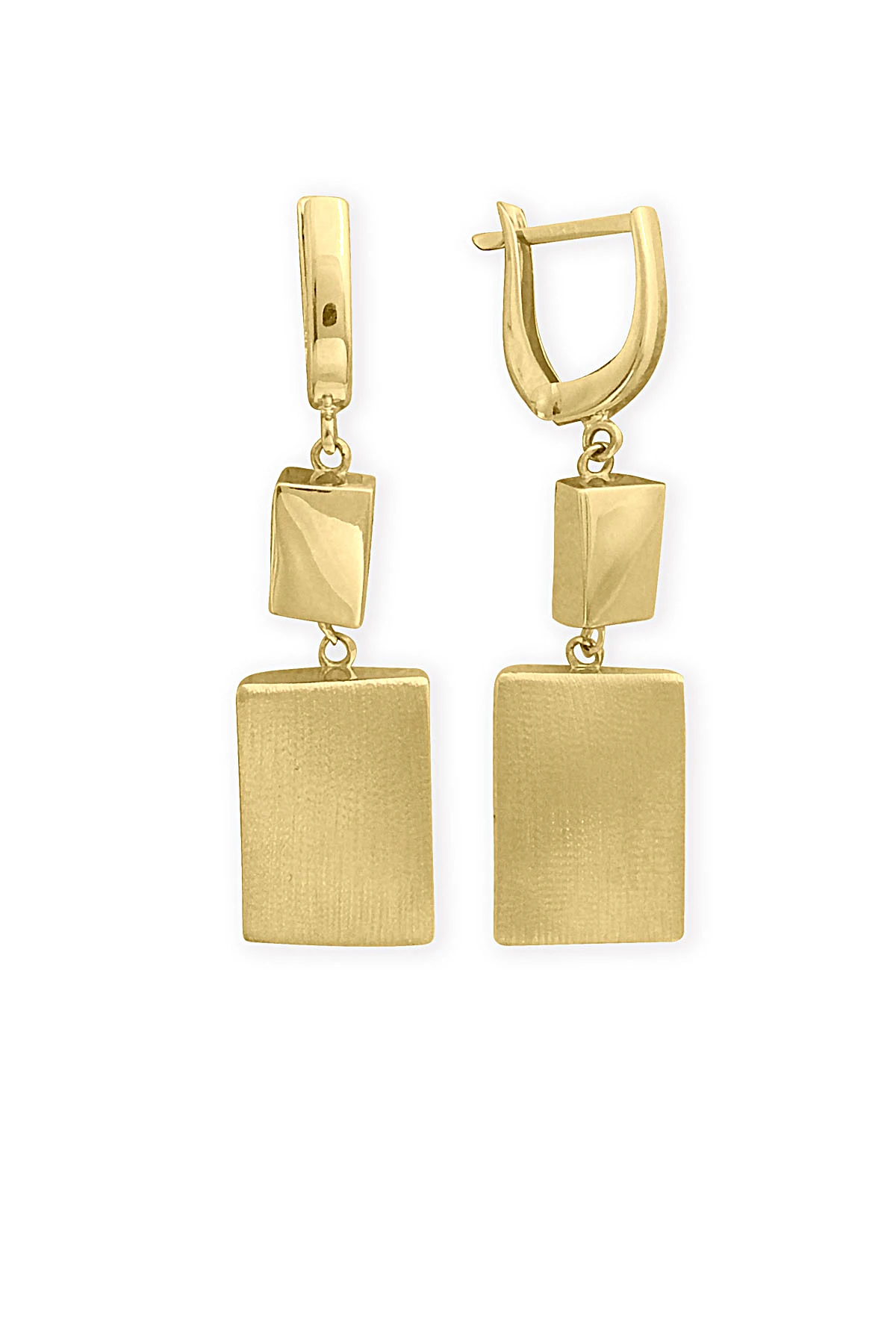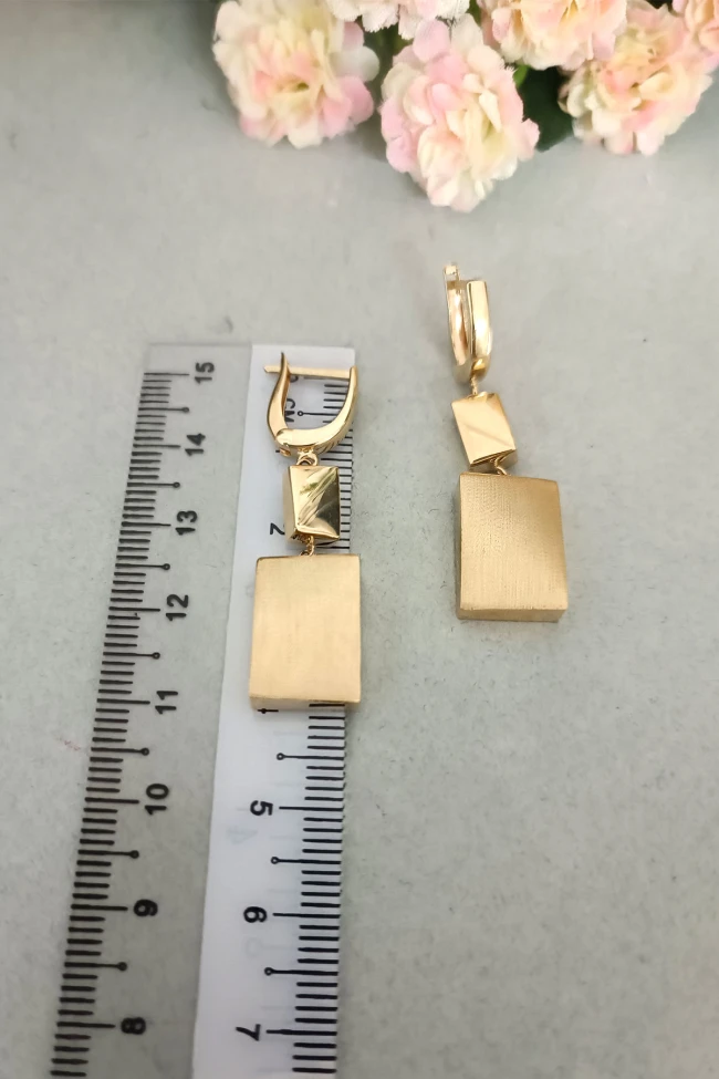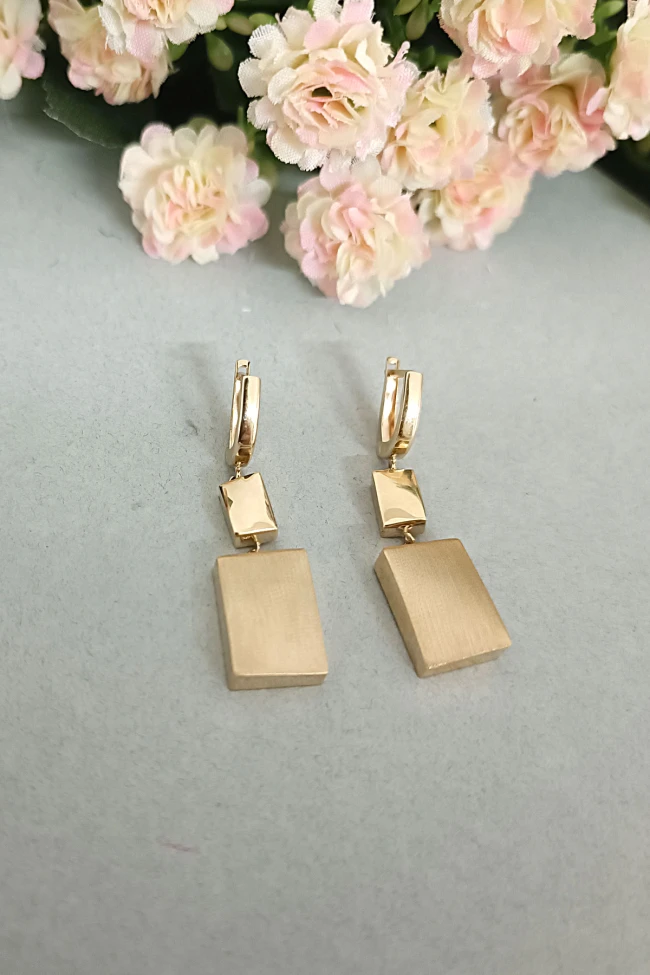 14 Ayar gösterişli ve şık tasarımı ile modern ışıl ışıl duruşa da sahip günlük kullanıma uygun 5.10 gram ağırlığında taşsız dikdörtgen tasarım altın füzyon sallantılı küpe.