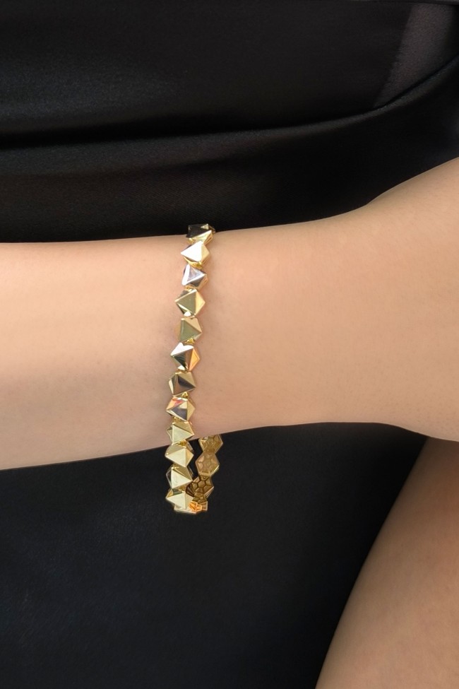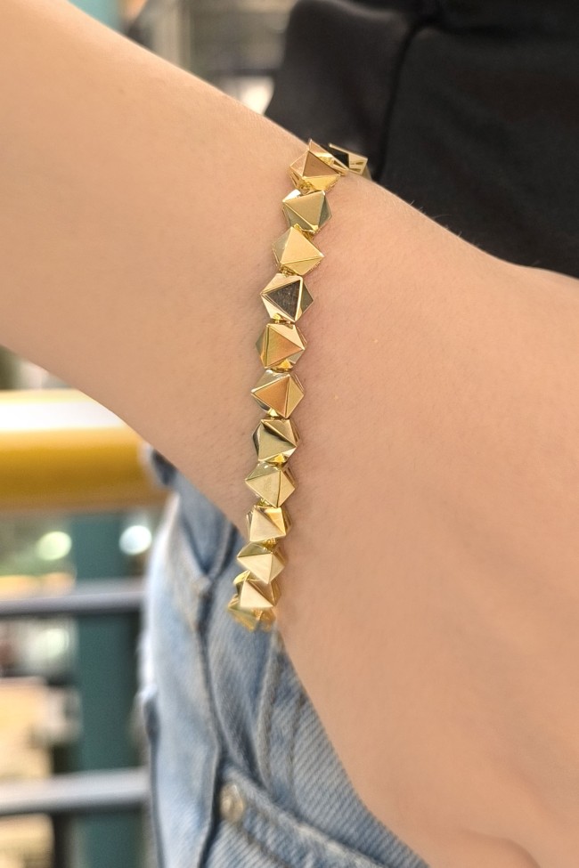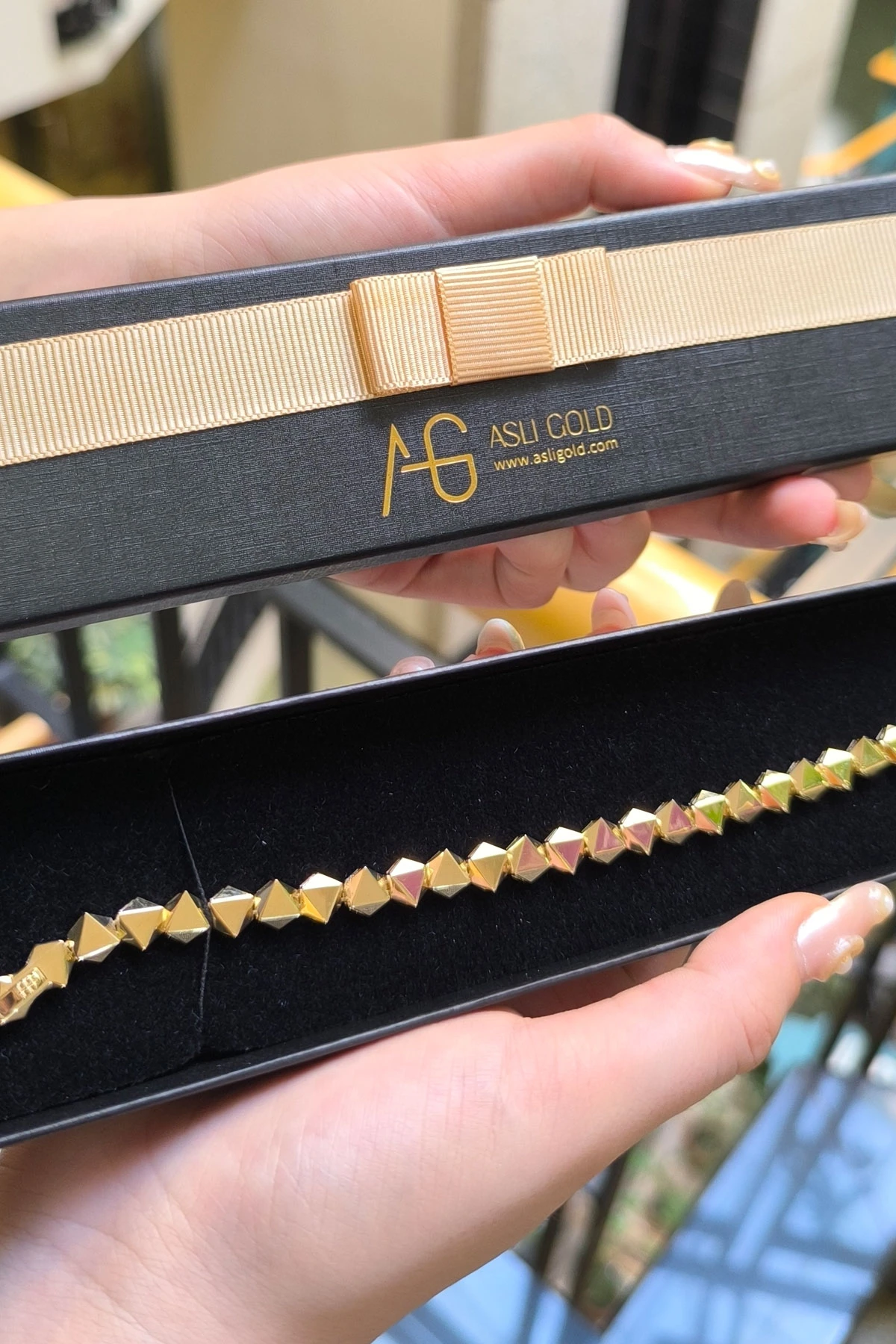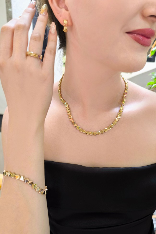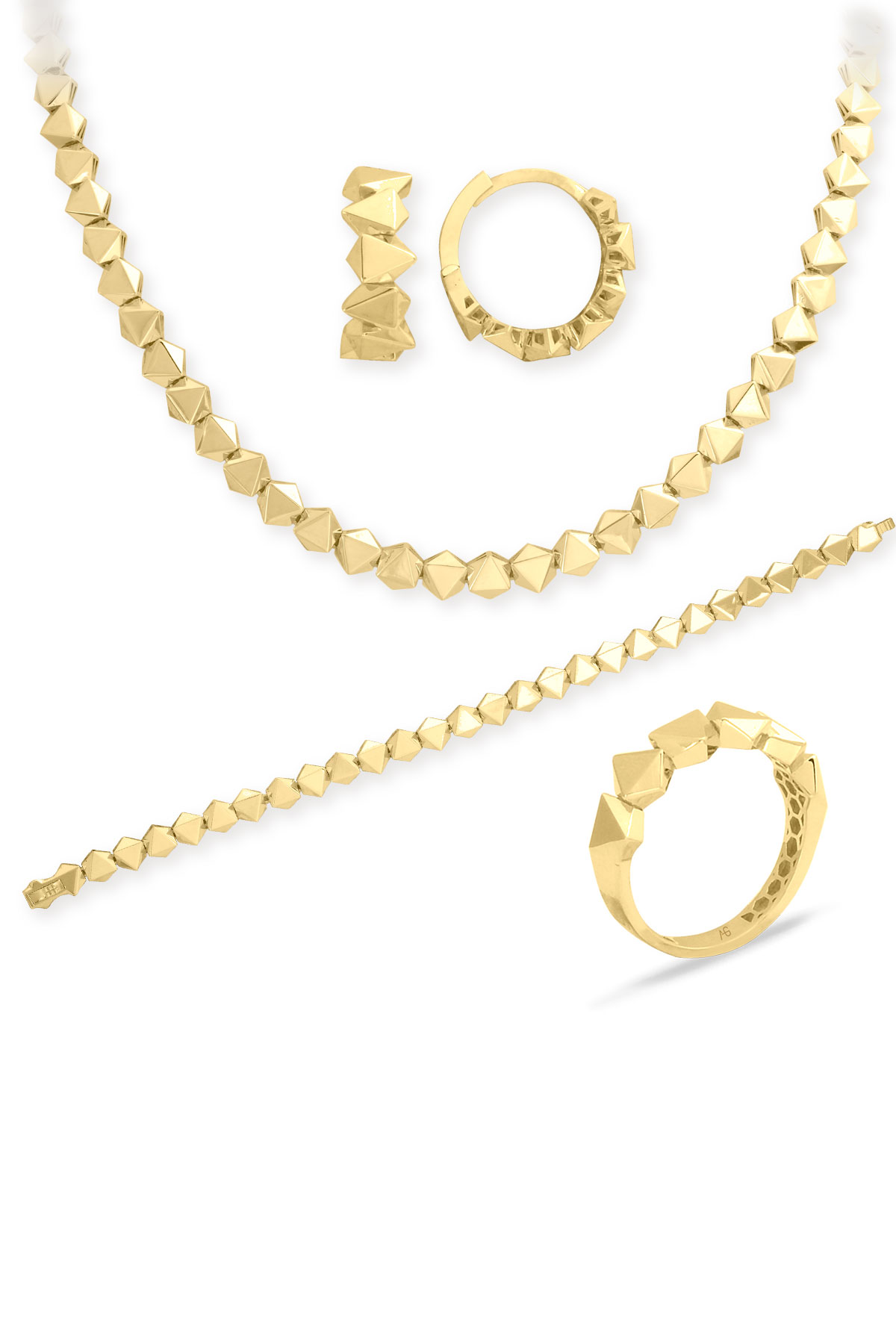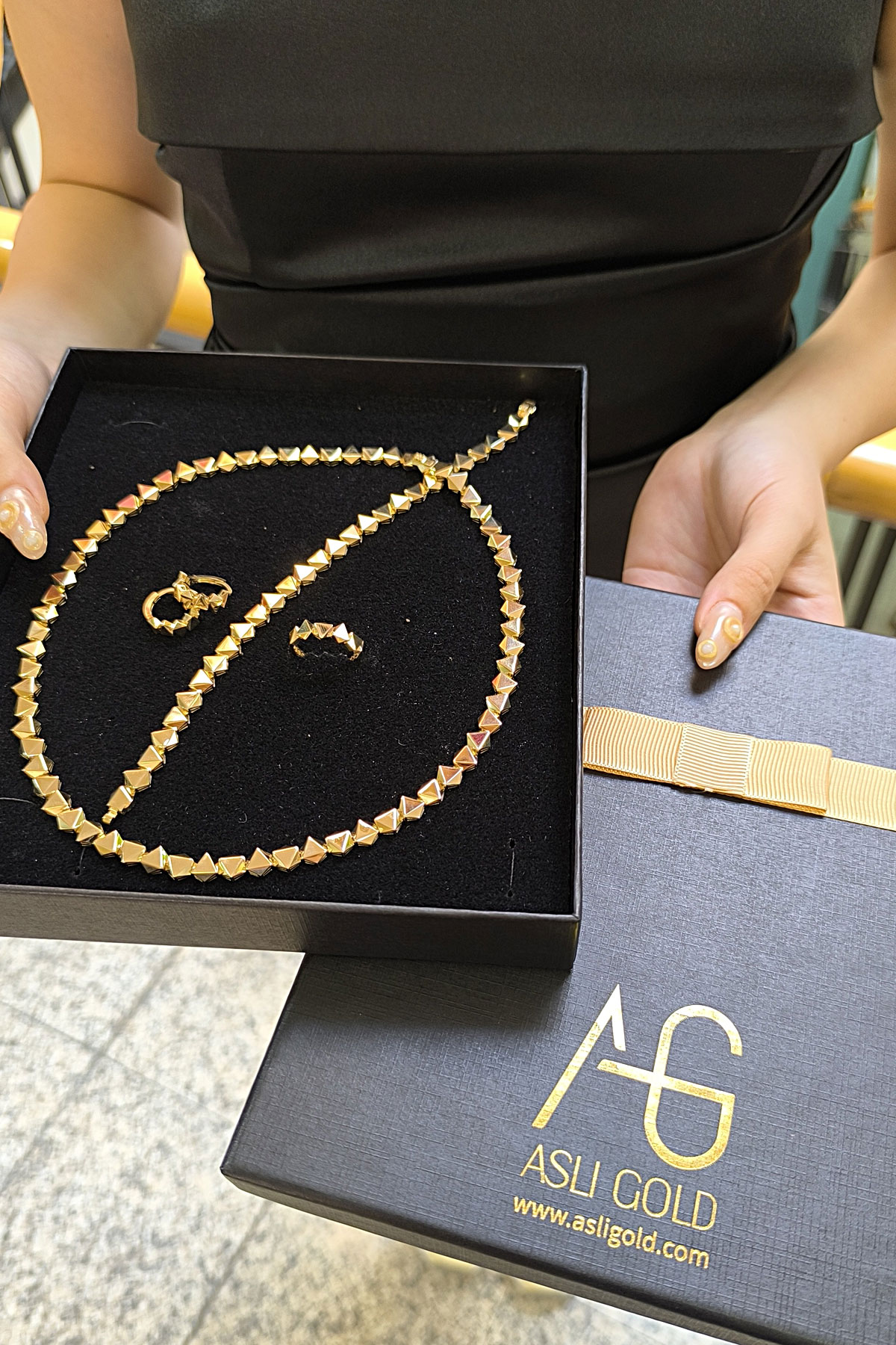 14 Ayar şık ve modern tasarım günlük kullanıma uygun taşsız ışıl ışıl geometrik sade tasarım 36.50 gram ağırlığında altın gerdanlık, bileklik, küpe ve yüzükten oluşan dört parçalı düğün nişan takı seti.