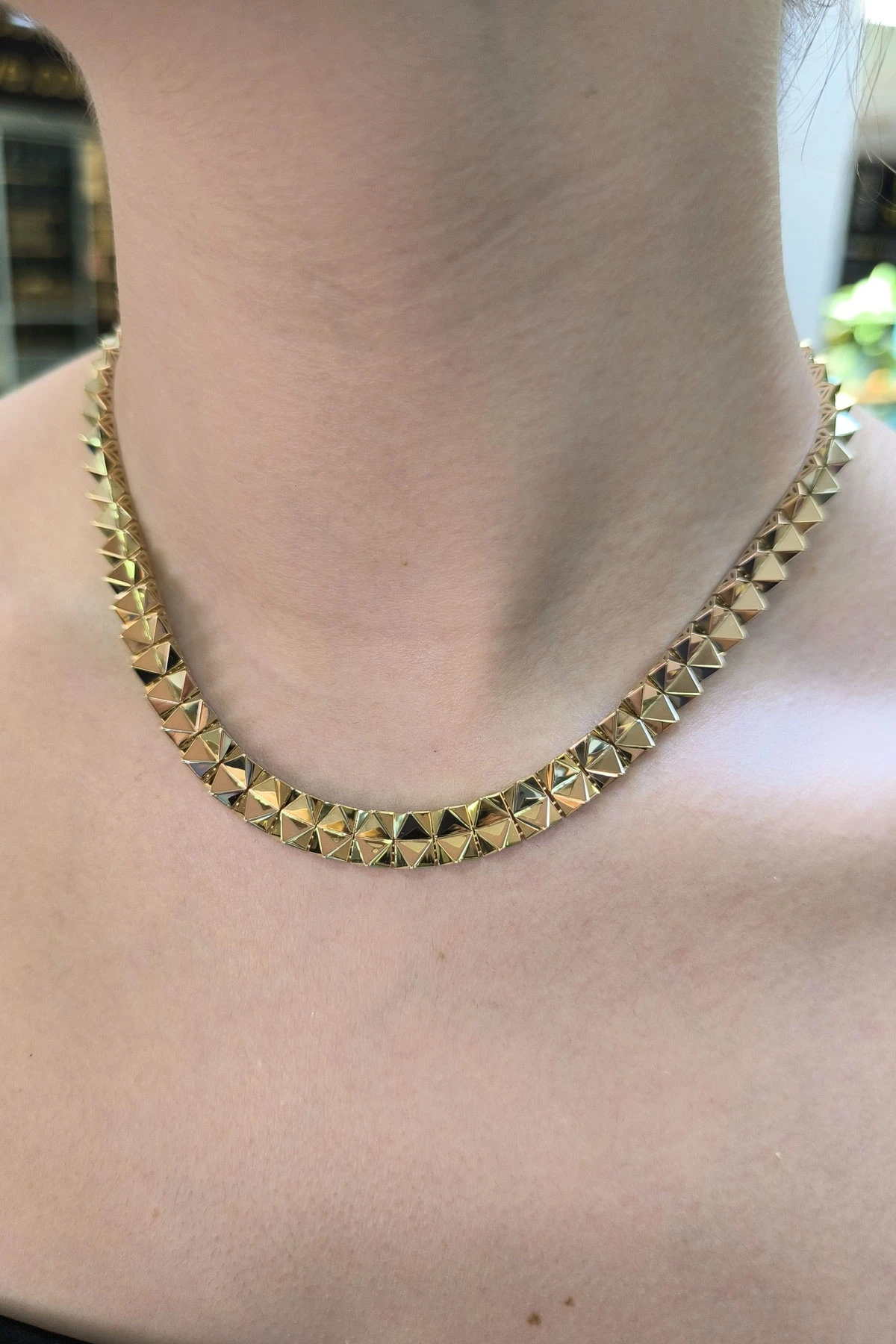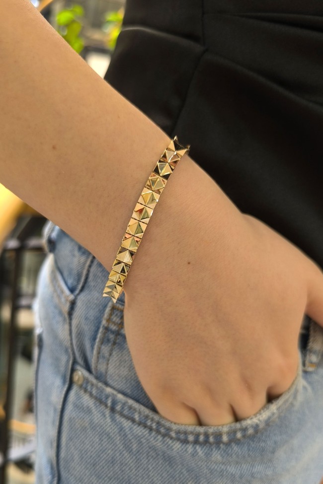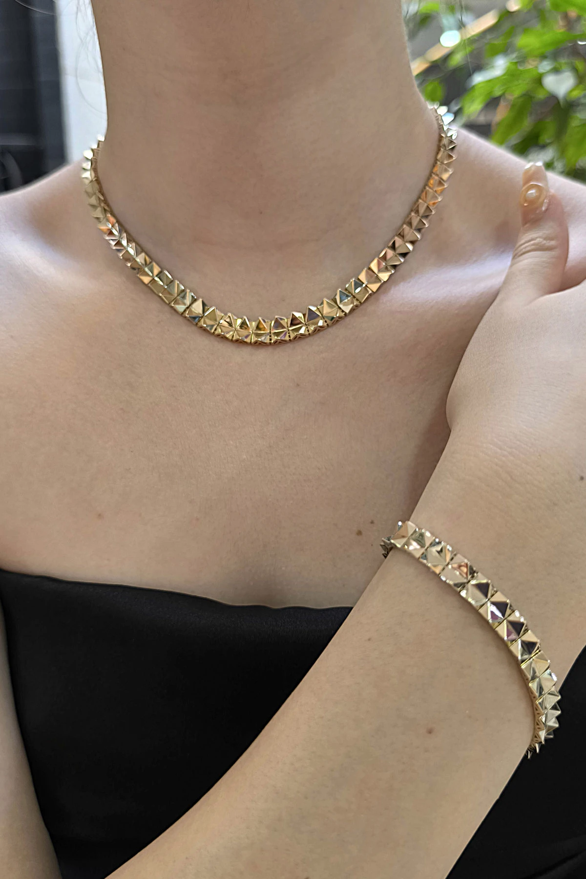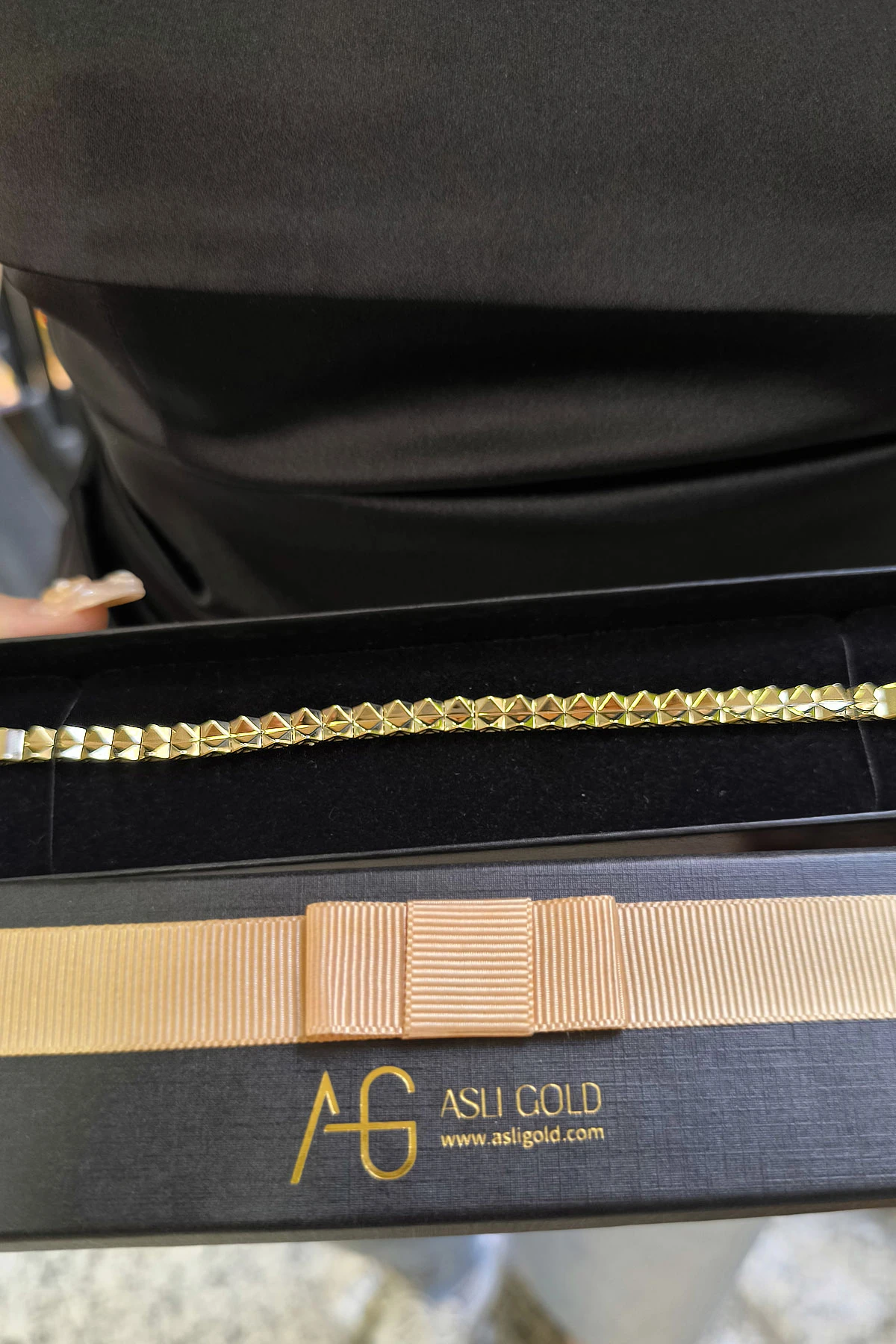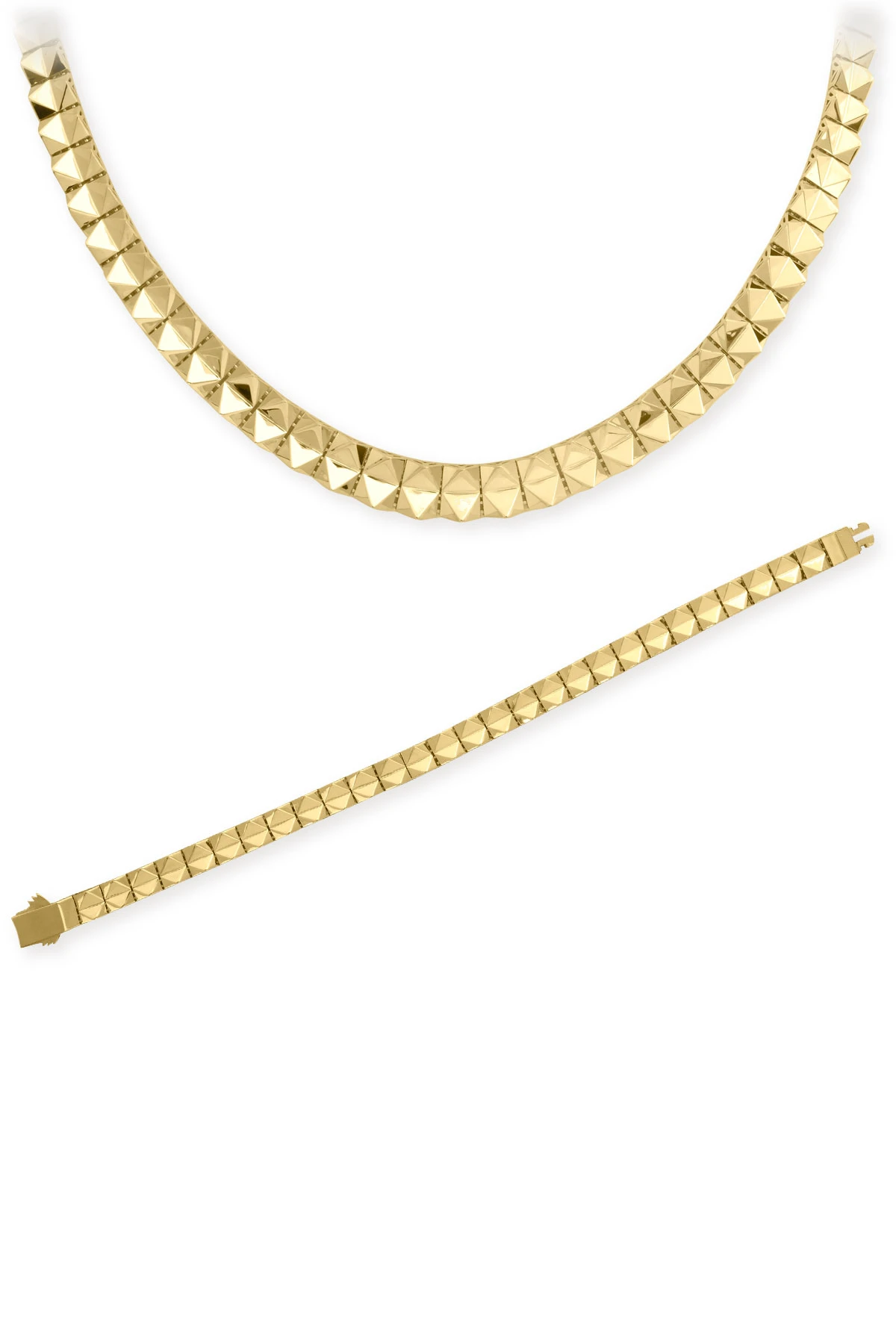 14 Ayar şık ve modern tasarım günlük kullanıma uygun taşsız ışıl ışıl özel piramit tasarımıyla iddialı bir model 37.60 gram ağırlığında altın gerdanlık ve bileklikten oluşan iki parçalı takı seti.