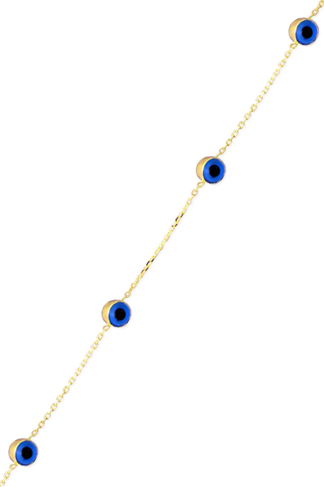 14 ayar altın nazar boncuklu kendinize yada sevdiklerinize armağan edebileceğiniz spor bileklik modeli ile zarif bir görüntü yakalayın. Model boyutu 18 cm olup 1.40 gram ağırlığındadır.