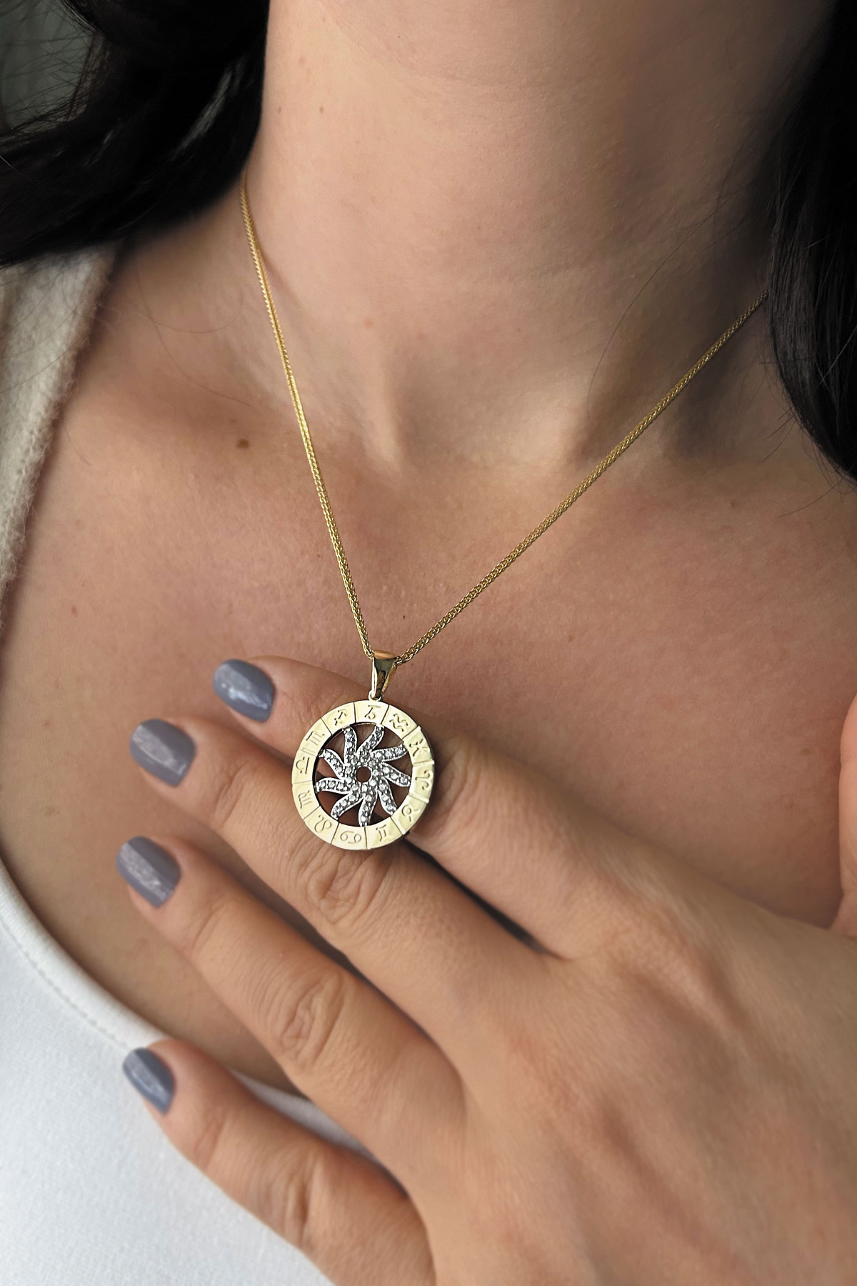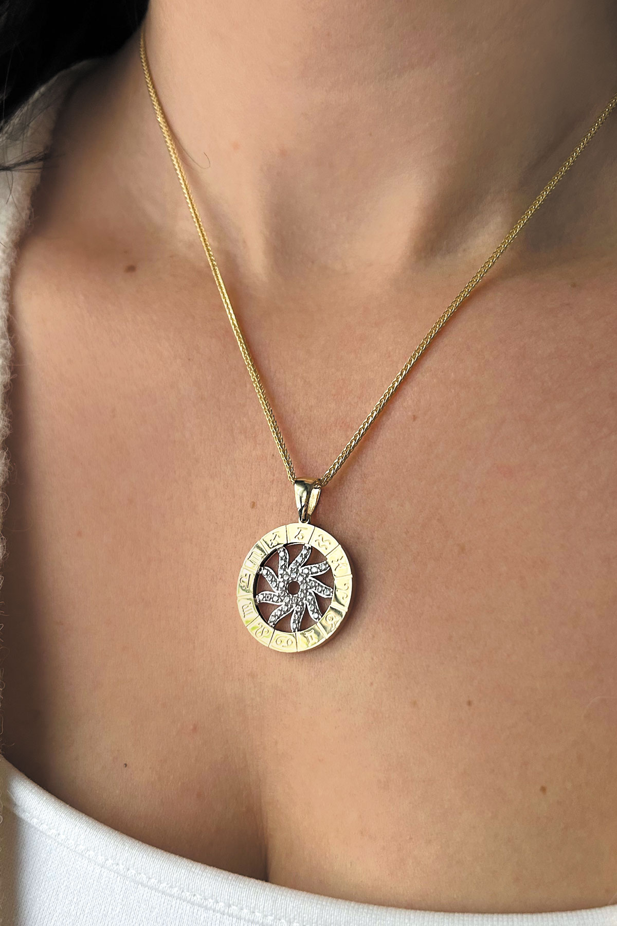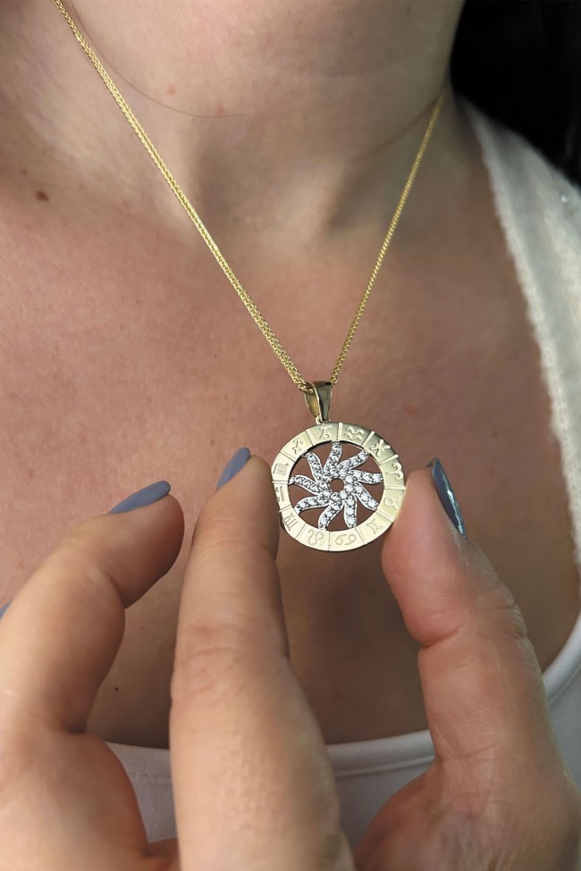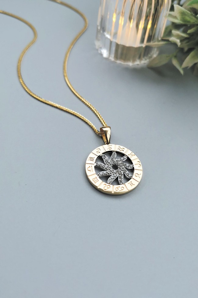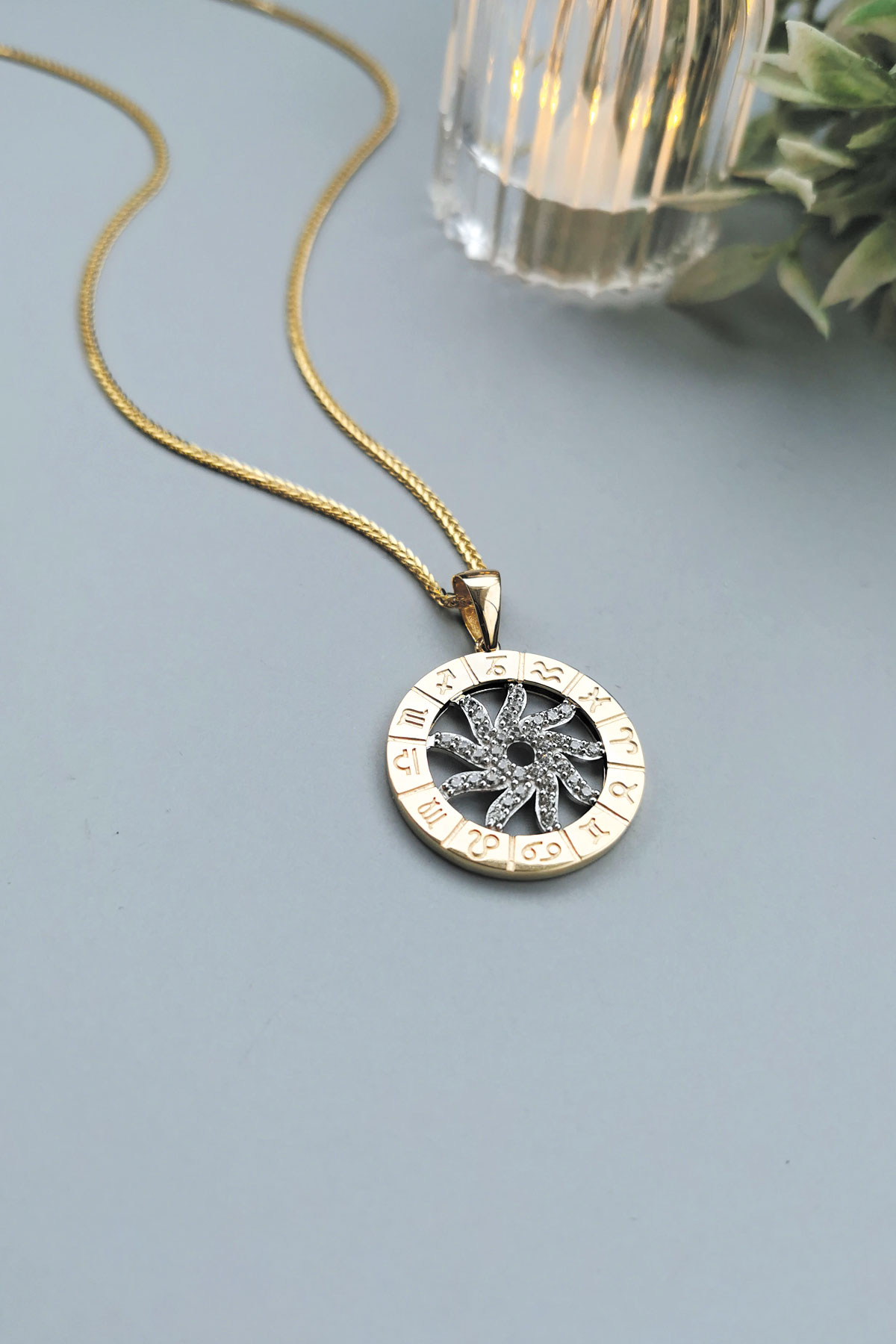 14 Ayar orta güneş kısmı hareketli, döner tasarım şık, spor ve günlük kullanıma uygun 45 cm spiga zincirli altın zirkon taşlı etrafı burçlar işli Astro kolye.