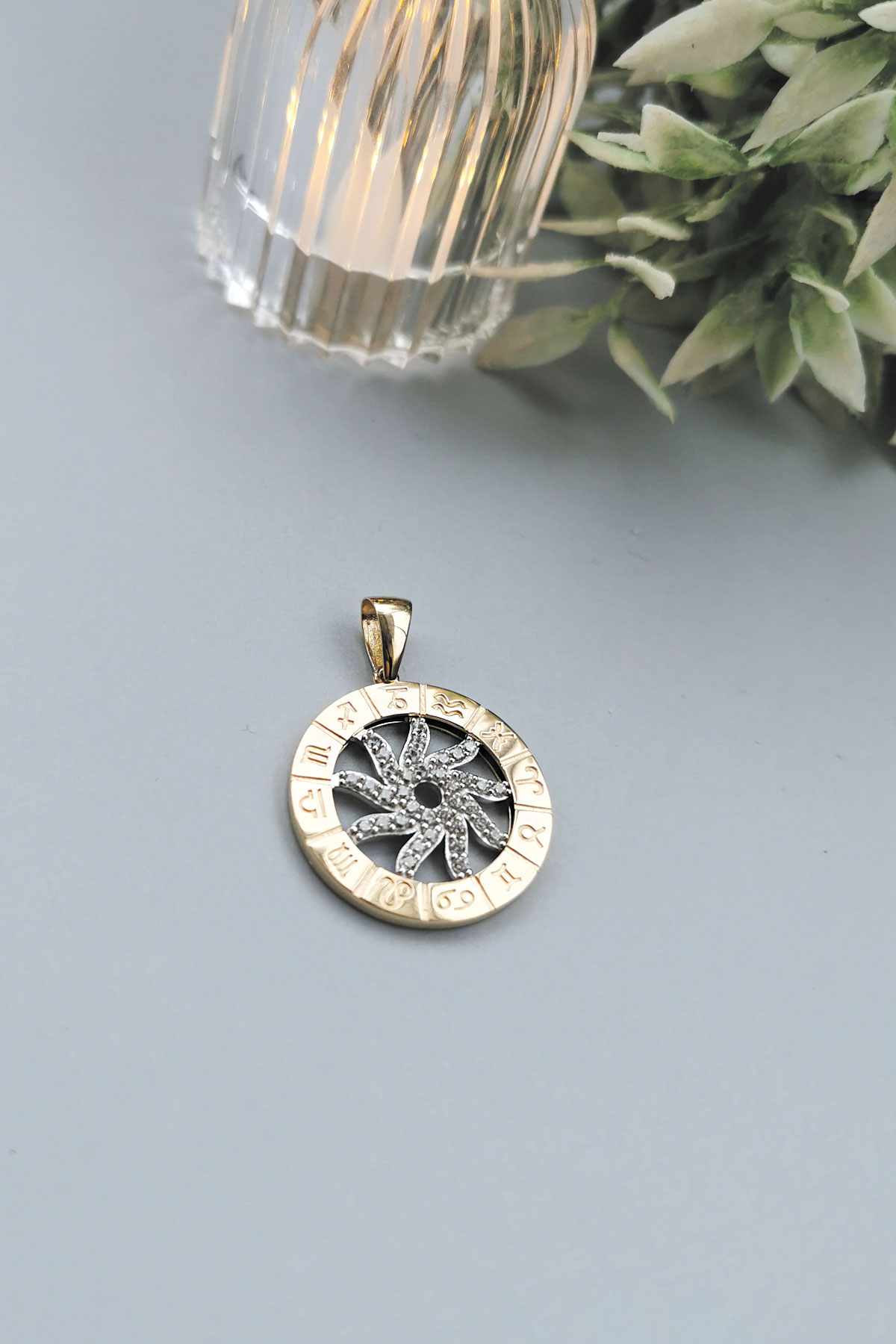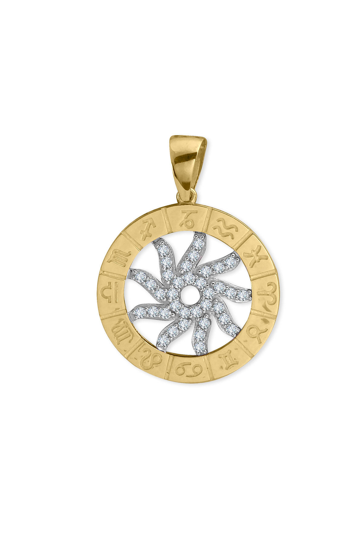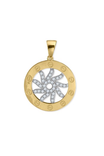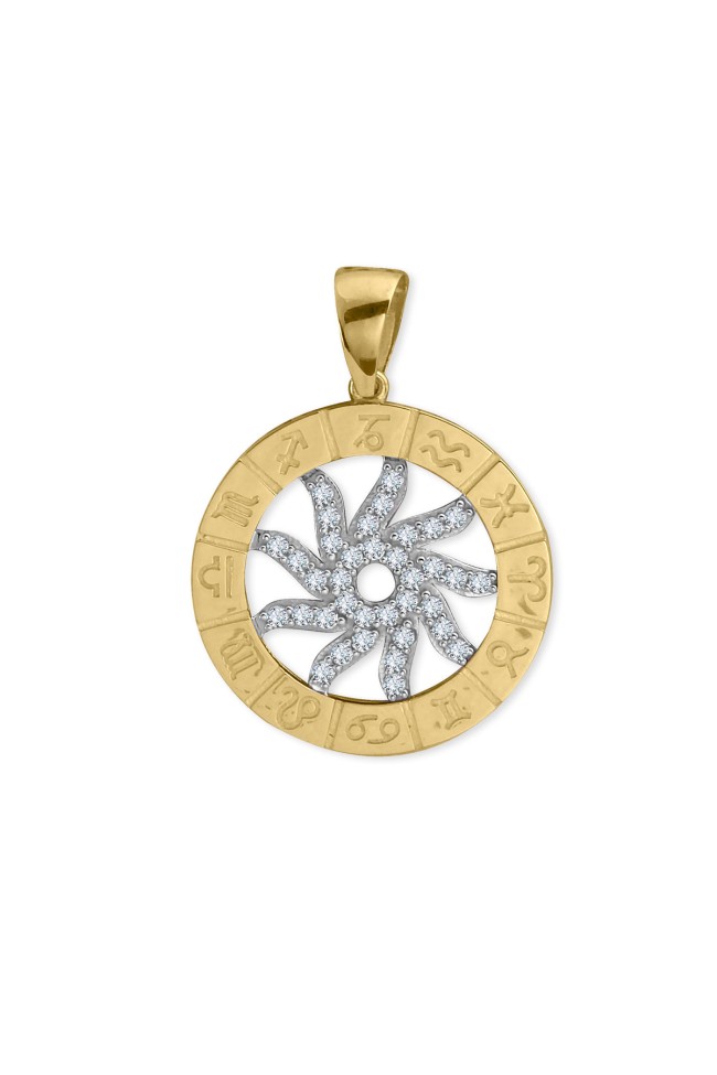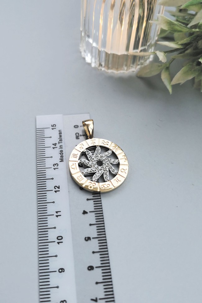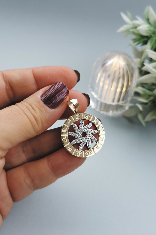 14 Ayar orta güneş kısmı hareketli, döner tasarım şık, spor ve günlük kullanıma uygun zirkon taşlı etrafı burçlar işli altın Astro kolye.