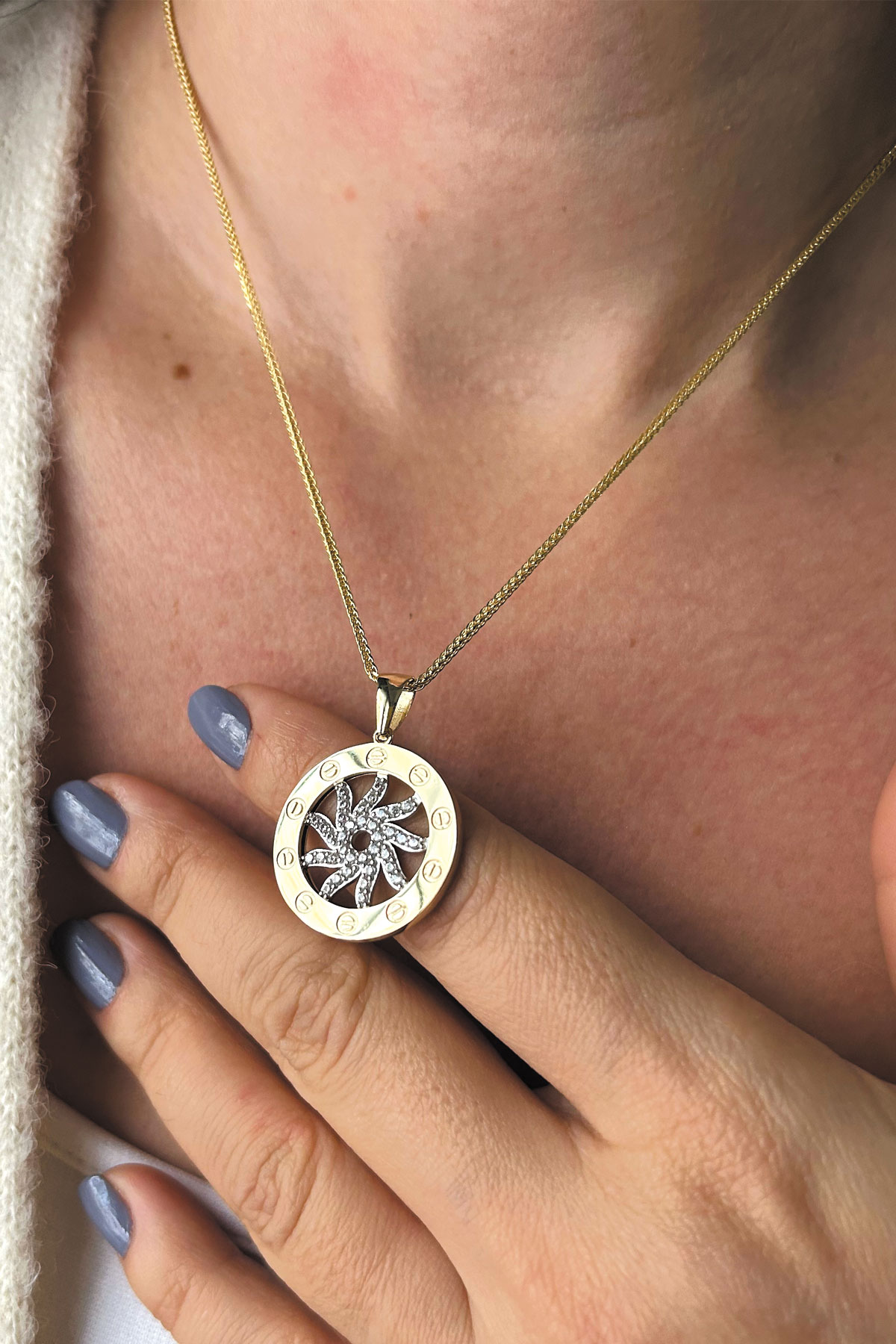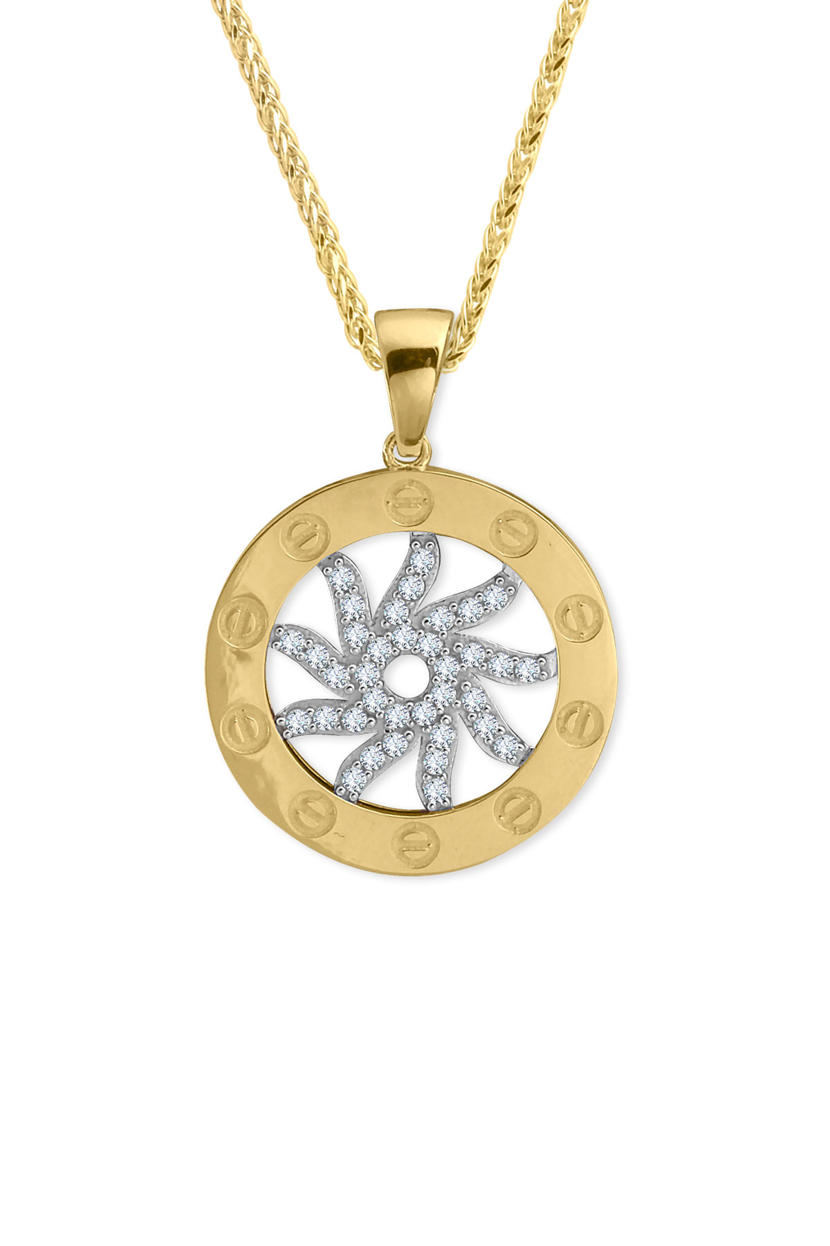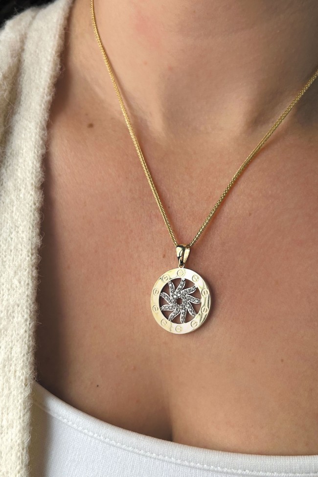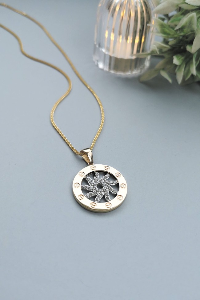 14 Ayar orta güneş kısmı hareketli, döner tasarım şık, spor ve günlük kullanıma uygun 45 cm spiga zincirli altın zirkon taşlı kolye.