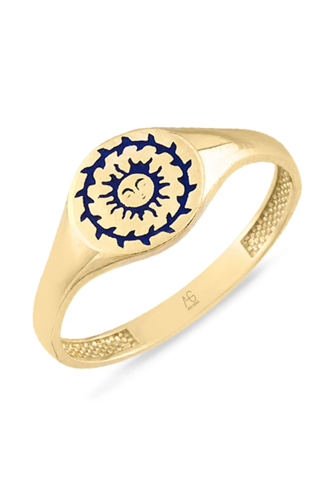 Lacivert mine detaylı güneş model 14 ayar sarı altın tasarımıyla günlük kullanıma uygun 1.65 gram ağırlığında taşsız kadın yüzük.