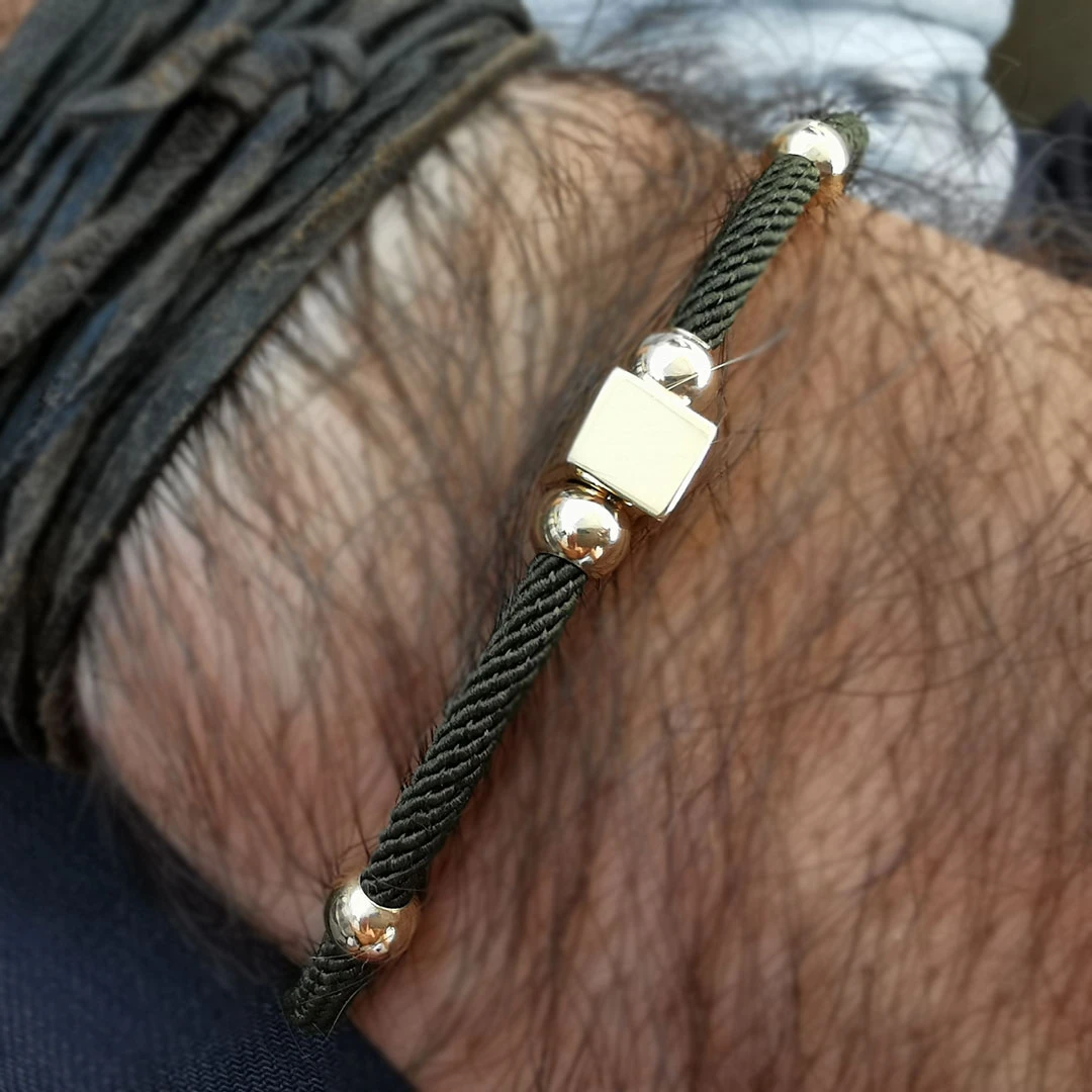 Küp ve top detaylı tasarımı ile günlük olarak da kullanabileceğiniz, özel günlerinde sevdiklerinize şık bir hediye seçeneği olacak 1.20 gr ağırlığında 14 ayar altın taşsız haki yeşil özel örgü ip detaylı unisex kullanıma uygun spor bileklik.