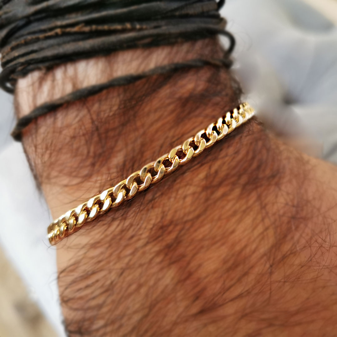 19.5 Cm boyunda hem spor hem fantazi tasarımı ile günlük olarak da kullanabileceğiniz 14 ayar 4.55 gr ağırlığında 14 ayar altın dörde bir ince gurmet erkek bileklik.
