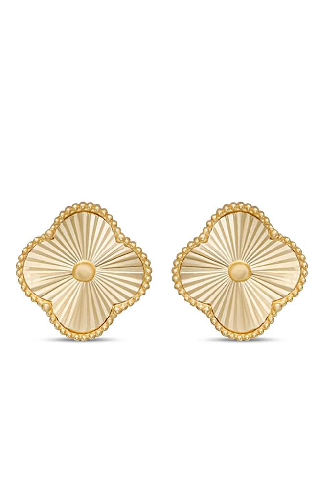 14 Ayar taşsız kalem işlemeli 1.3 Cm boyutunda modern tasarımı ile spor duruşa da sahip günlük kullanıma uygun 4.70 gram ağırlığında tasarım model altın yonca küpe.