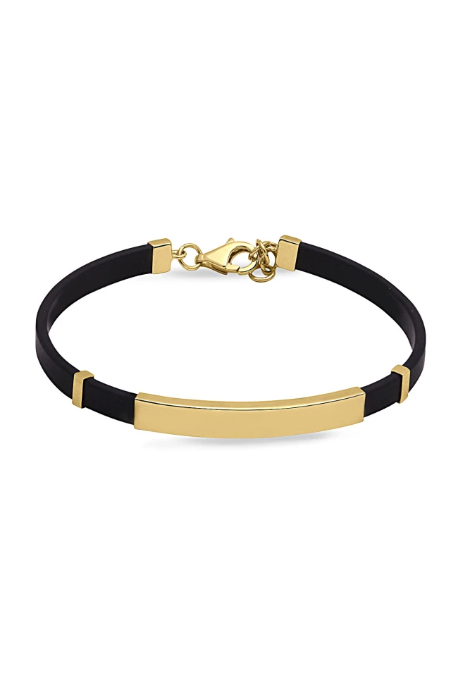 Kauçuk kombinasyonlu isim yazı alanı olan künye detay tasarımı ile günlük olarak da kullanabileceğiniz, özel günlerinde sevdiklerinize şık bir hediye seçeneği olacak 2.35 gr ağırlığında 14 ayar altın erkek bileklik.