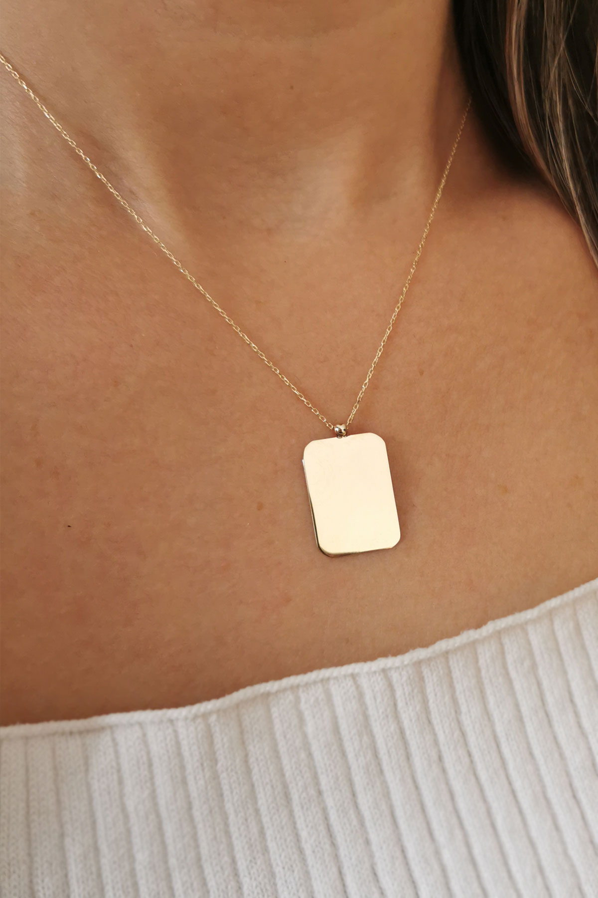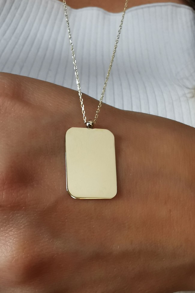 En 1.5 cm boy 2 cm boyutunda dikdörtgen künye kolye ile ışıltınıza ve günlük stilinize renk katacak, farklı kolyelerinizle kombin olarak kullanmaya bayılacaksınız.