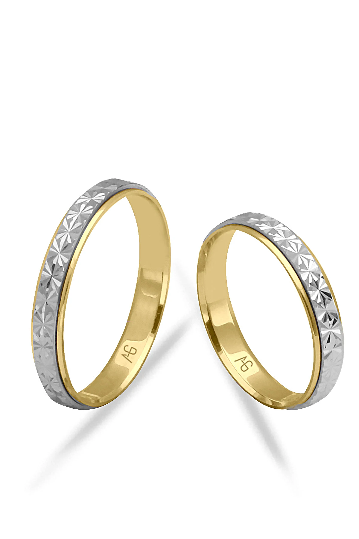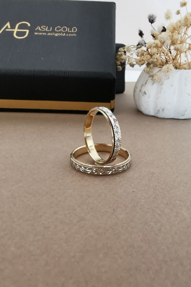 14 Ayar 5.00 gram ağırlığında çift renk ışıltılı işleme detaylı şık ve günlük kullanımda sizi oldukça rahat ettirecek unisex kullanıma uygun, modern bir tasarıma sahip evlilik, nişan alyansı olarak da  tercih edebileceğiniz altın çift alyans.