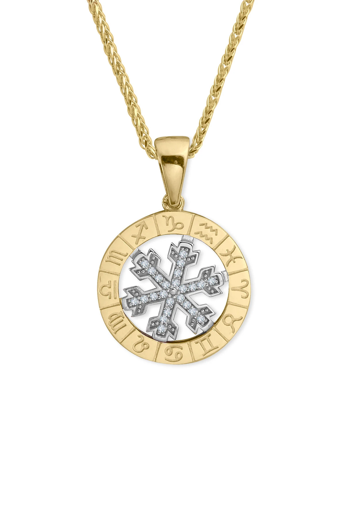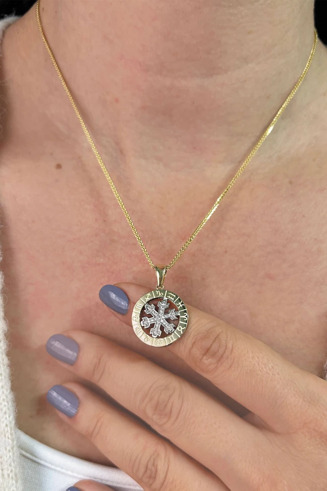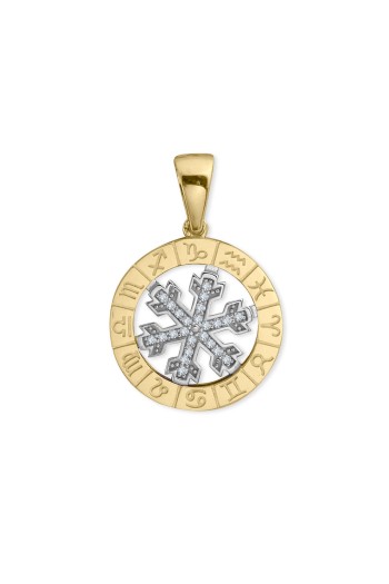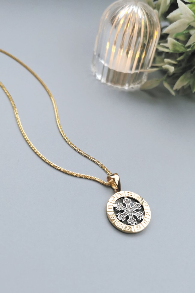 14 Ayar orta kar tanesi kısmı hareketli, döner tasarım şık, spor ve günlük kullanıma uygun 45 cm spiga zincirli altın zirkon taşlı etrafı burçlar işli Astro kolye.