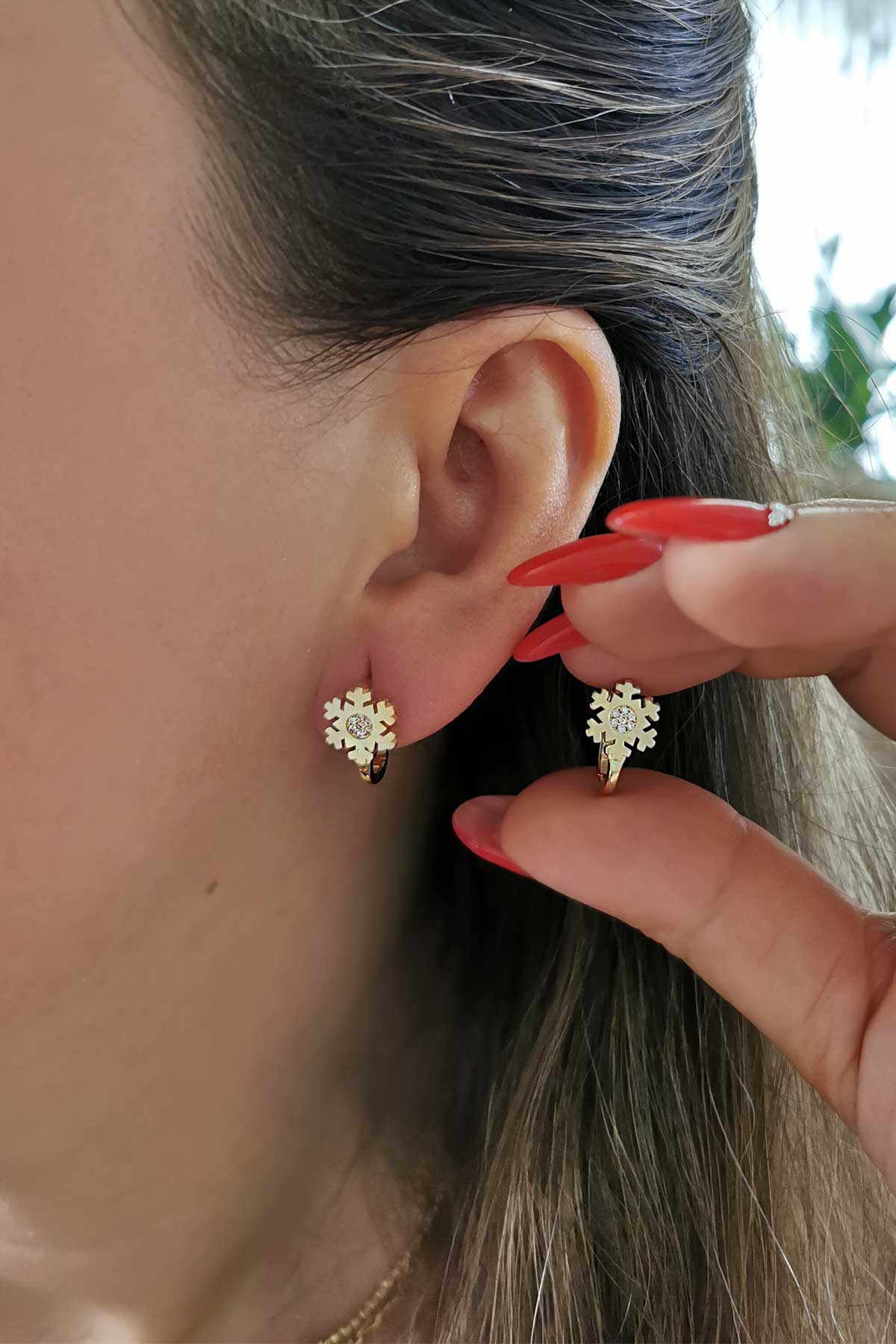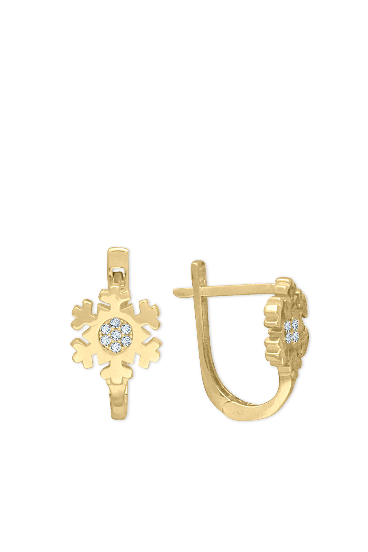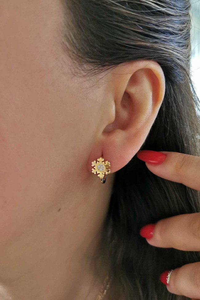 14 Ayar zirkon ortası taşlı model kar tanesi tasarım ve şık duruşa sahip günlük kullanıma uygun 2.80 gram ağırlığında altın klipsli C küpe..