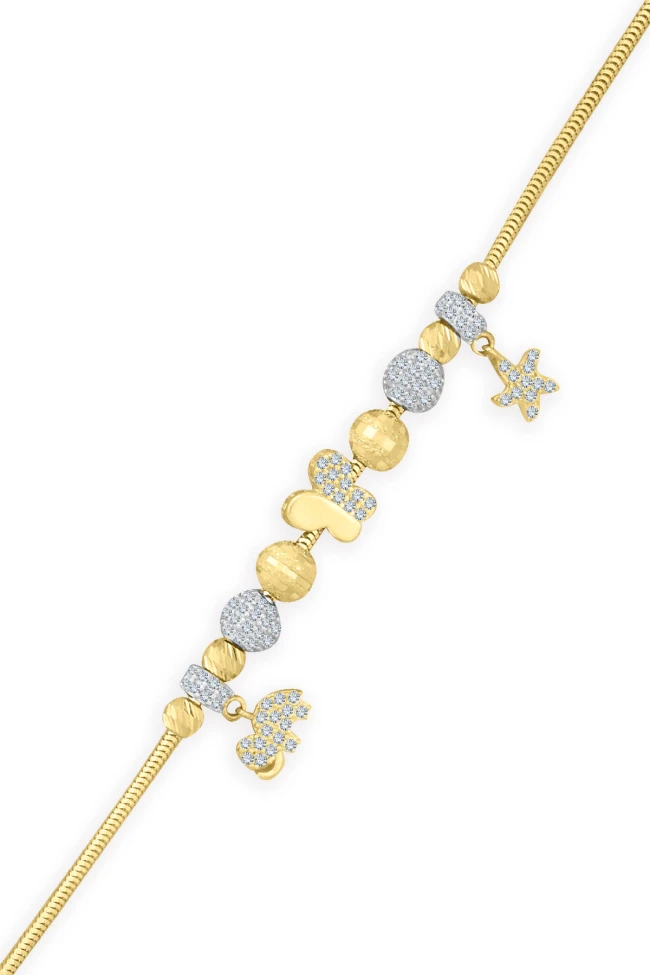 14 Ayar 8.30 gram ağırlığında 19 cm boyunda tüm sezon gömlek ve basic tişörlerinizle severek kullanacağınız, spor giyim tarzınıza da muhteşem uyum sağlayacak ışıl ışıl atın kelebek ve fil detaylı charm bileklik.