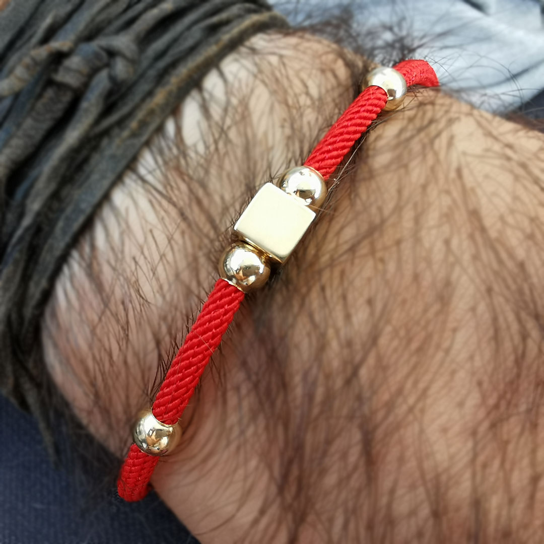 Küp ve top detaylı tasarımı ile günlük olarak da kullanabileceğiniz, özel günlerinde sevdiklerinize şık bir hediye seçeneği olacak 1.20 gr ağırlığında 14 ayar altın taşsız kırmızı özel örgü ip detaylı unisex kullanıma uygun spor bileklik.