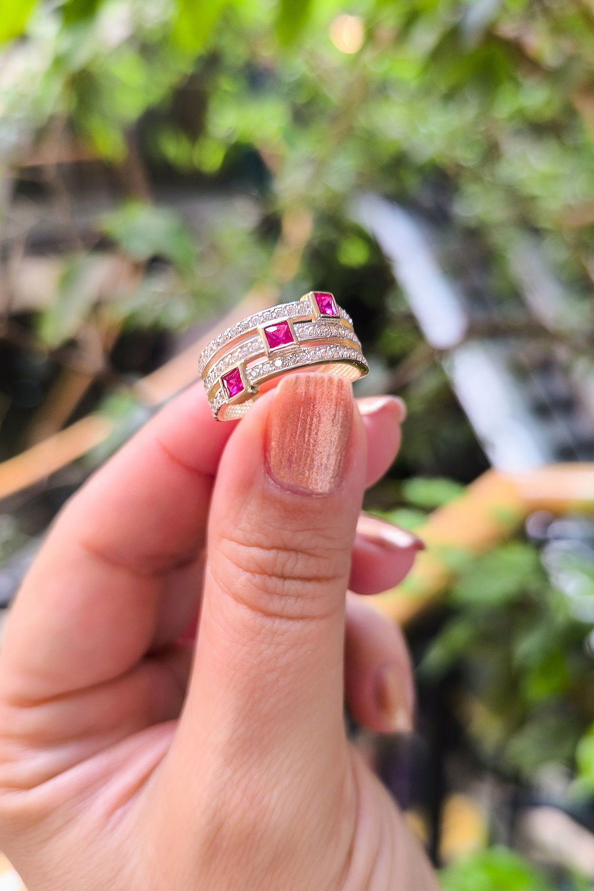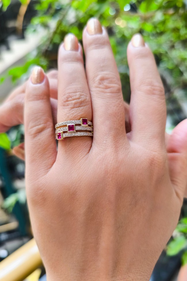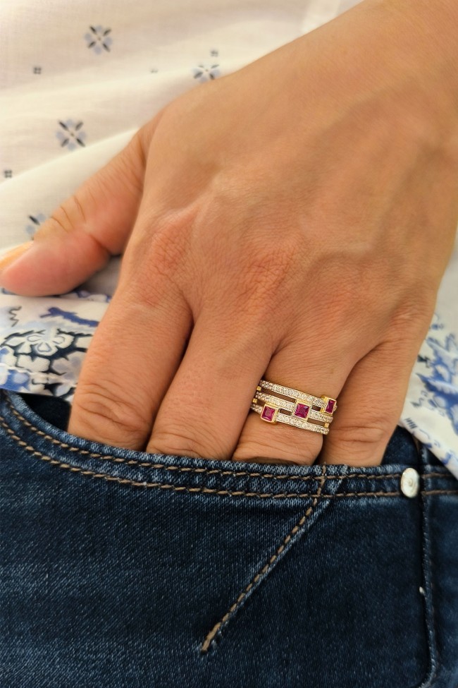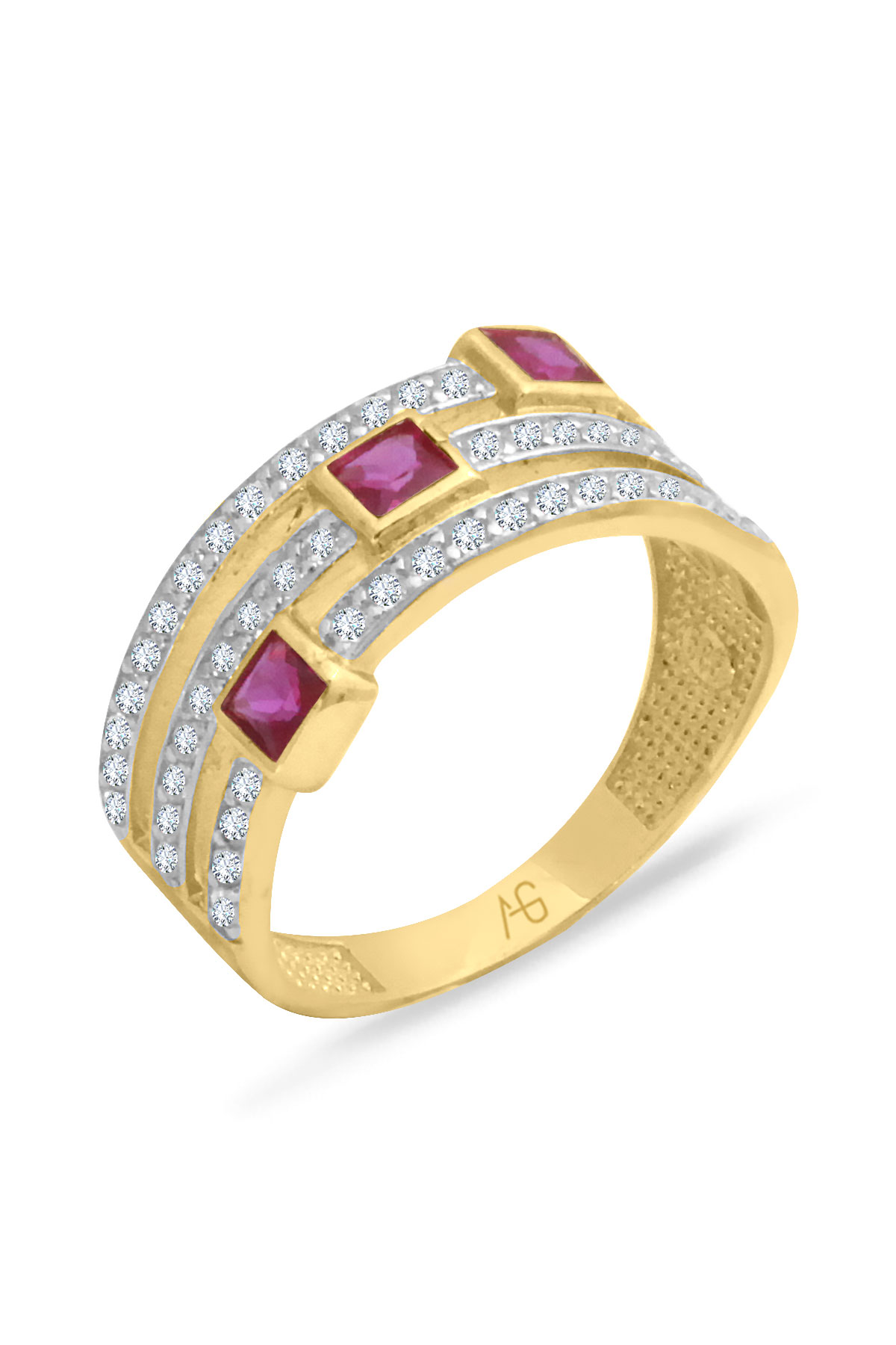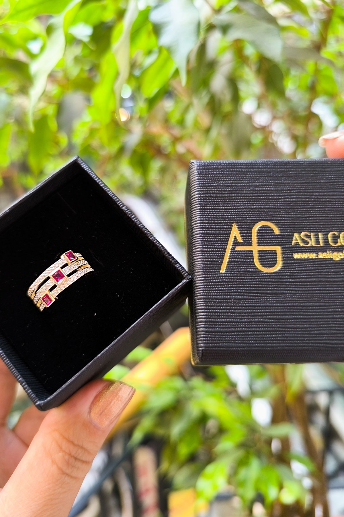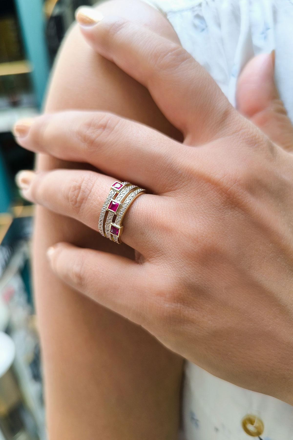 14 Ayar şık ve modern tasarım günlük kullanıma uygun renkli zirkon yakut taşlı ışıl ışıl özel üç sıralı tasarımıyla havalı bir model 3.45 gram ağırlığında altın kadın yüzük.