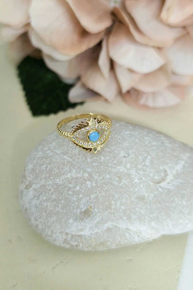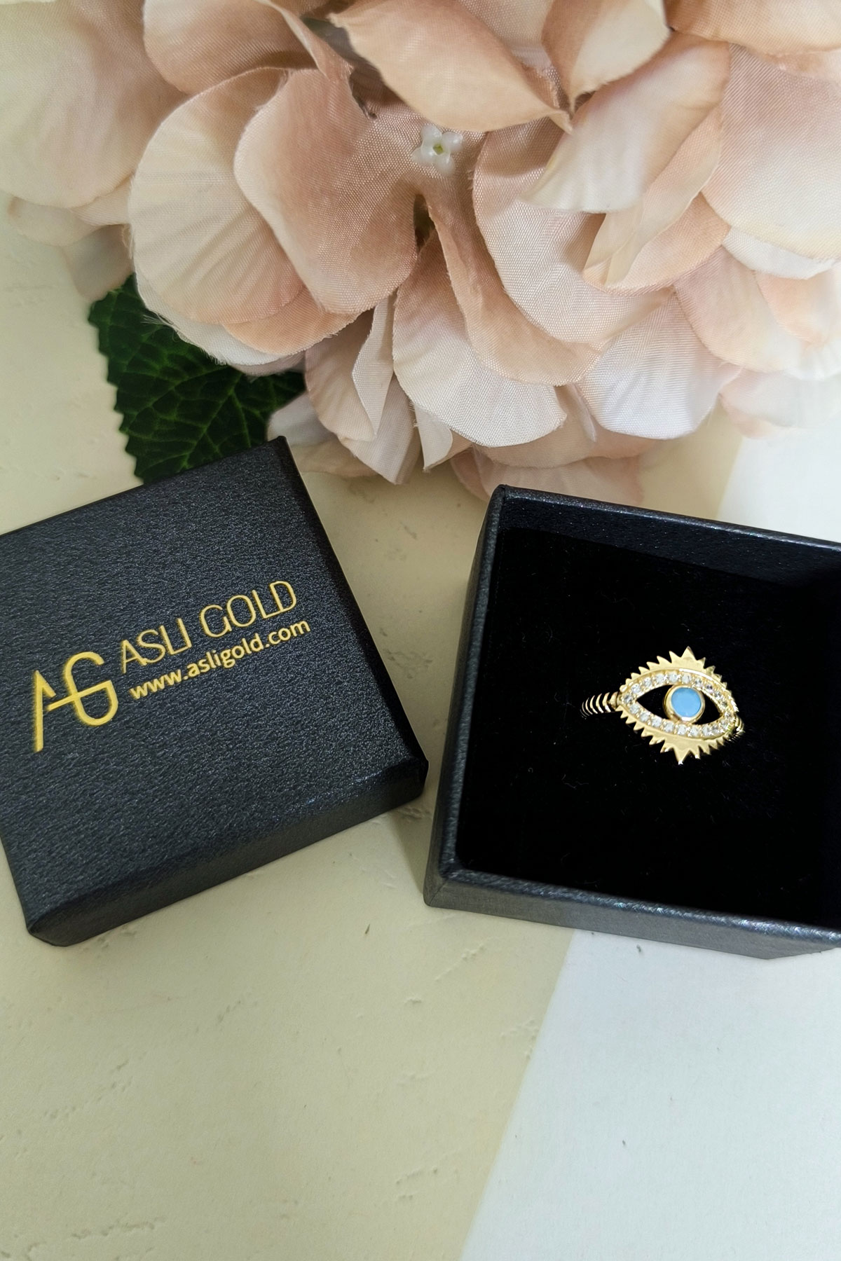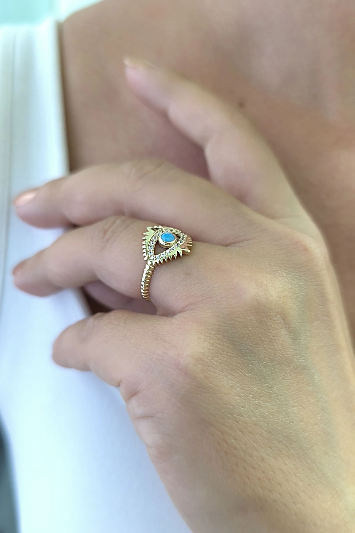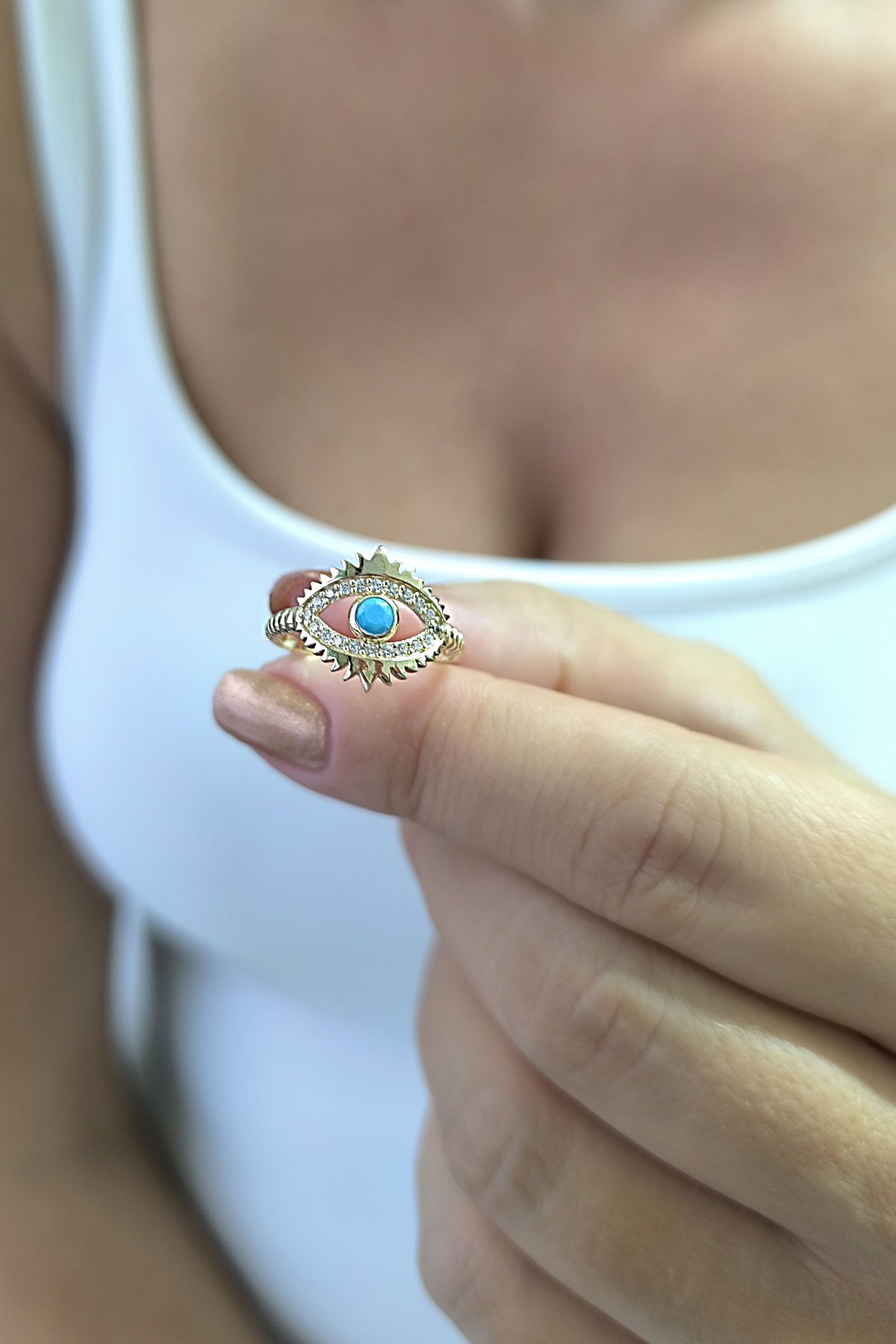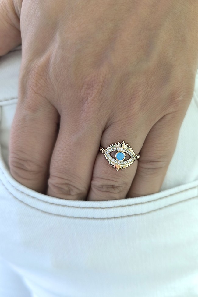 14 Ayar spor duruşa sahip göz tasarımına eşlik eden kirpik modeli ile günlük kullanıma oldukça uygun, sevdiklerinize yada kendinize armağan olarak tercih edebileceğiniz modern tasarım 2.15 gram ağırlığında farklı model yüzüklerinizle bir arada da kullanabileceğiniz altın nazar yüzük.