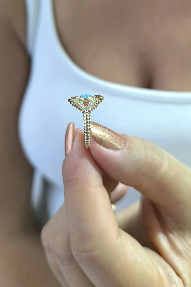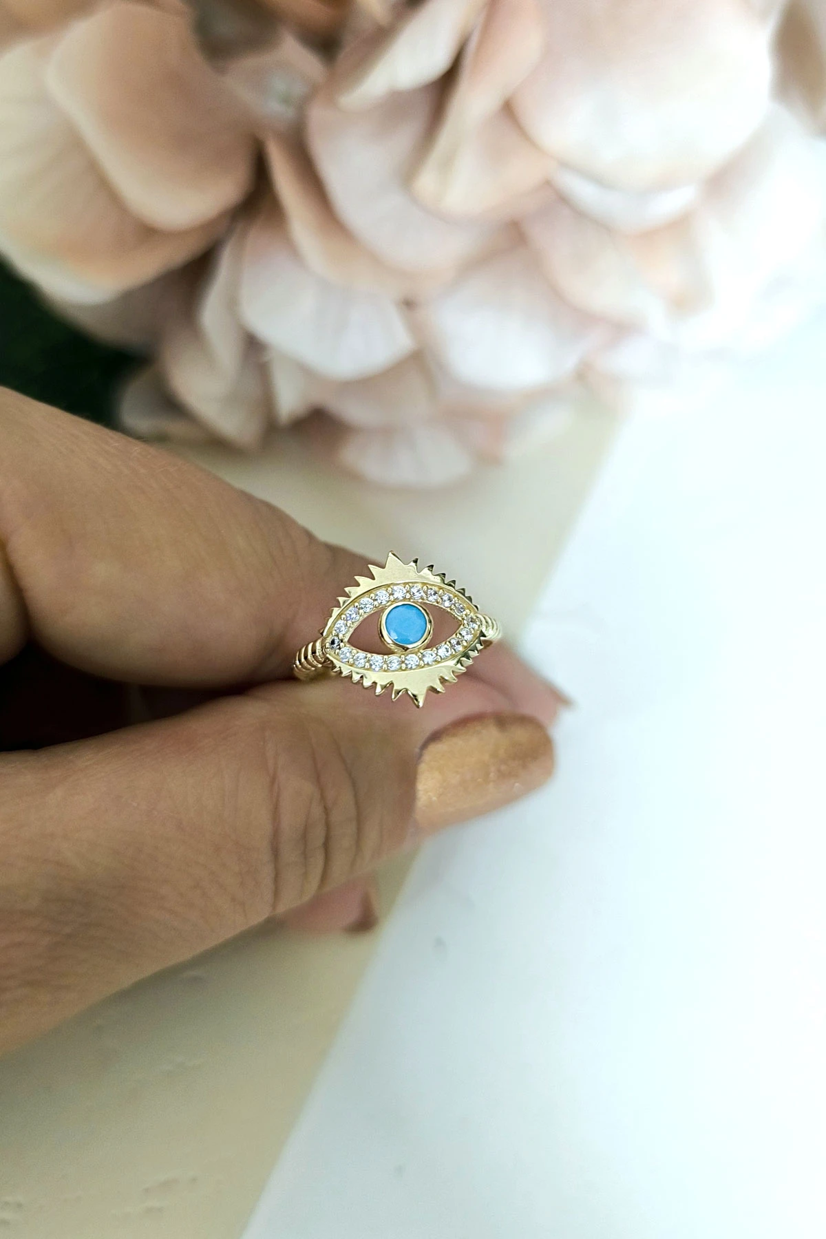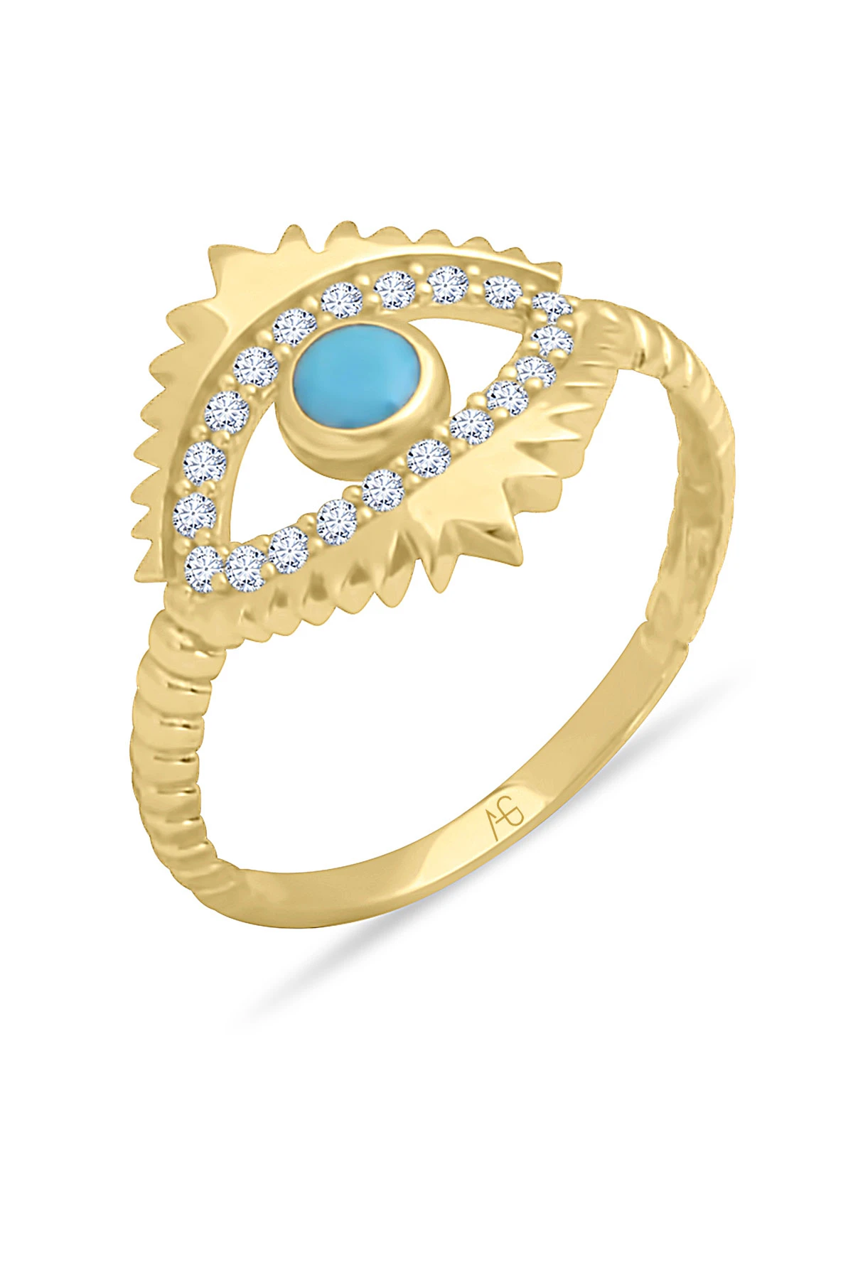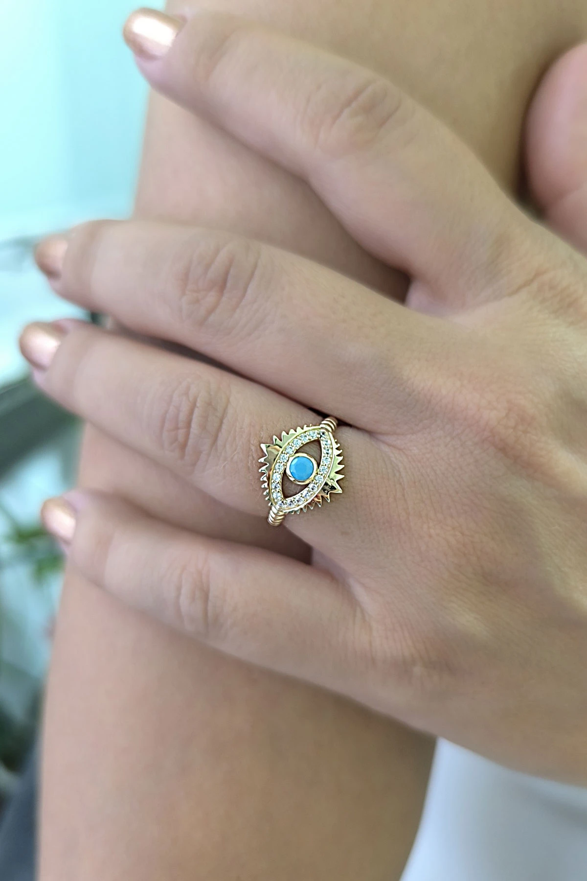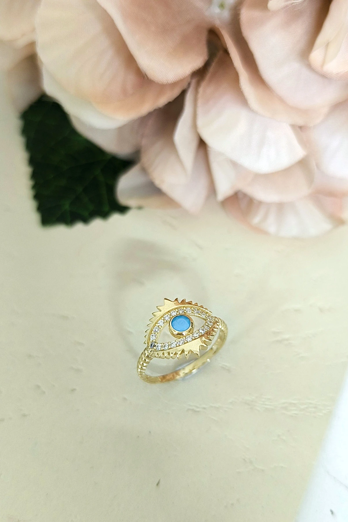 14 Ayar spor duruşa sahip göz tasarımına eşlik eden kirpik modeli ile günlük kullanıma oldukça uygun, sevdiklerinize yada kendinize armağan olarak tercih edebileceğiniz modern tasarım 2.15 gram ağırlığında farklı model yüzüklerinizle bir arada da kullanabileceğiniz altın nazar yüzük.