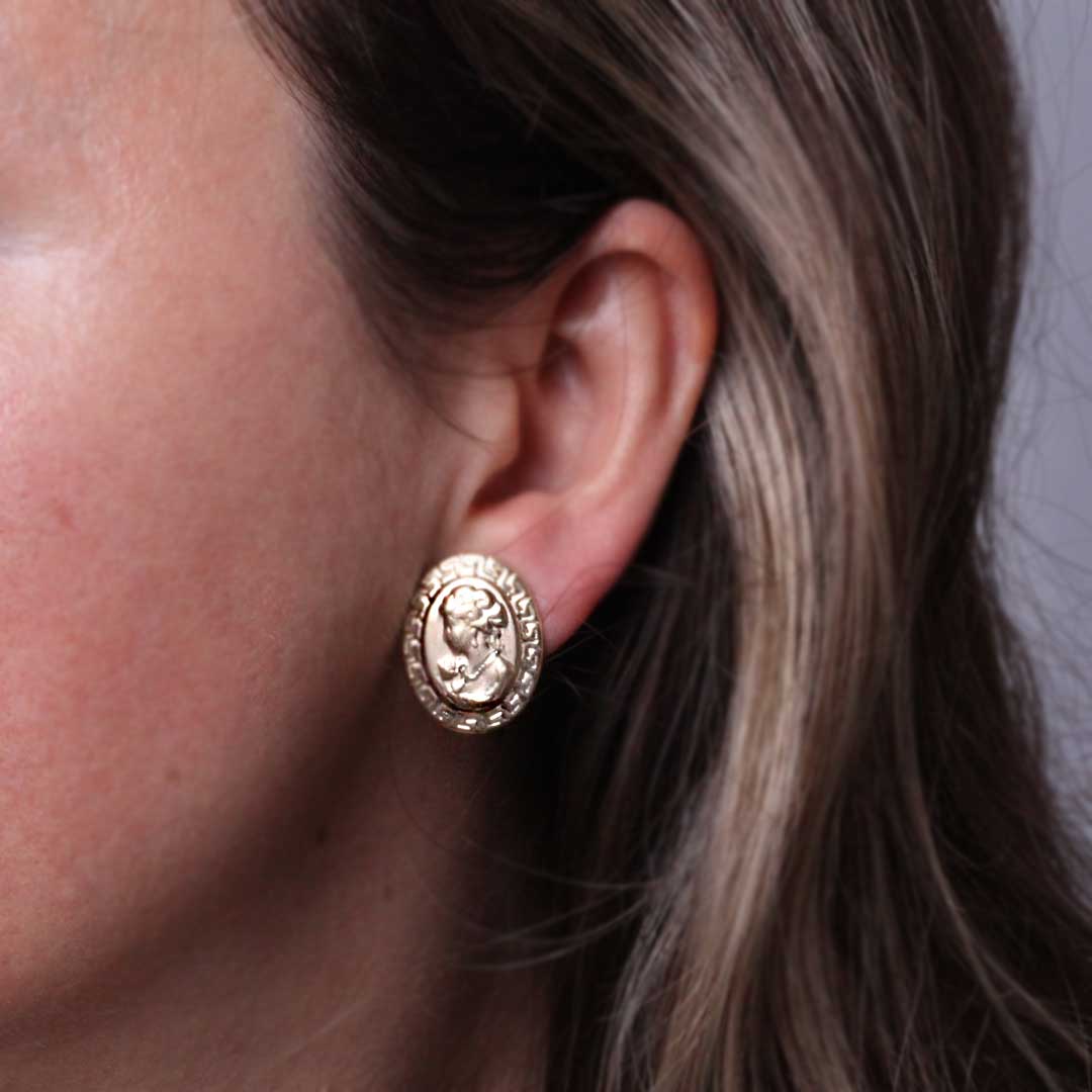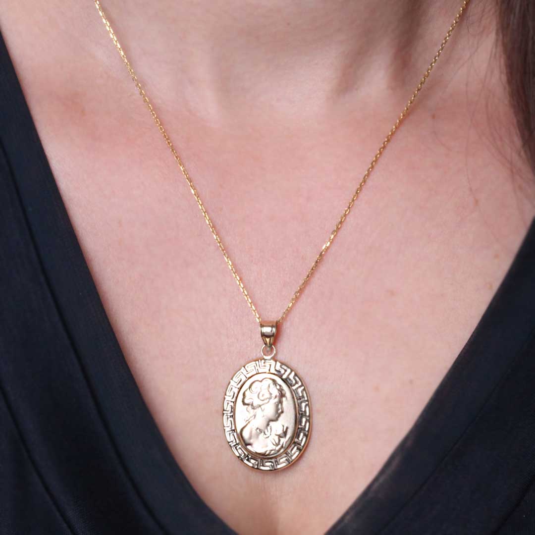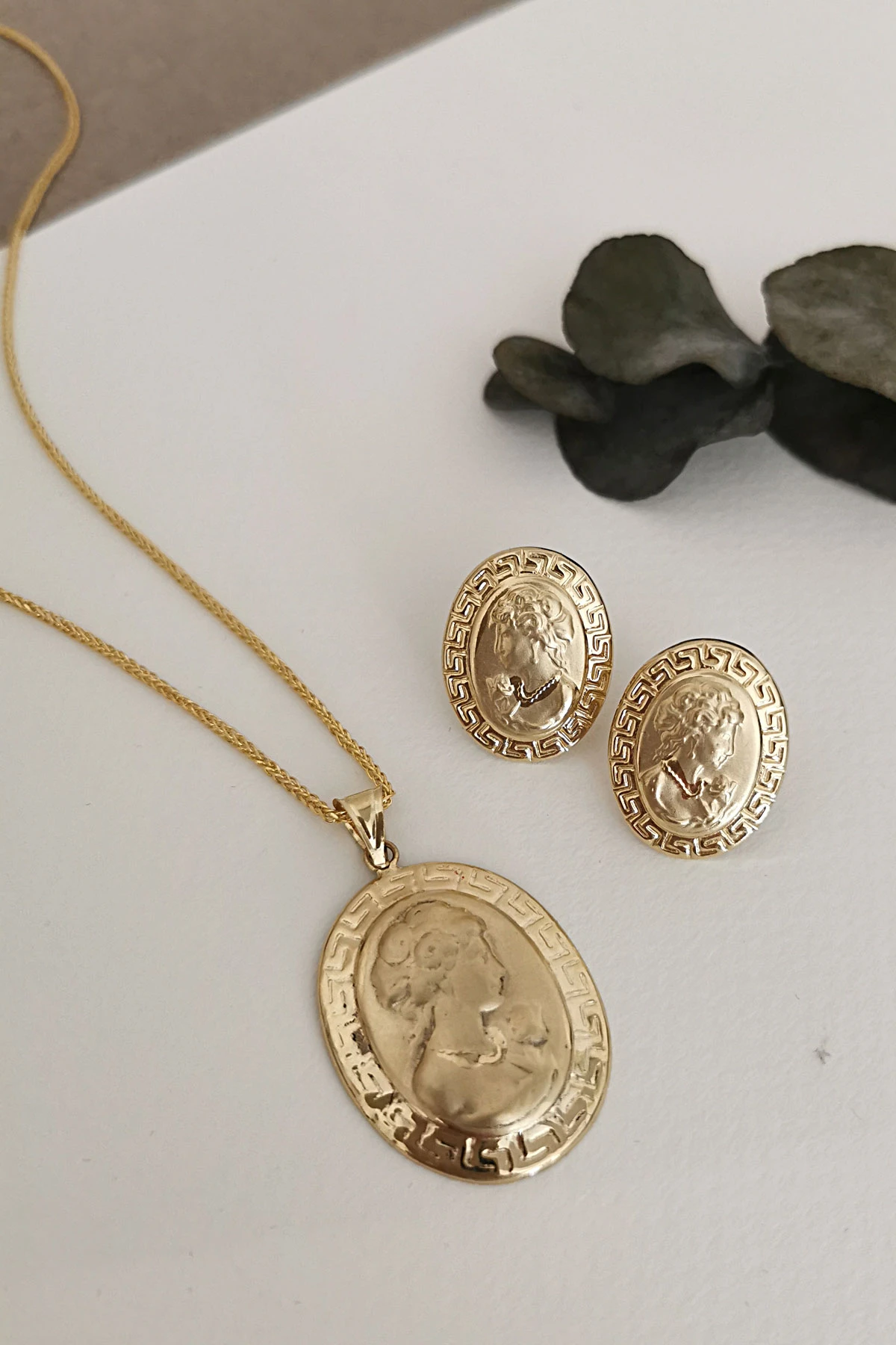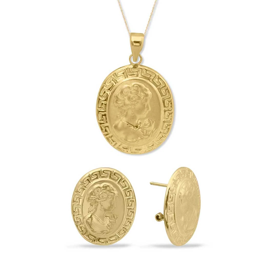14 Ayar sarı altın farklı tasarımlara düşkün kadınların severek kullanacakları şık ve elegan duruşa sahip günlük kullanıma uygun 8.30 gram ağırlığında altın Camei kolye küpe takım.