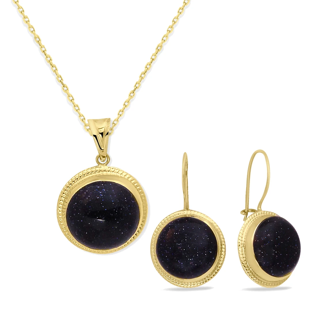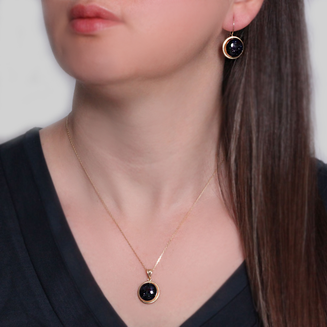14 Ayar nostalji tasarımına eşlik eden yuvarlak simli siyah taş detaylı şık ve ışıltılı tasarımlara düşkün kadınların severek kullanacakları elegan duruşa sahip günlük kullanıma uygun 8.55 gram ağırlığında altın kolye küpe takım.