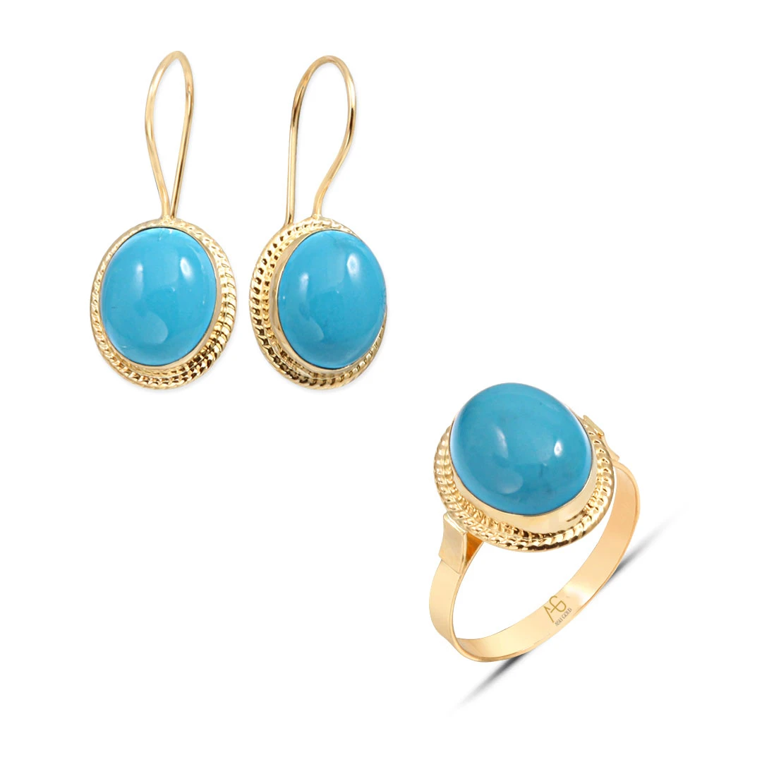 5,60 Gram 14 Ayar Altın Orta Boy Firuze Taşlı Yüzük Ve Küpeden Oluşan İkili Nostalji Tasarım Takım. Kendinize yada sevdiklerinize armağan edebileceğiniz bu şık eve trend model tasarım her zaman severek kullanılacak.