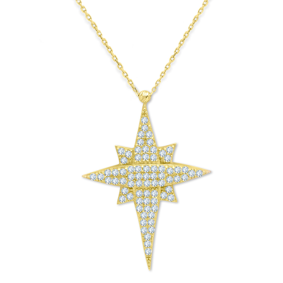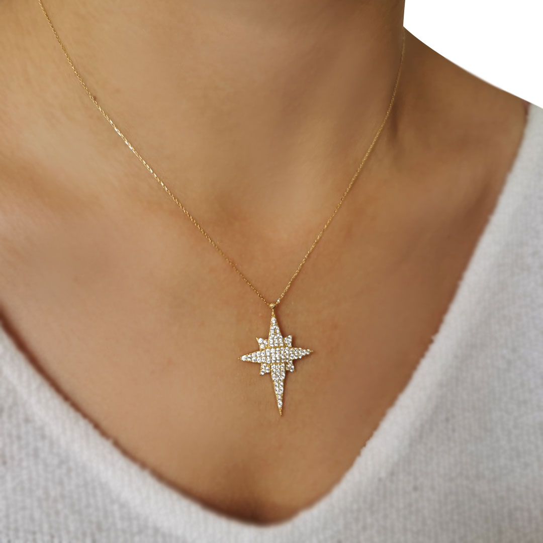 45 Cm zincirli 3.30 gr. 3,7 cm boyutunda zirkon taşlı model 14 ayar altın kutup yıldızı kolye.